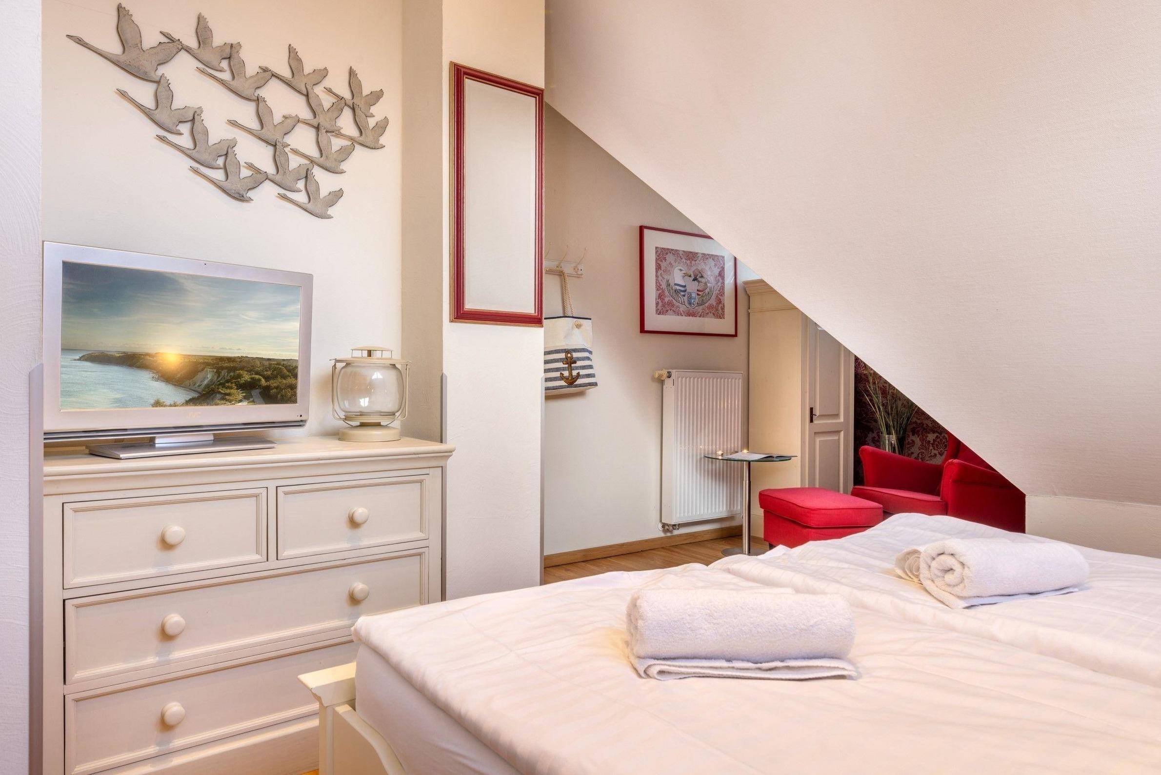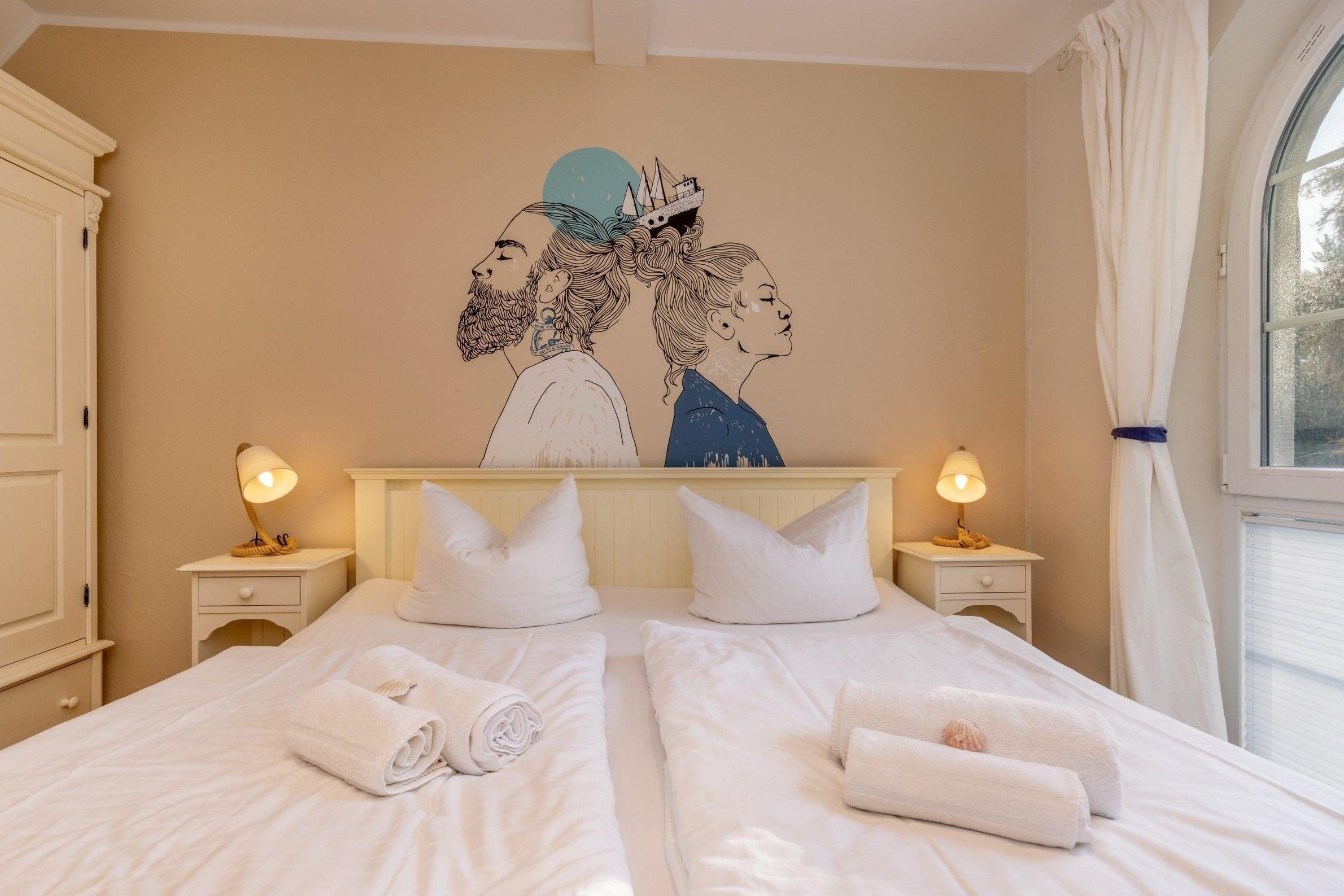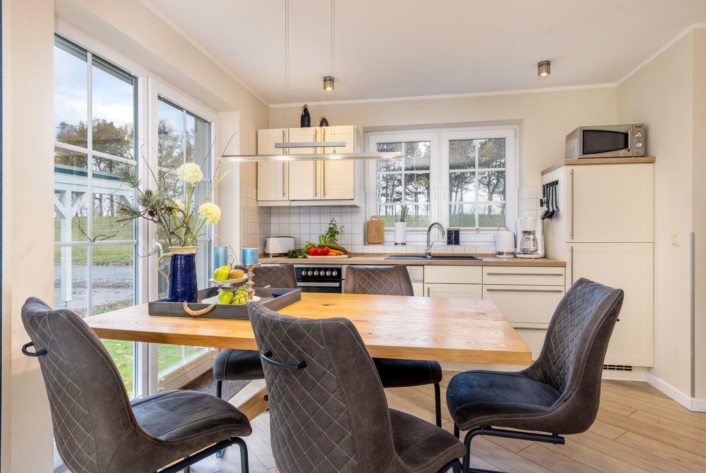 Die Ferienwohnung bietet einen komfortablen Rückzugsort mit drei durchdacht gestalteten Schlafzimmern, darunter zwei Doppelbetten und ein Einzelbett. Die offene Küche ist vollständig ausgestattet mit modernen Geräten, einschließlich Geschirrspüler, Elektro-/Gasherd, Backofen, Mikrowelle und Kühlschrank. Der Essbereich mit Esstisch und ausreichend Geschirr sowie Besteck lädt zu gemeinsamen Mahlzeiten ein. Zwei Badezimmer, eines davon mit bodengleicher Dusche, gewährleisten Komfort für alle Gäste.