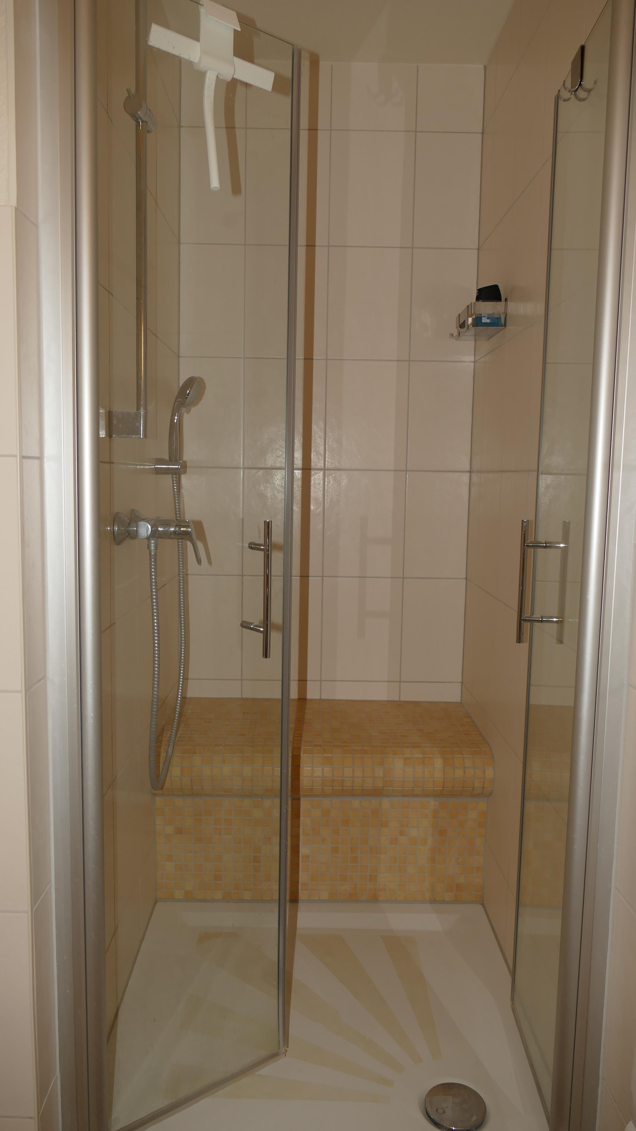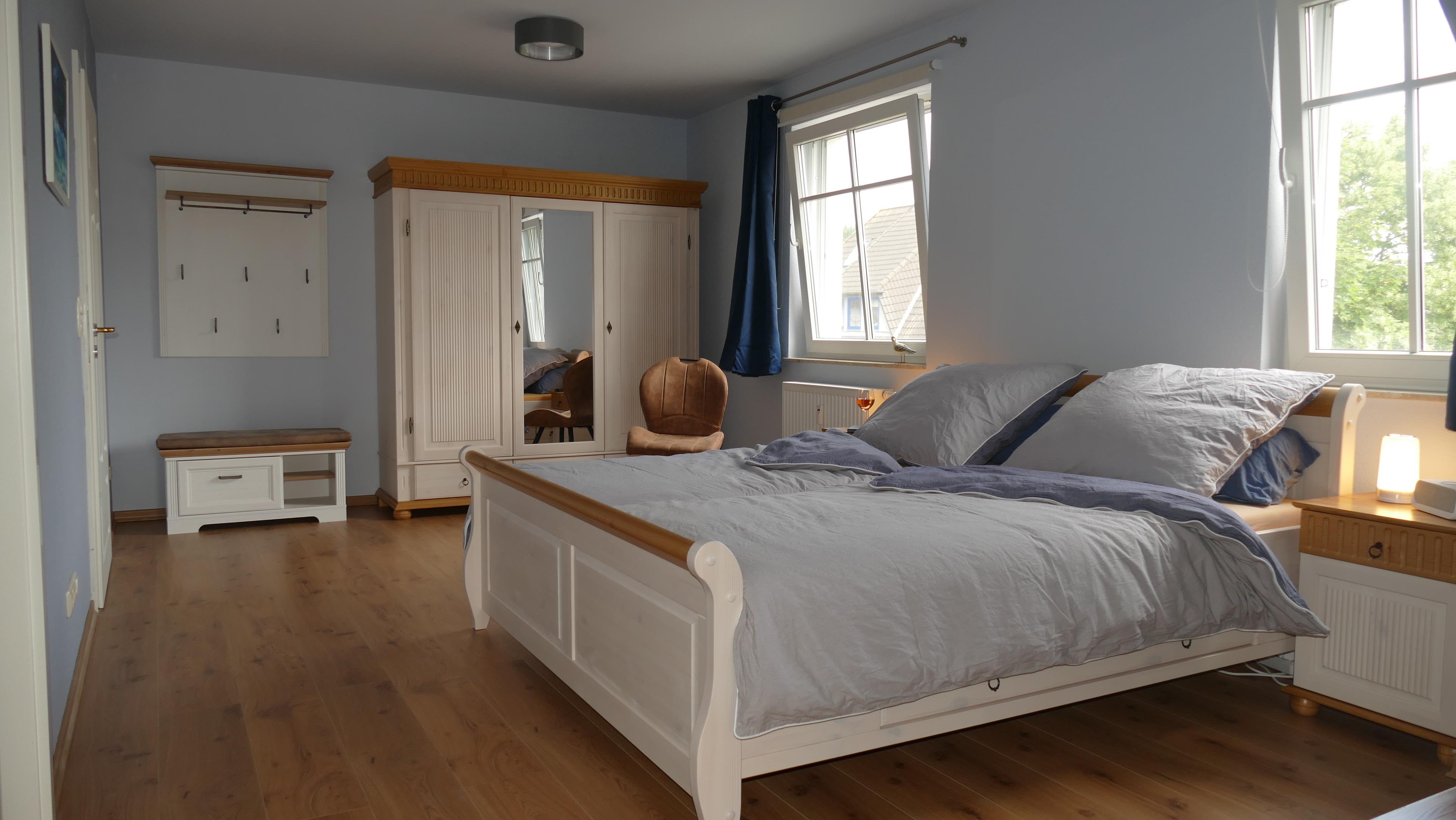 Über einen kleinen Flur mit gut ausgestatteter Pantry-Küche gelangt man in das geräumige Schlafzimmer mit Doppelbett (180-200cm) und Smart-TV. Im Badezimmer sind eine Glasdusche mit gefliester Sitzbank, Handtuchheizkörper, Föhn, WC und Waschbecken zu finden. Im Wohnzimmer befindet sich ein großes Sofa, ein ausziehbarer Esstisch und ein großer Smart-TV. Dort kann zur Aufbettung eine Liege (75-200cm), mit einer 15cm dicken Matratze, aufgestellt werden. Der große Südbalkon ist mit Tisch und Stühlen sowie einer Markise ausgestattet. Ein kleiner Fahrradraum steht zur Verfügung. In allen Räumen gibt es kostenloses WLAN sowie Fliegengitter und Rollos bzw. Gardinen.