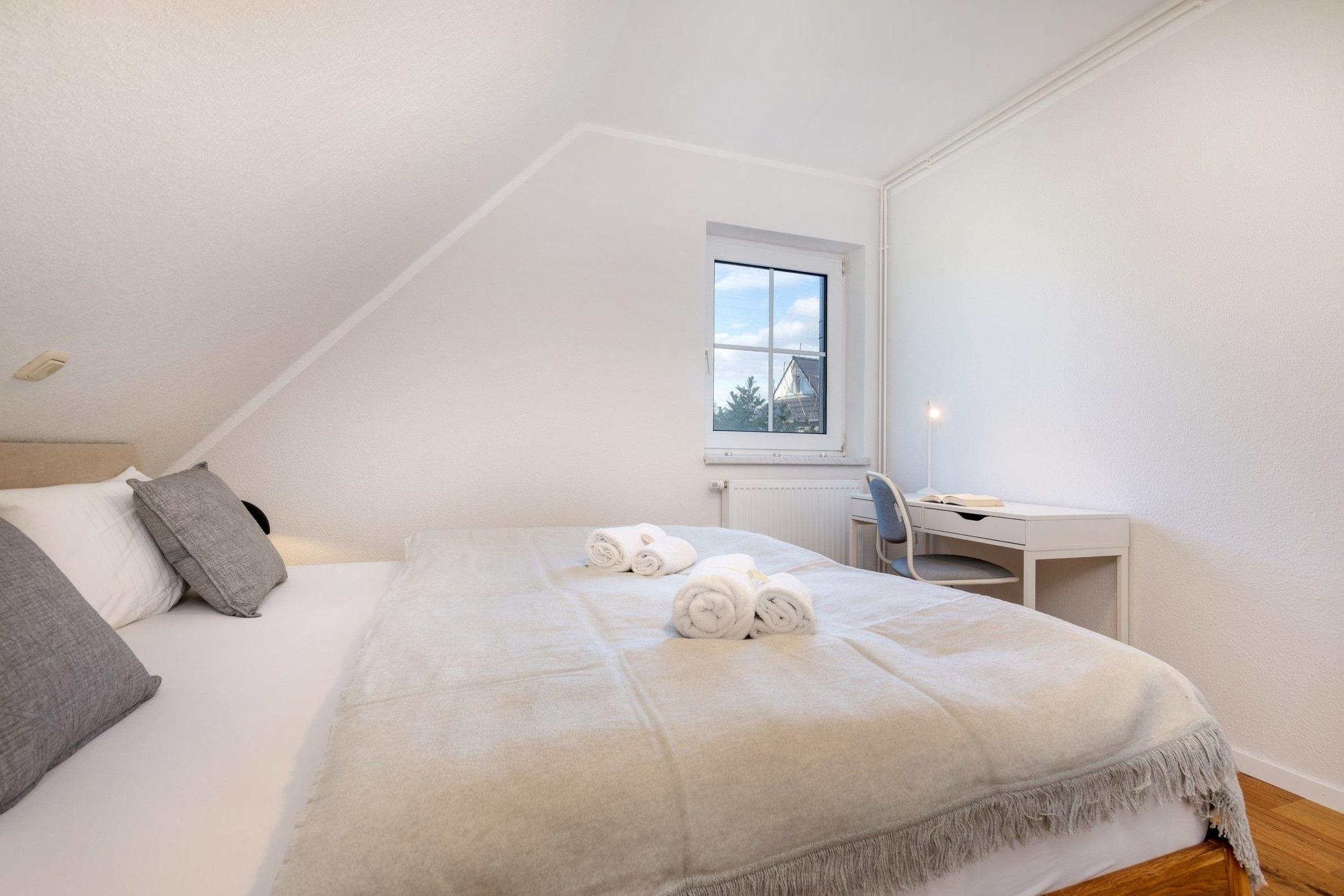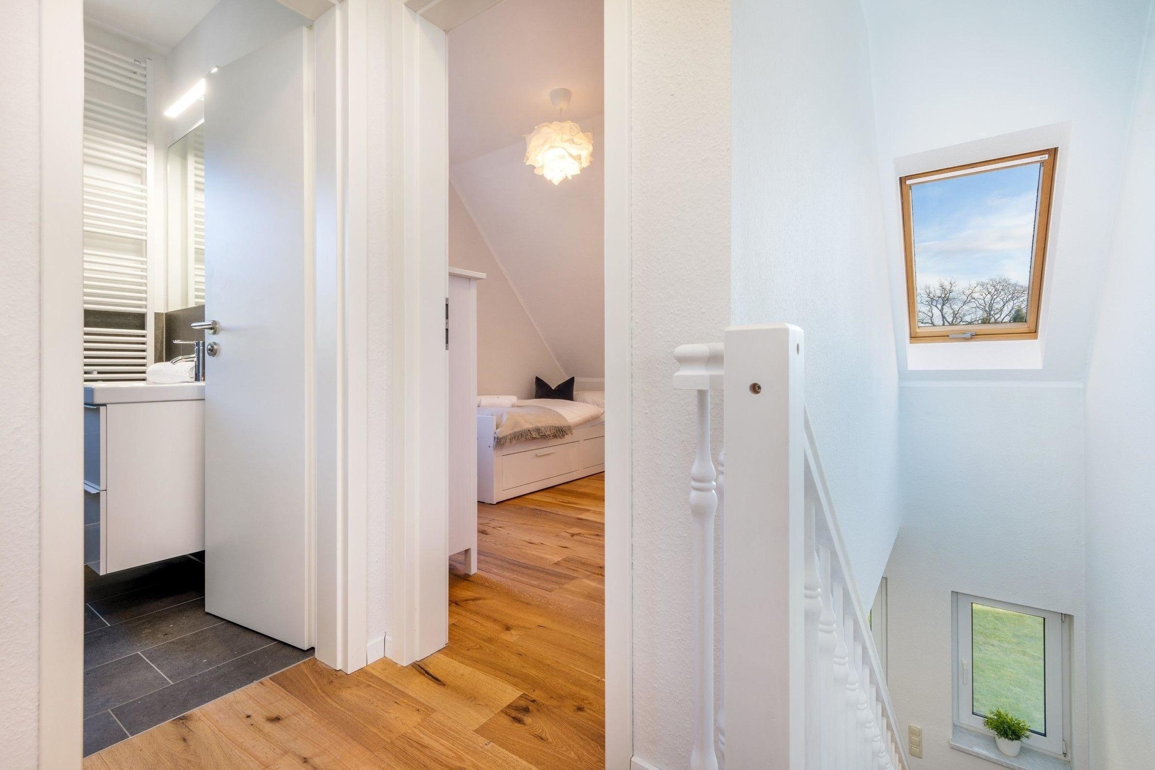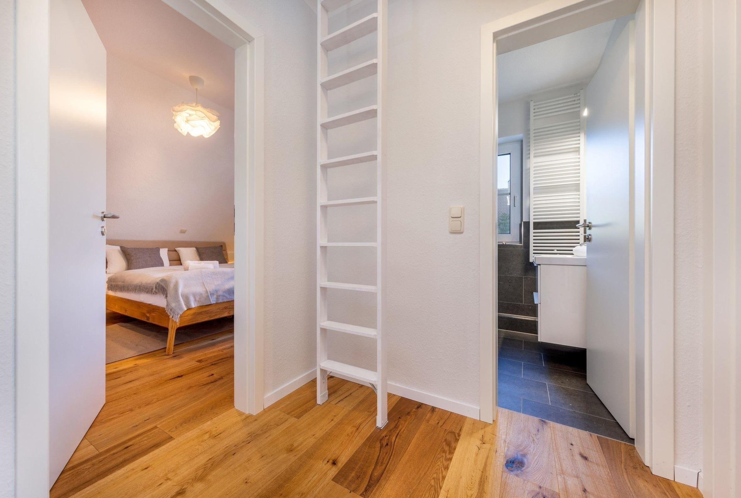 Die Ferienwohnung bietet auf 2 Schlafzimmern ausreichend Platz für Erholung und Entspannung. Eines der Schlafzimmer ist mit einem komfortablen Doppelbett ausgestattet, während das zweite Schlafzimmer mit zwei Einzelbetten aufwartet. Die offene Küche ist ideal für Selbstversorger und verfügt über moderne Geräte wie Geschirrspüler, Backofen, Elektro-/Gasherd sowie eine Mikrowelle. In der gemütlichen Sitzecke mit Sofa und Sessel kann man entspannen oder Spieleabende verbringen. Das Badezimmer mit Fenster und ein zusätzliches Gäste-WC sorgen für zusätzlichen Komfort. Zur Ausstattung gehören auch WLAN, TV, Waschmaschine und ein Kamin, der für eine wohlige Atmosphäre sorgt. Allergikerfreundliche Materialien garantieren einen erholsamen Aufenthalt. Ein Parkplatz steht ebenfalls zur Verfügung. Die liebevoll eingerichtete Wohnung ist der perfekte Rückzugsort für eine unbeschwerte Auszeit.