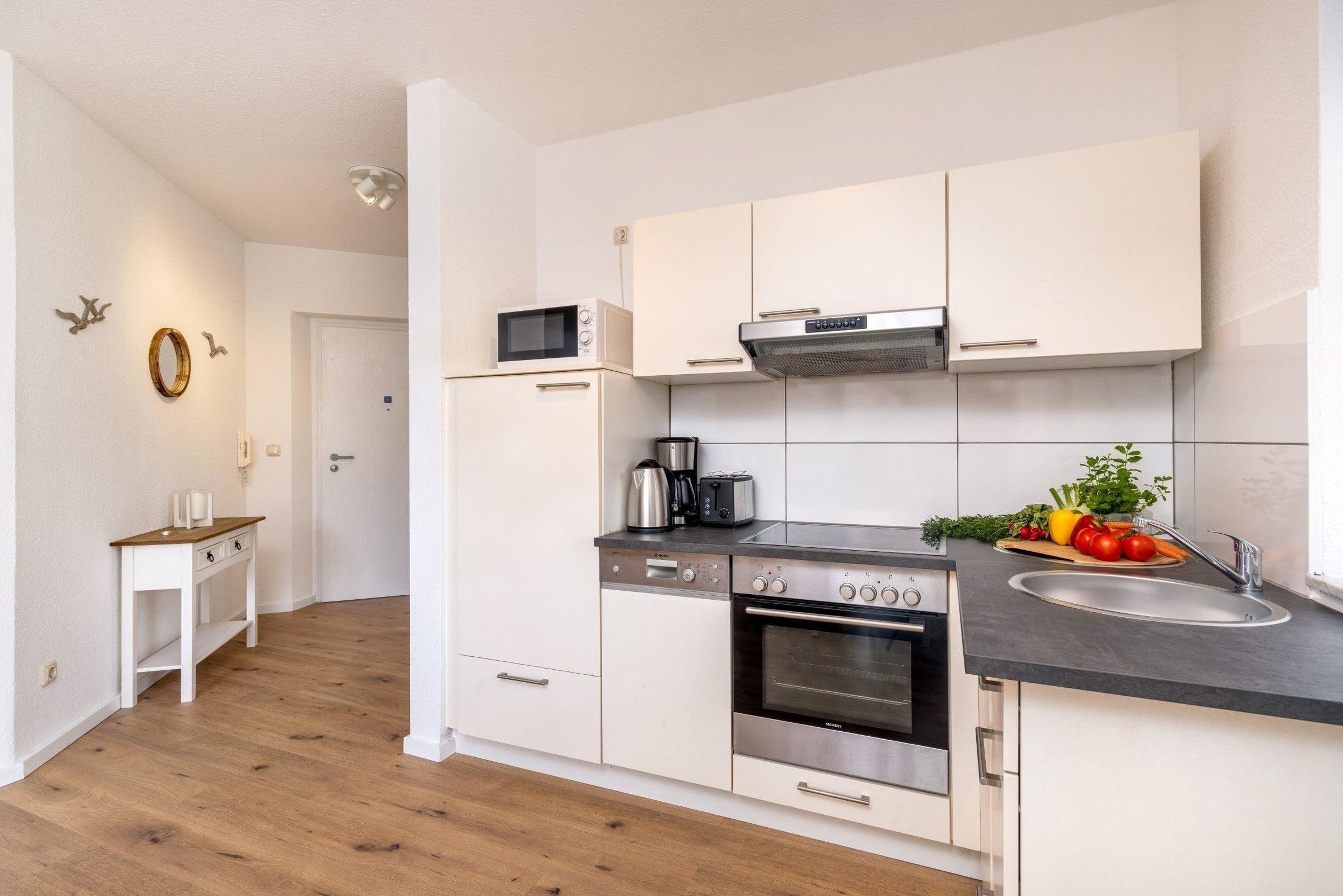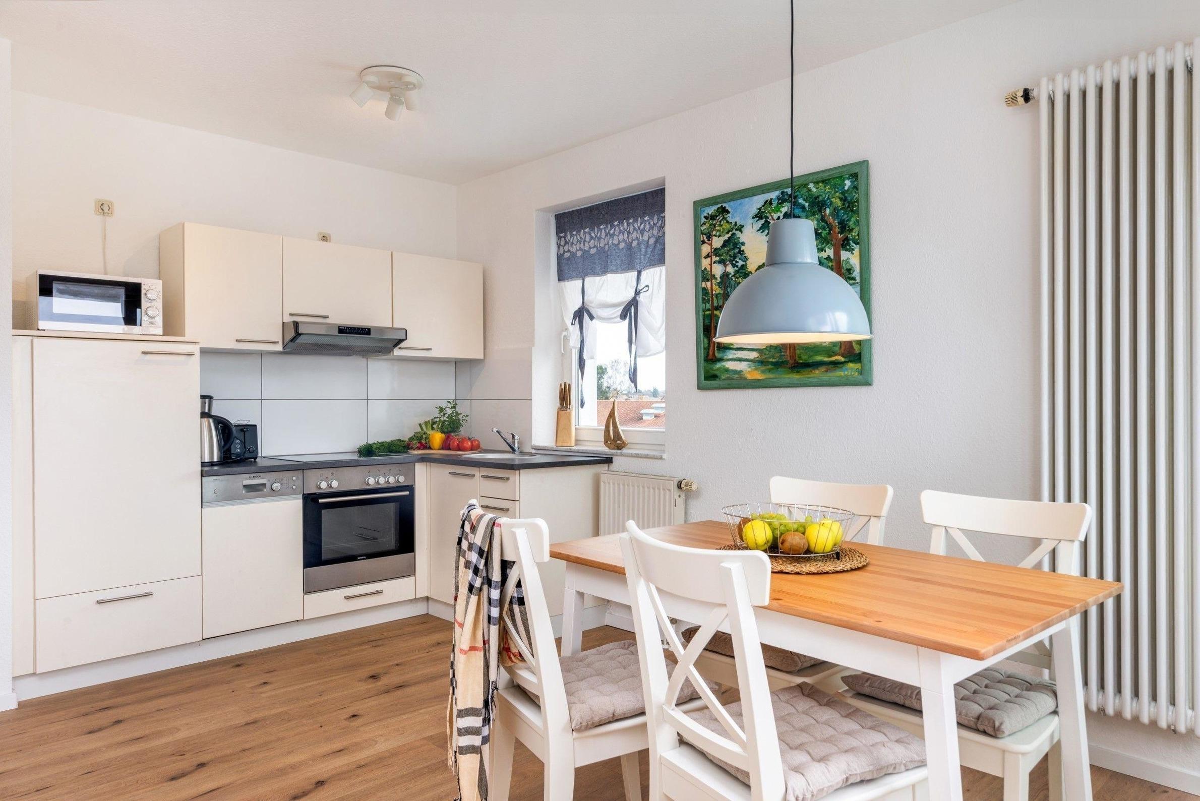 Die Ferienwohnung bietet ein modernes und komfortables Ambiente, ideal für einen entspannten Aufenthalt. Die offene Küche ist mit hochwertigen Geräten ausgestattet, darunter ein Geschirrspüler, Elektro-/Gasherd, Backofen, Mikrowelle und Kühlschrank, die alle kulinarischen Wünsche erfüllen. Ein Esstisch lädt zu gemeinsamen Mahlzeiten ein.