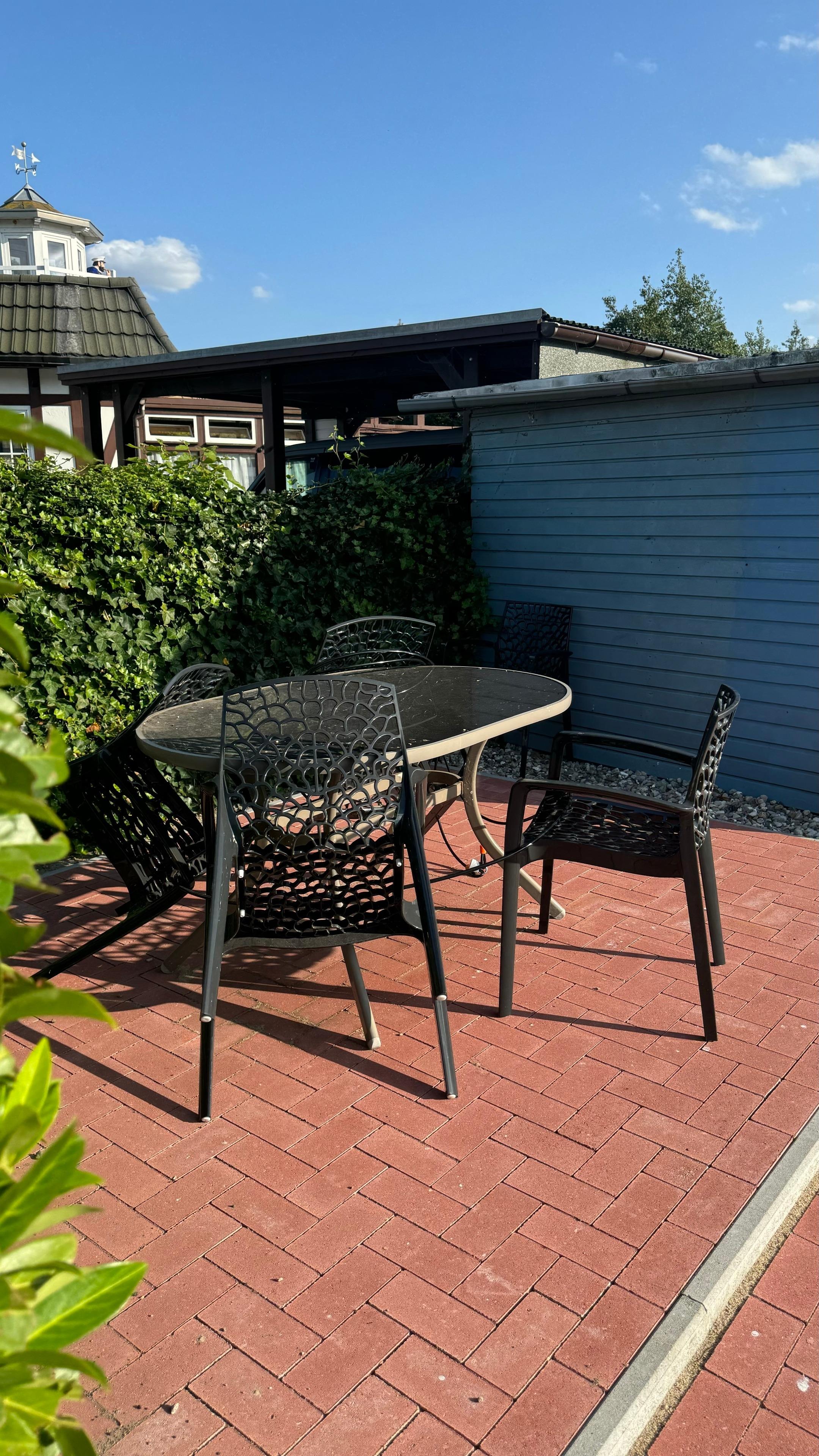 Genießen Sie auch den gemeinsamen Gartenbereich mit Ihrer Chill-Out-Muschel und Gartentisch mit Stühlen; perfekt für erholsame Stunden im Freien.