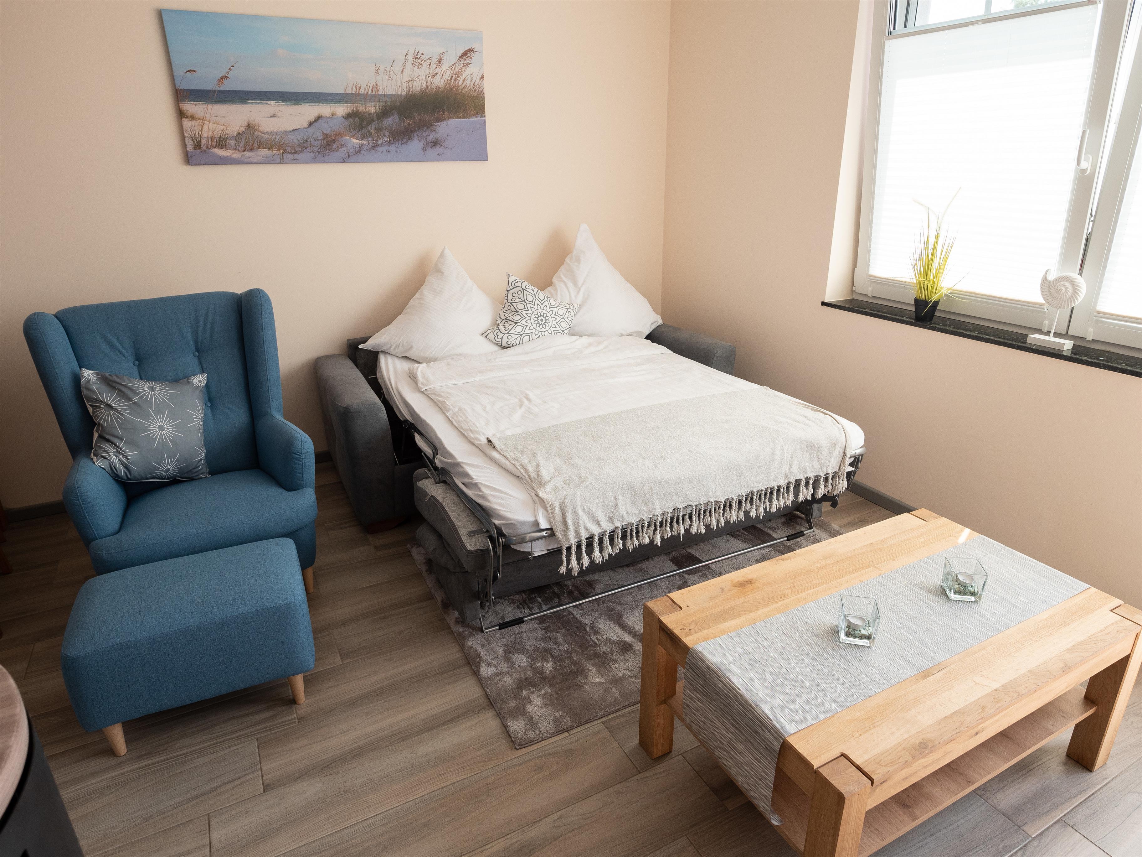 Flexibles Schlafangebot: Bei Bedarf kann das Sofa im Wohnbereich in ein hochwertiges Bett umgewandelt werden, um zusätzliche Gäste bequem unterzubringen.