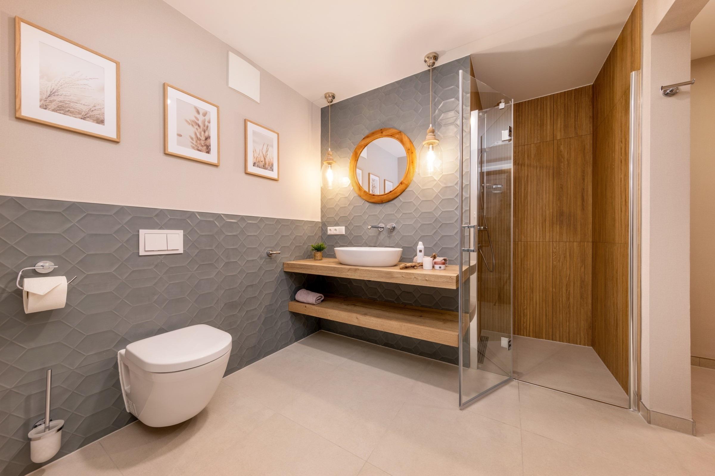 Das Badezimmer hat einen wohnlichen Charakter und verfügt über eine ebenerdige Dusche.
