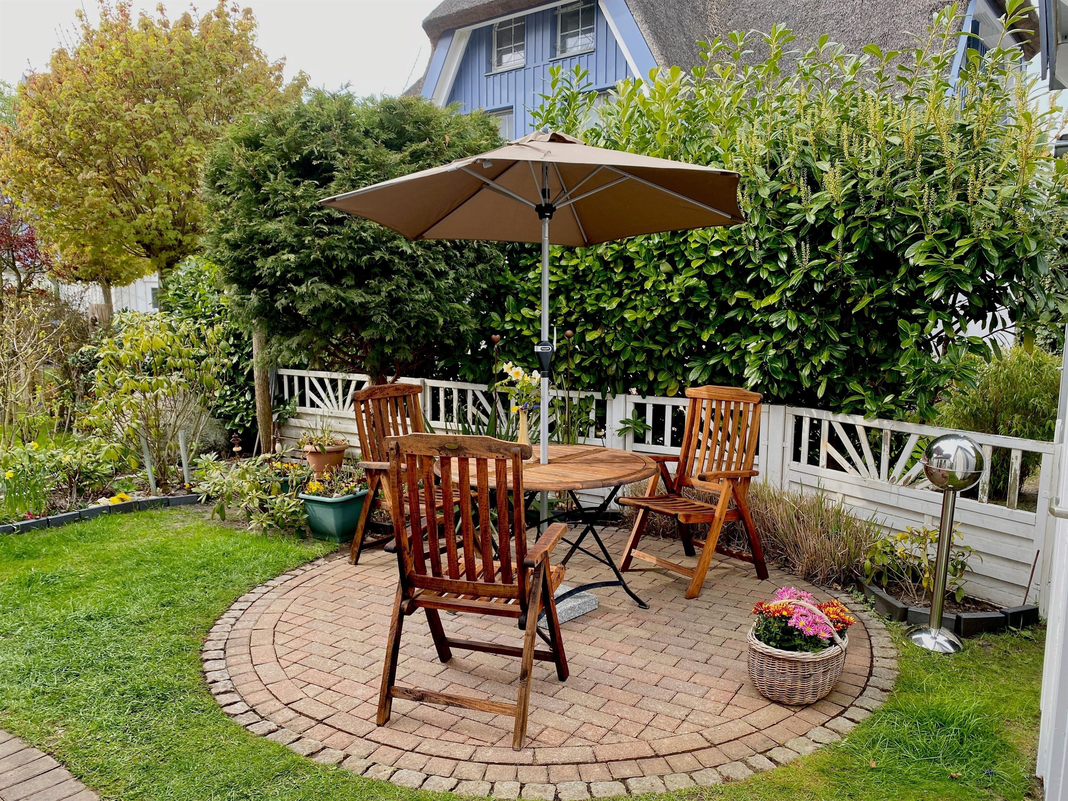 Sonnige Terrasse mit Sitzgelegenheiten, perfekt für ein Frühstück im Freien oder ein Glas Wein bei Sonnenuntergang.