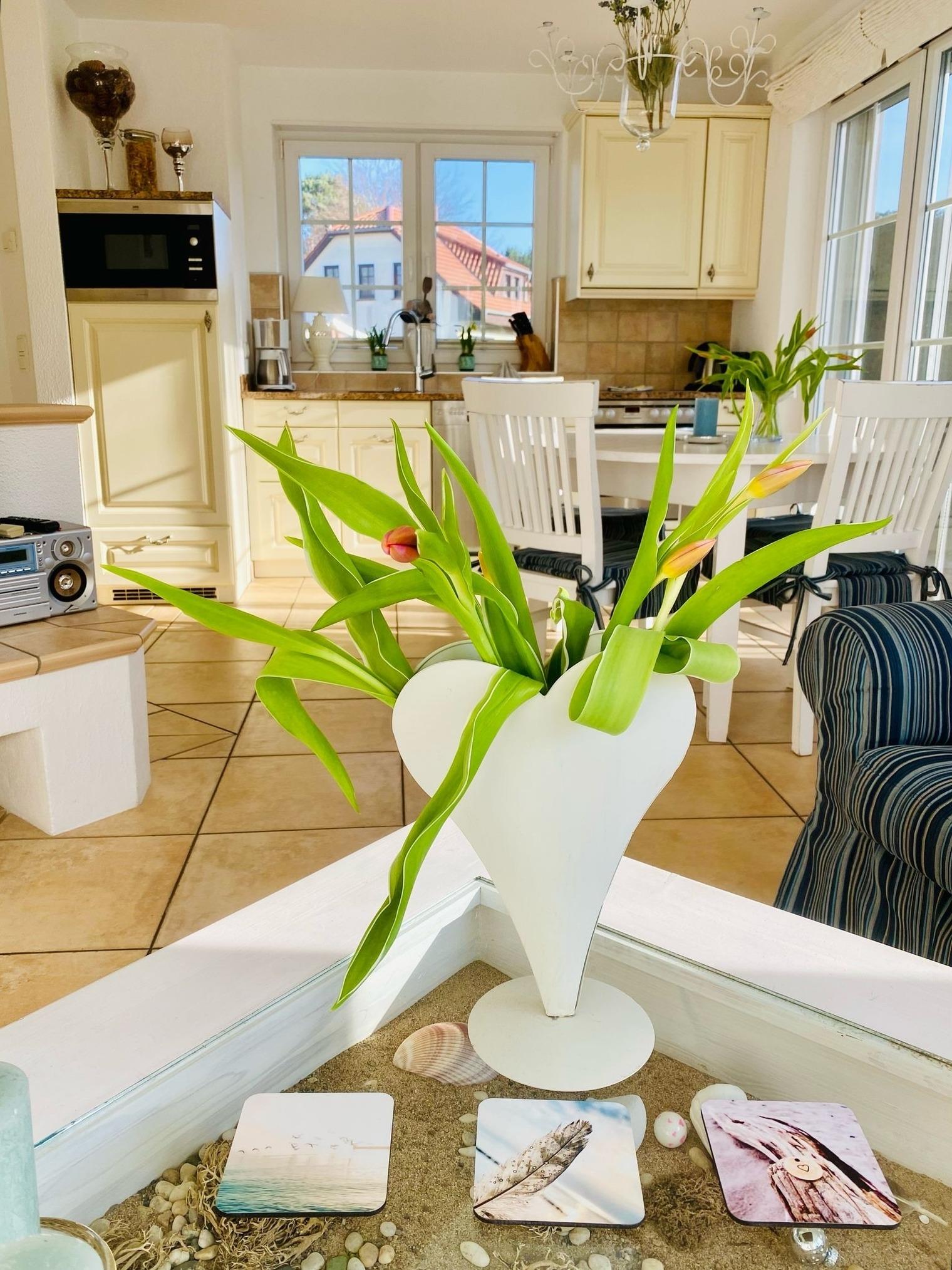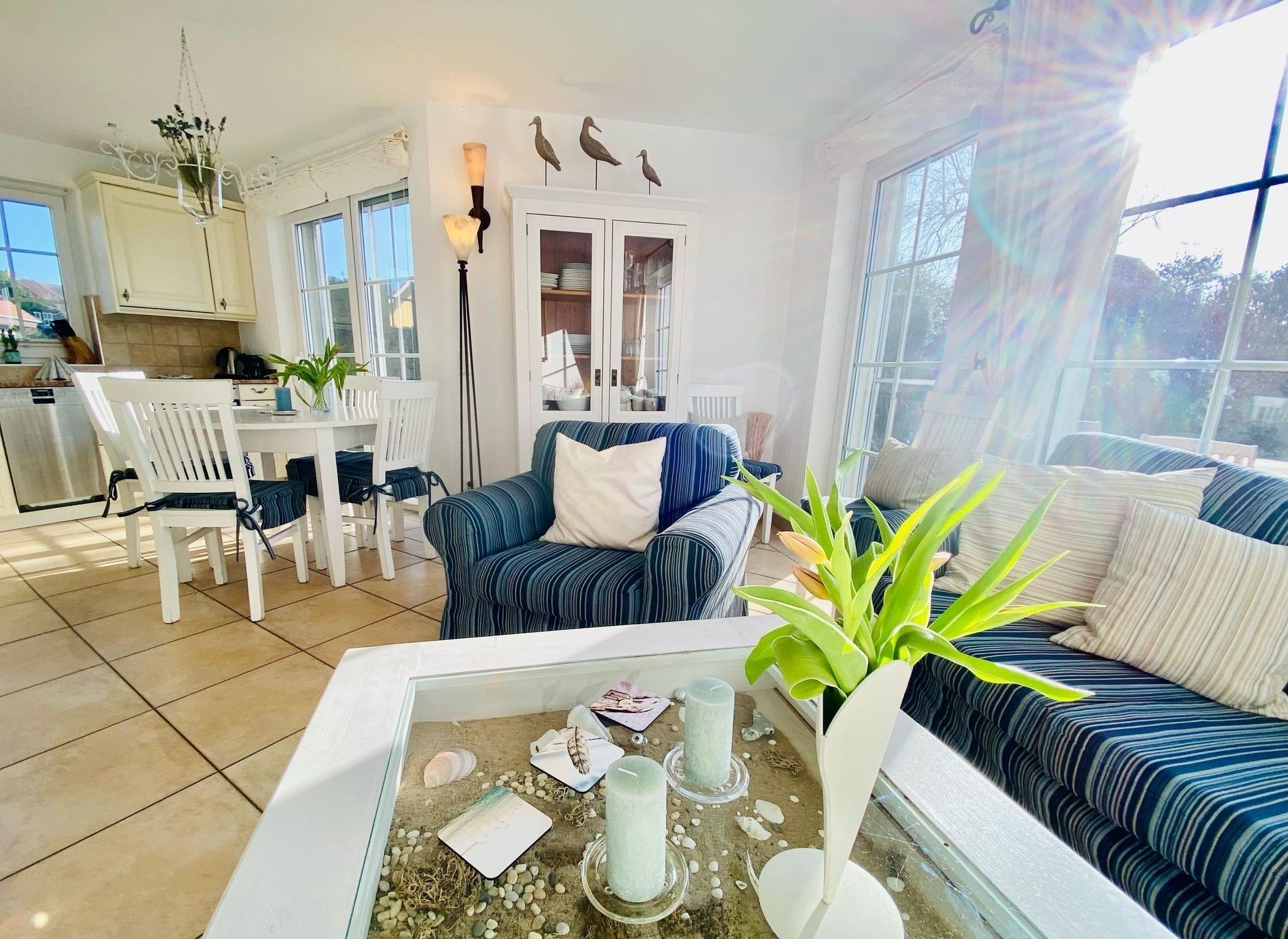 Genießen Sie entspannte Stunden in der lichtdurchfluteten Wohnstube mit Kamin, der an kühleren Abenden eine wohltuende Wärme verbreitet. Die offene Küche ist komplett ausgestattet, sodass Sie nach Herzenslust kochen können.