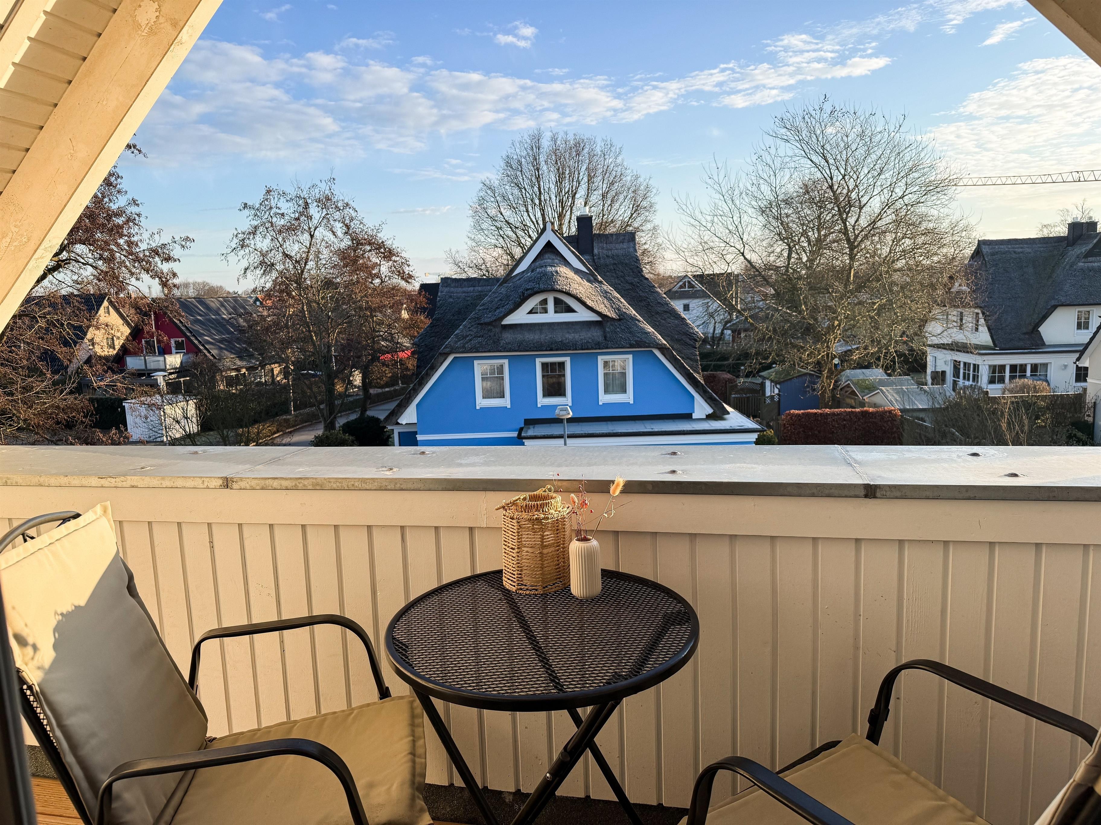 Der großzügige, überdachte Balkon nach Osten ist ebenfalls mit einem Essplatz ausgestattet und lädt zu einem Frühstück in der Morgensonne mit Blick auf die schönen Reetdachhäuser ein.