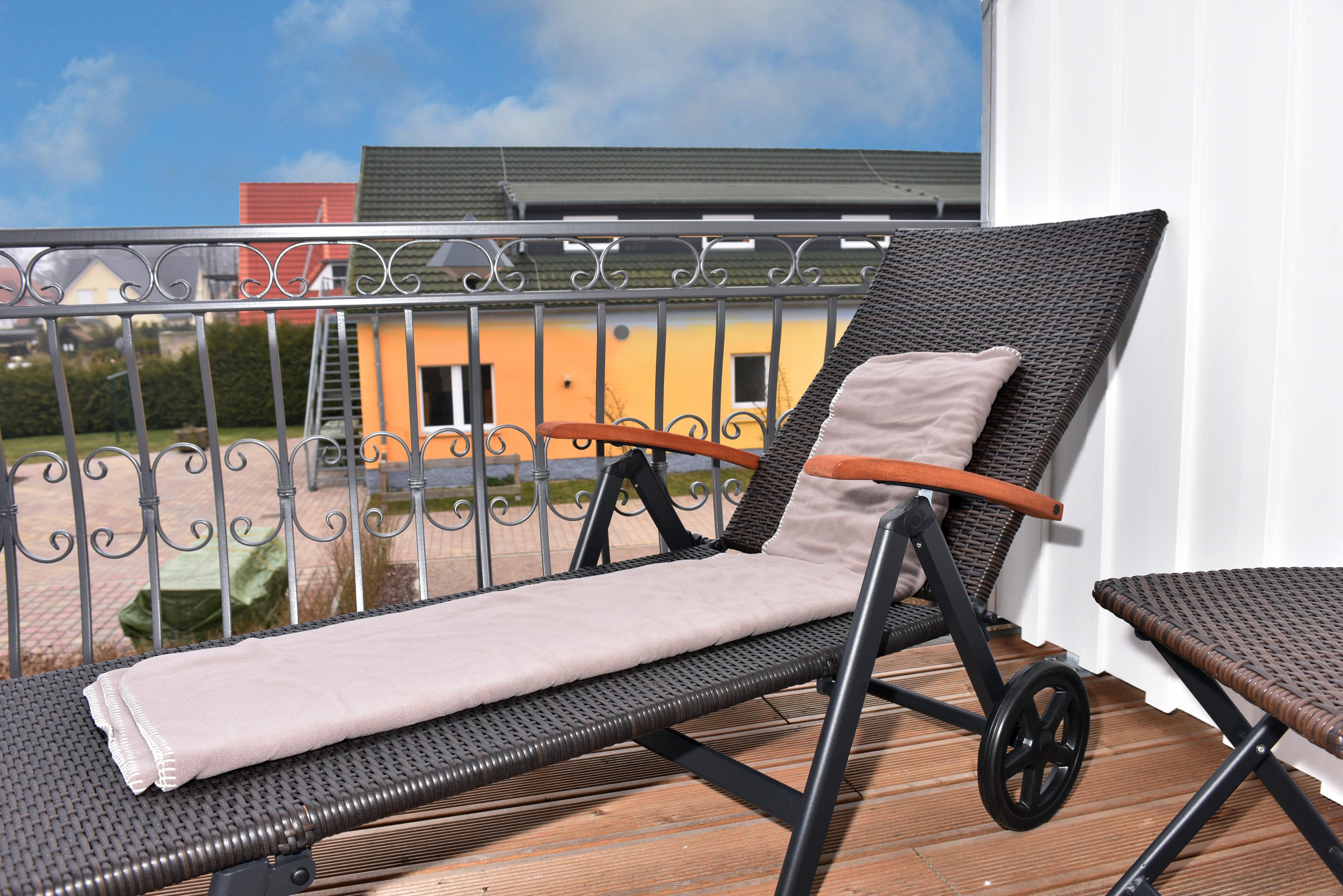 Das Schlafzimmer verfügt über ein Komfort- Doppelbett und einen großen Kleiderschrank. Das Badezimmer bietet Fußbodenheizung, eine große ebenerdige Dusche, einen Kosmetikspiegel, einen Handtuchtrockner - der auch im Sommerbetrieb läuft - einen Haartrockner sowie ein integriertes Radio. Genießen Sie am Morgen Ihr Frühstück auf komfortablen Rattanmöbeln auf dem nach Osten ausgerichteten Balkon direkt an der Wohnküche, sonnen Sie sich etwas später am Tag auf der Sonnenliege auf dem nach Süden ausgerichteten Balkon am Wohnzimmer und setzen Sie sich am Abend zu einem Glas Wein auf den Balkon am Schlafzimmer. Ein Pkw- Stellplatz direkt vor der Haustür und ein Fahrradabstellraum stehen Ihnen ebenfalls