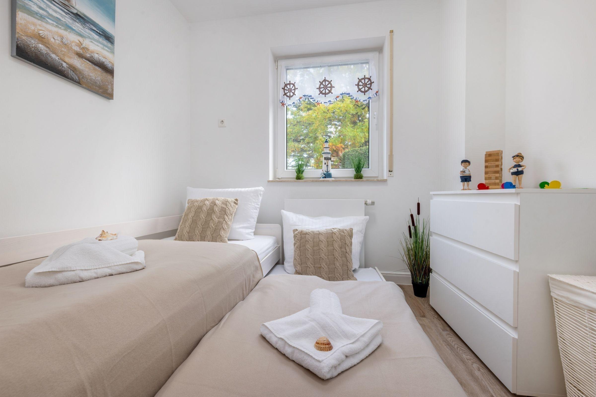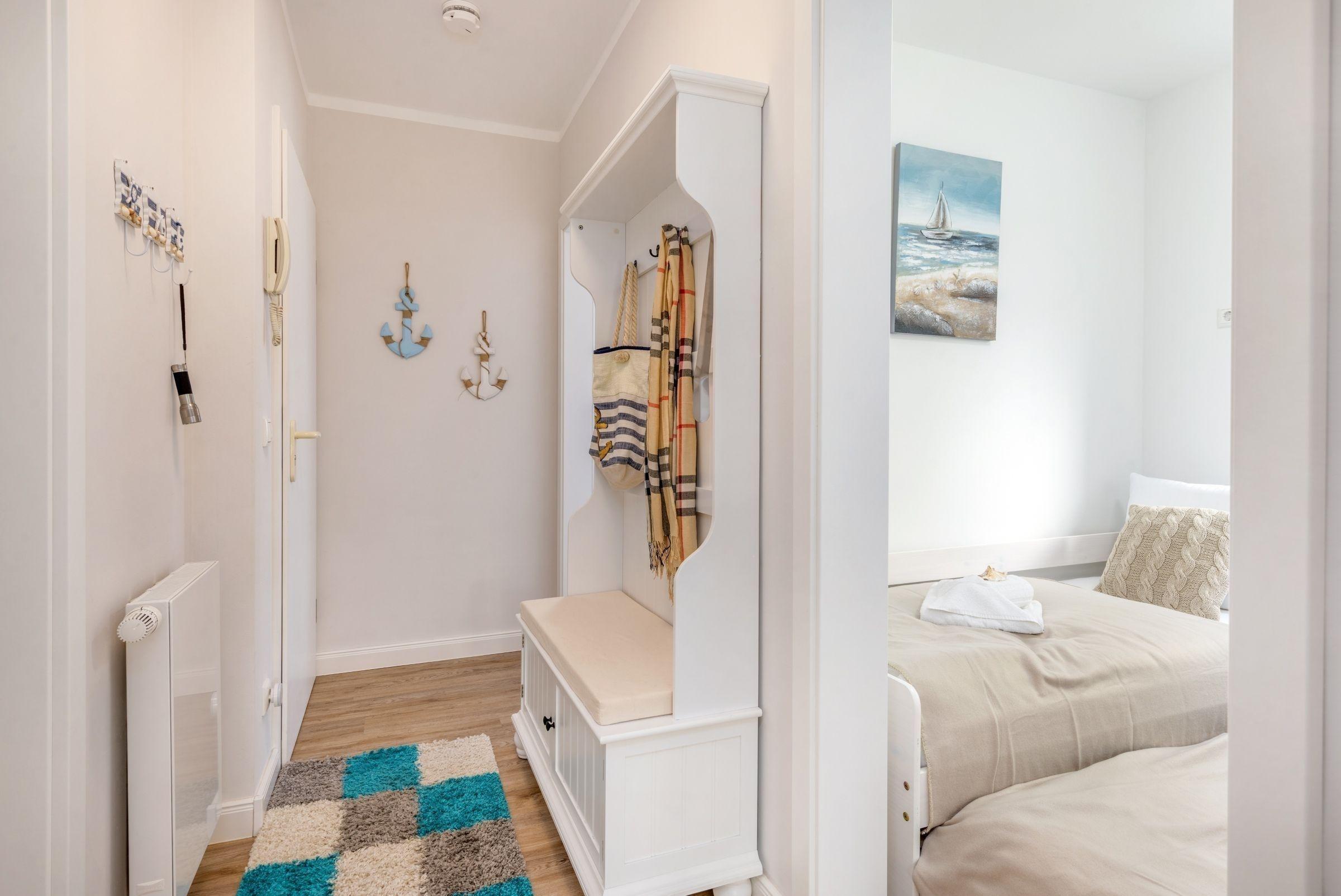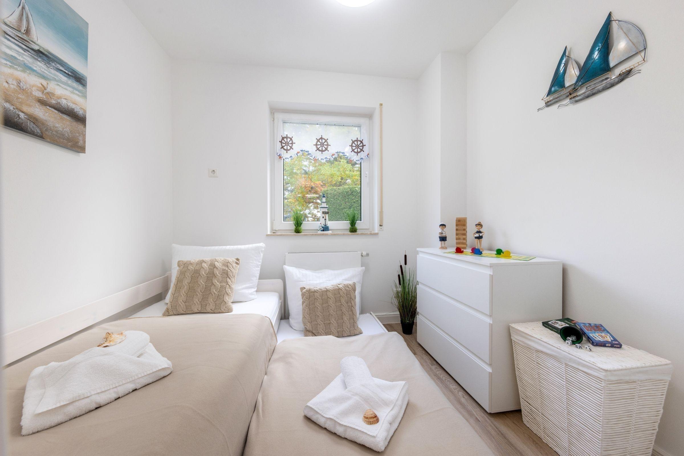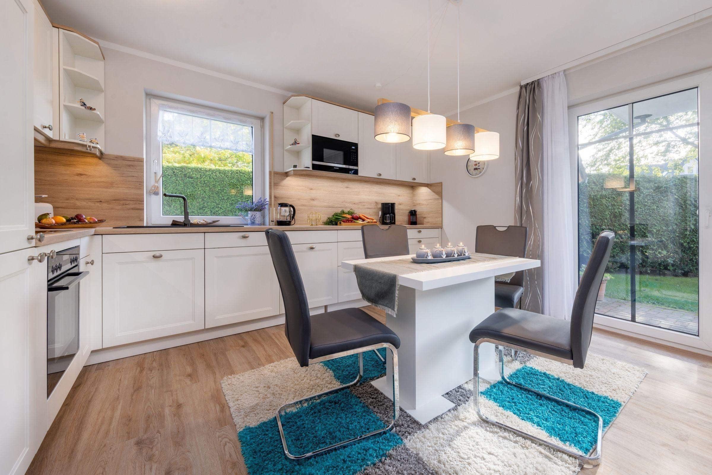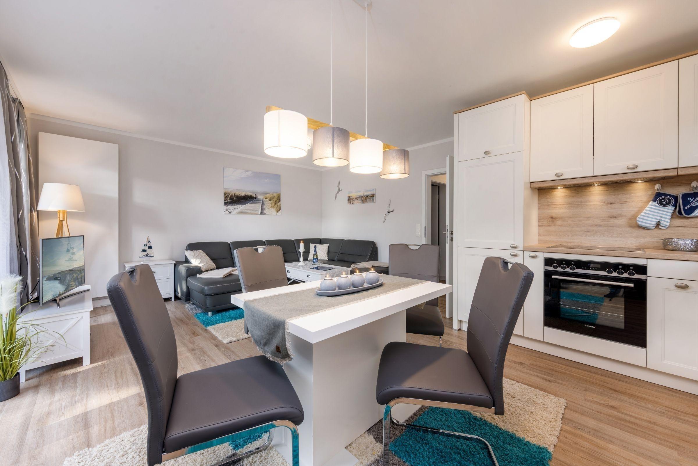 Die Ferienwohnung FeWo Bianca in Zingst bietet auf 63 m² Platz für bis zu vier Personen. Die Unterkunft verfügt über zwei separate Schlafzimmer, eines mit einem komfortablen Doppelbett (180x200 cm) und eines mit einem ausziehbaren Einzelbett (90x200 cm). Der offene Wohn- und Essbereich ist mit einer gemütlichen Sofaecke, einem TV mit Satellitenanschluss und kostenfreiem WLAN ausgestattet. Die moderne Küche beinhaltet einen Induktionsherd, Backofen, Mikrowelle, Kühlschrank mit Gefrierfach, Spülmaschine sowie eine Nespresso-Espressomaschine. Das stilvolle Badezimmer umfasst eine bodengleiche Dusche. Praktische Ausstattungen wie ein Kinderhochstuhl, Steckdosensicherungen und ein Bollerwagen sind vorhanden. Die Wohnung ist ein Nichtraucherdomizil und bietet eine Zentralheizung. Ein privater Parkplatz und eine eigene Waschmaschine stehen ebenfalls zur Verfügung. Haustiere sind nach Anfrage erlaubt, was das Urlaubsgefühl für die ganze Familie abrundet.