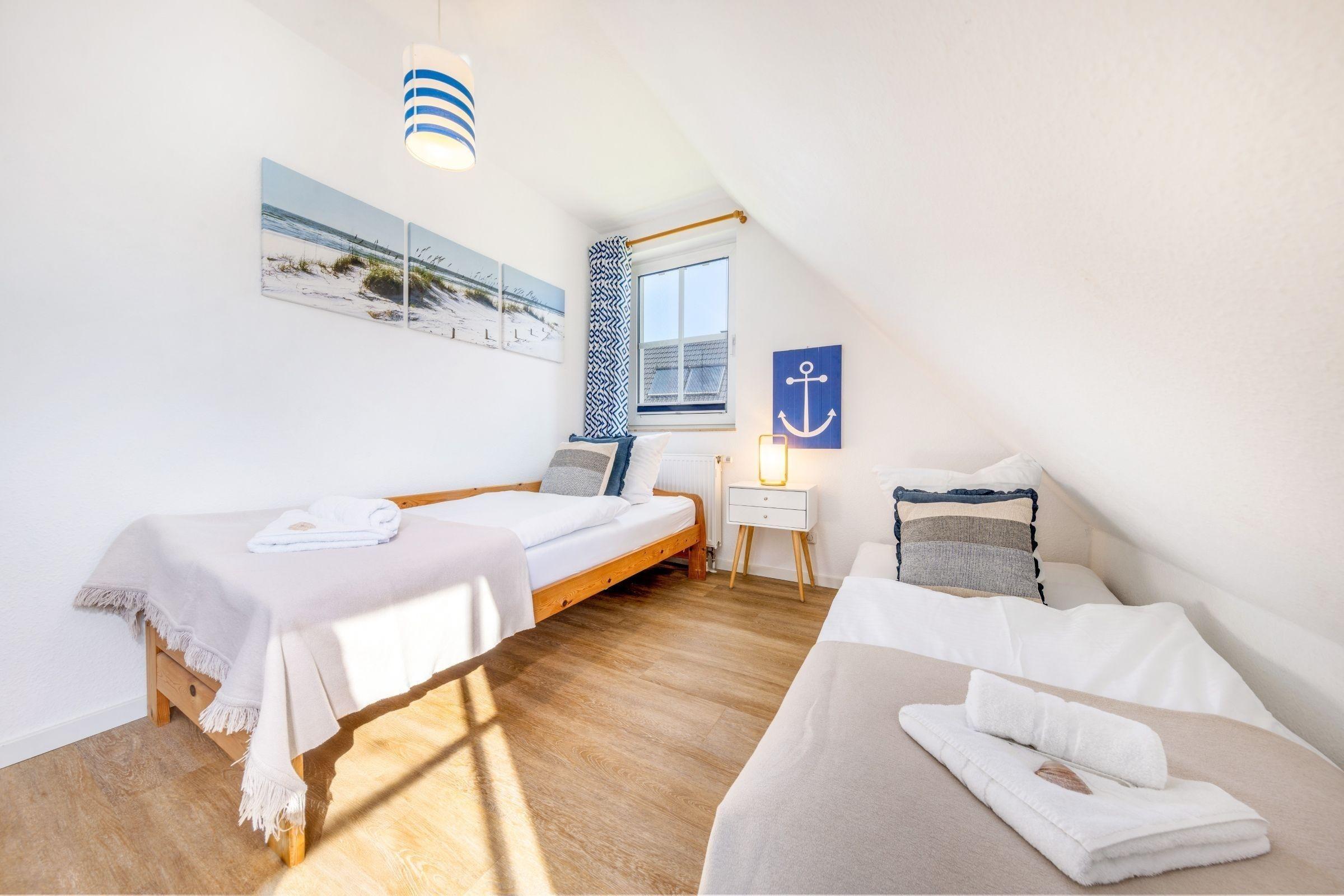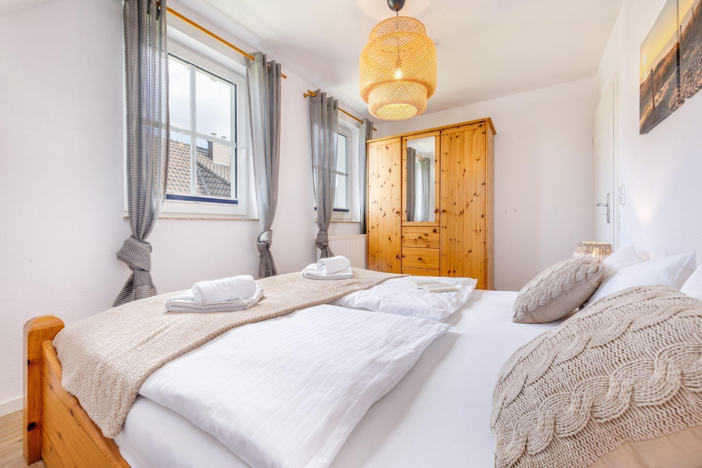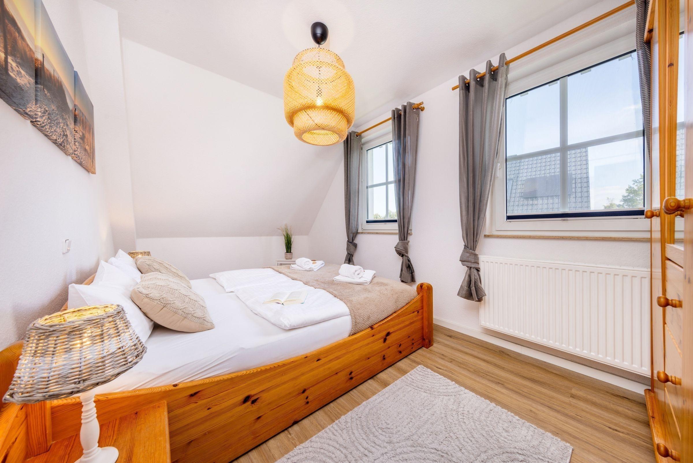 Haus Kranichwiese ist eine komfortable Ferienwohnung im Ostseeheilbad Zingst, die auf 52 m² ideal für bis zu vier Personen geeignet ist. Die Unterkunft umfasst zwei Schlafzimmer: ein Schlafzimmer mit einem Doppelbett (180 x 200 cm) und ein weiteres mit zwei Einzelbetten (90 x 200 cm). Der offene Wohn- und Essbereich lädt zum Verweilen ein und ist mit einer voll ausgestatteten Küche ausgestattet, die unter anderem einen 4-Platten-Herd, Backofen und Spülmaschine bietet. Zur Unterhaltung stehen ein Flachbild-TV sowie Bücher und Spiele zur Verfügung. Das Badezimmer verfügt über eine bodengleiche Dusche und eine Waschmaschine ist ebenfalls vorhanden. Allergikerfreundliche Ausstattung und moderne Annehmlichkeiten sorgen für Komfort. Rauchen ist innerhalb der Wohnung nicht gestattet. Die ruhige Lage in einem Dorfviertel ermöglicht entspannte Urlaubstage in der Nähe der Ostsee.