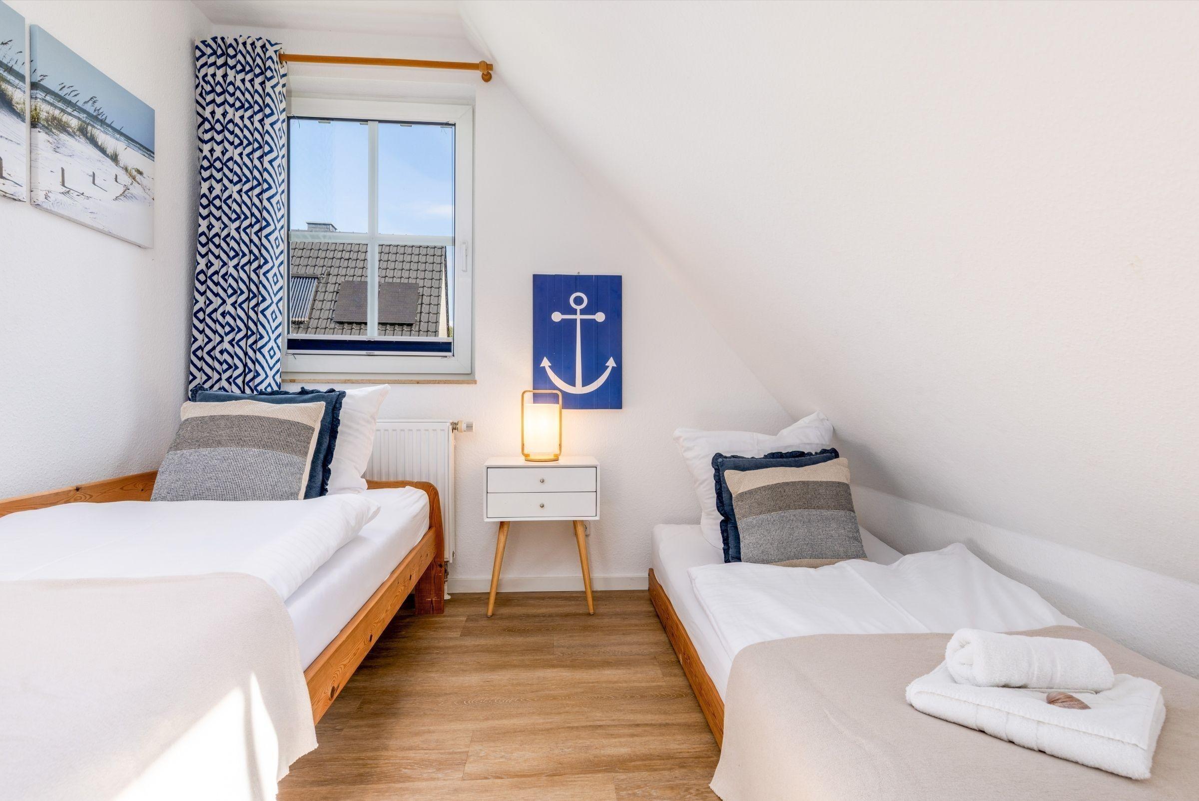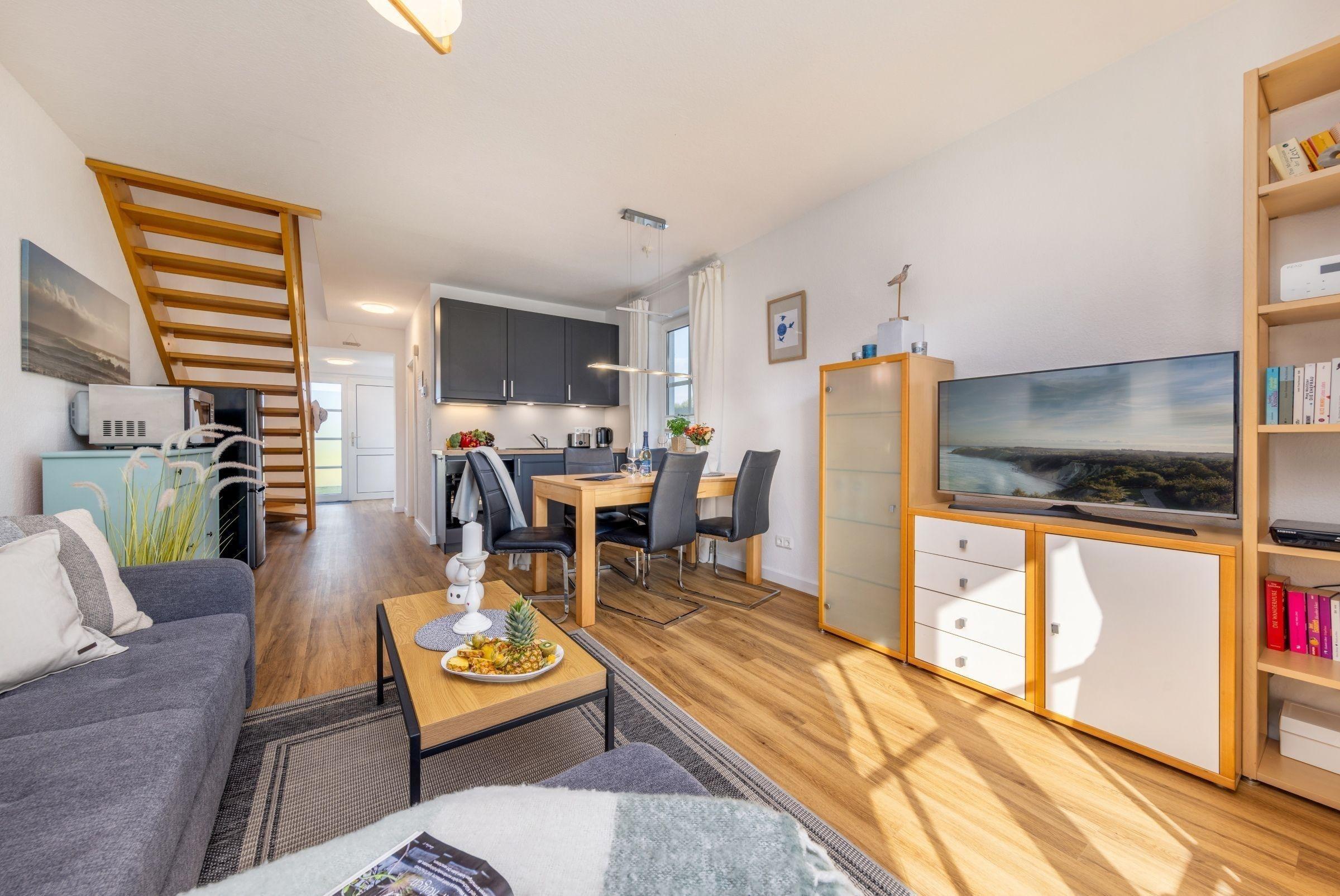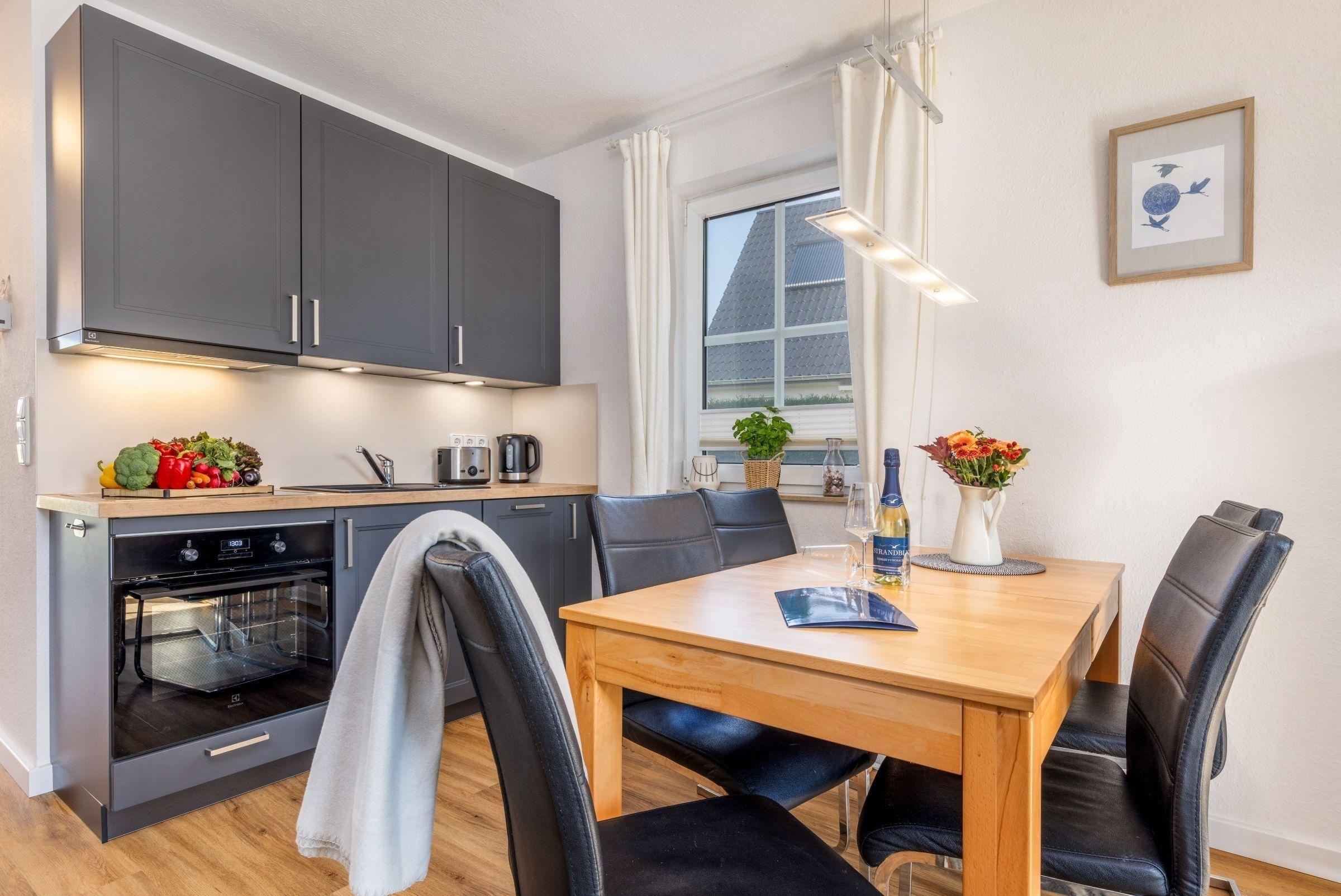Haus Kranichwiese ist eine komfortable Ferienwohnung im Ostseeheilbad Zingst, die auf 52 m² ideal für bis zu vier Personen geeignet ist. Die Unterkunft umfasst zwei Schlafzimmer: ein Schlafzimmer mit einem Doppelbett (180 x 200 cm) und ein weiteres mit zwei Einzelbetten (90 x 200 cm). Der offene Wohn- und Essbereich lädt zum Verweilen ein und ist mit einer voll ausgestatteten Küche ausgestattet, die unter anderem einen 4-Platten-Herd, Backofen und Spülmaschine bietet. Zur Unterhaltung stehen ein Flachbild-TV sowie Bücher und Spiele zur Verfügung. Das Badezimmer verfügt über eine bodengleiche Dusche und eine Waschmaschine ist ebenfalls vorhanden. Allergikerfreundliche Ausstattung und moderne Annehmlichkeiten sorgen für Komfort. Rauchen ist innerhalb der Wohnung nicht gestattet. Die ruhige Lage in einem Dorfviertel ermöglicht entspannte Urlaubstage in der Nähe der Ostsee.