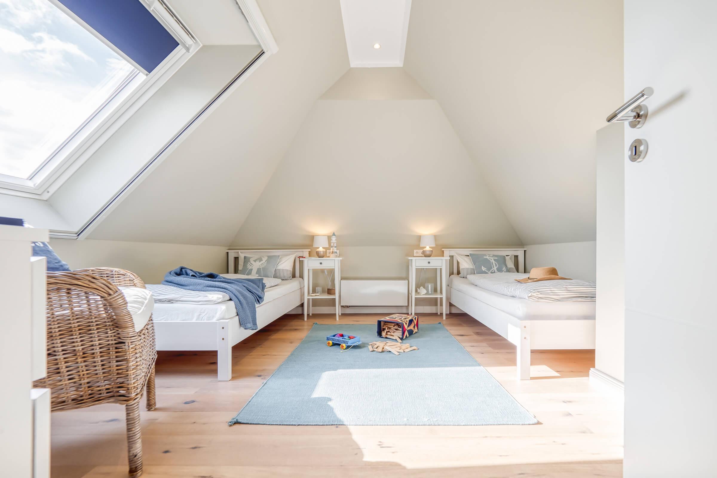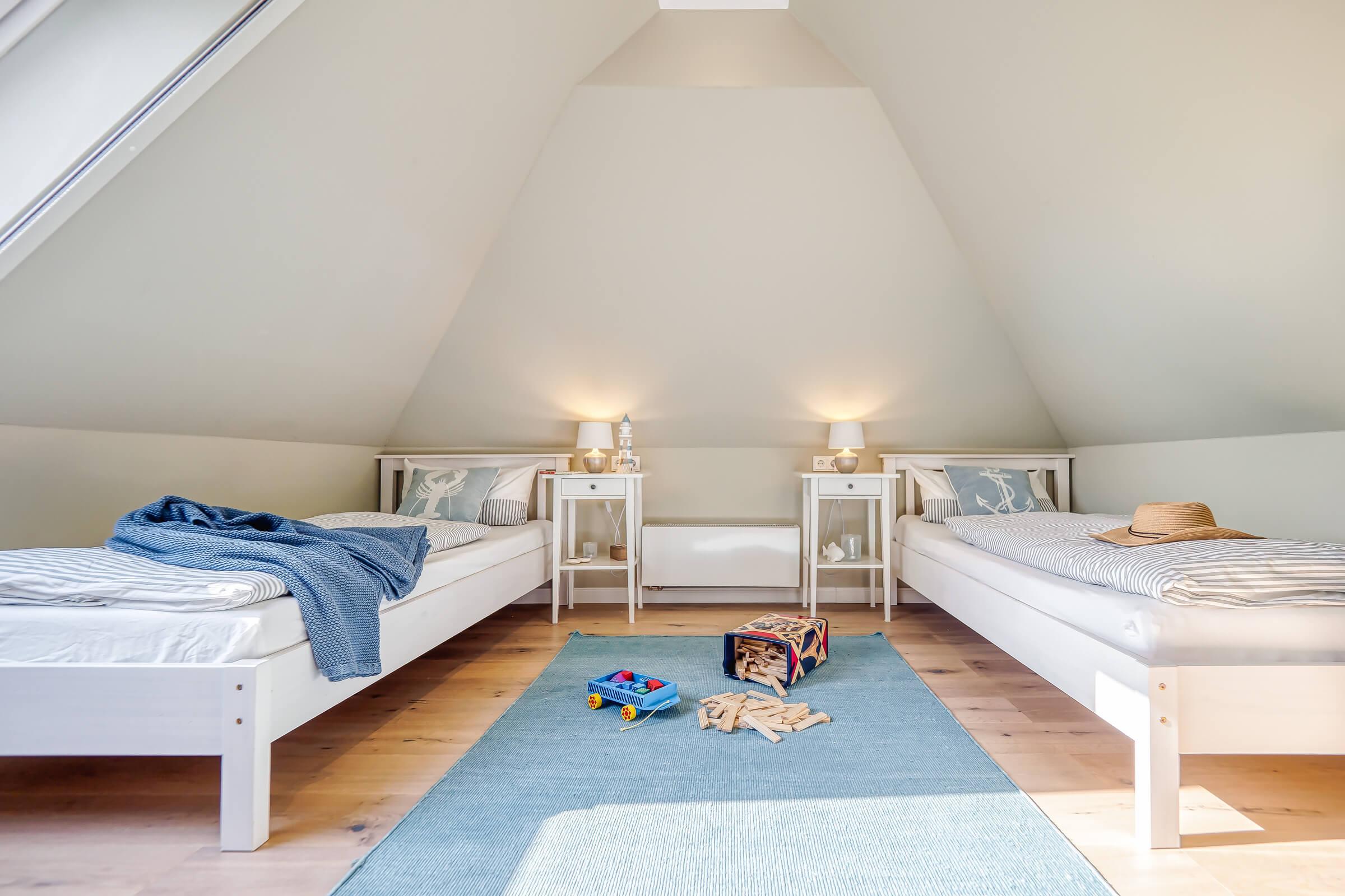 Zwei Schlafzimmer: Ein Schlafzimmer mit luxuriösem Boxspringbett und ein Dachgeschosszimmer mit zwei Einzelbetten
