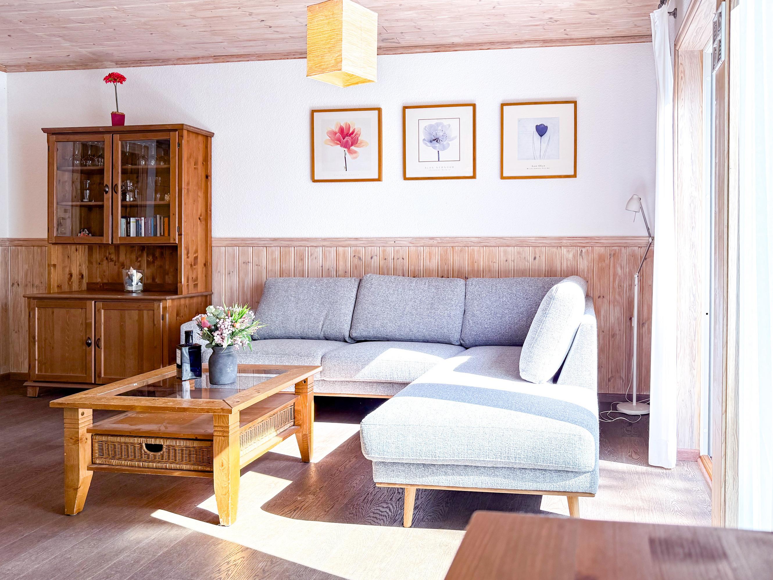 Gemütlicher Wohnbereich mit bequemer Couch und Essbereich
