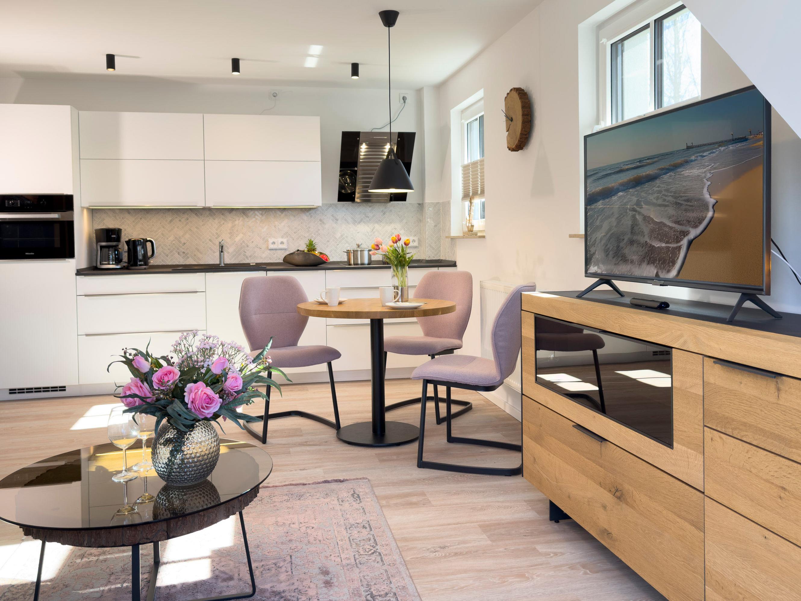 Im offenen Wohnbereich finden Sie Raum zum Entspannen, die moderne Küche bietet alles für kulinarische Momente, und das komfortable Boxspringbett im Schlafzimmer sorgt für erholsame Nächte nach einem langen Tag an der Ostsee.