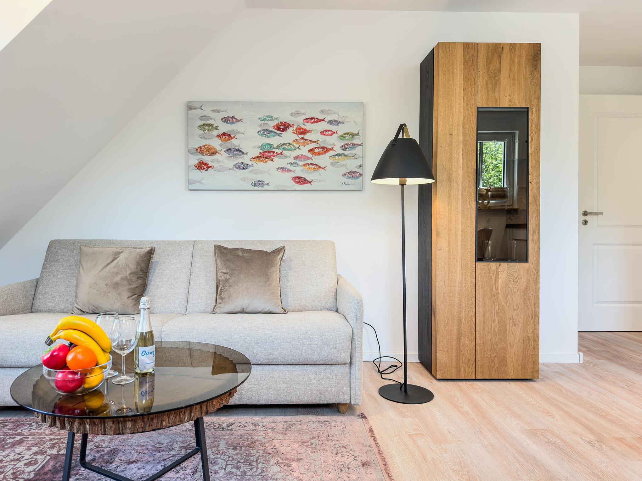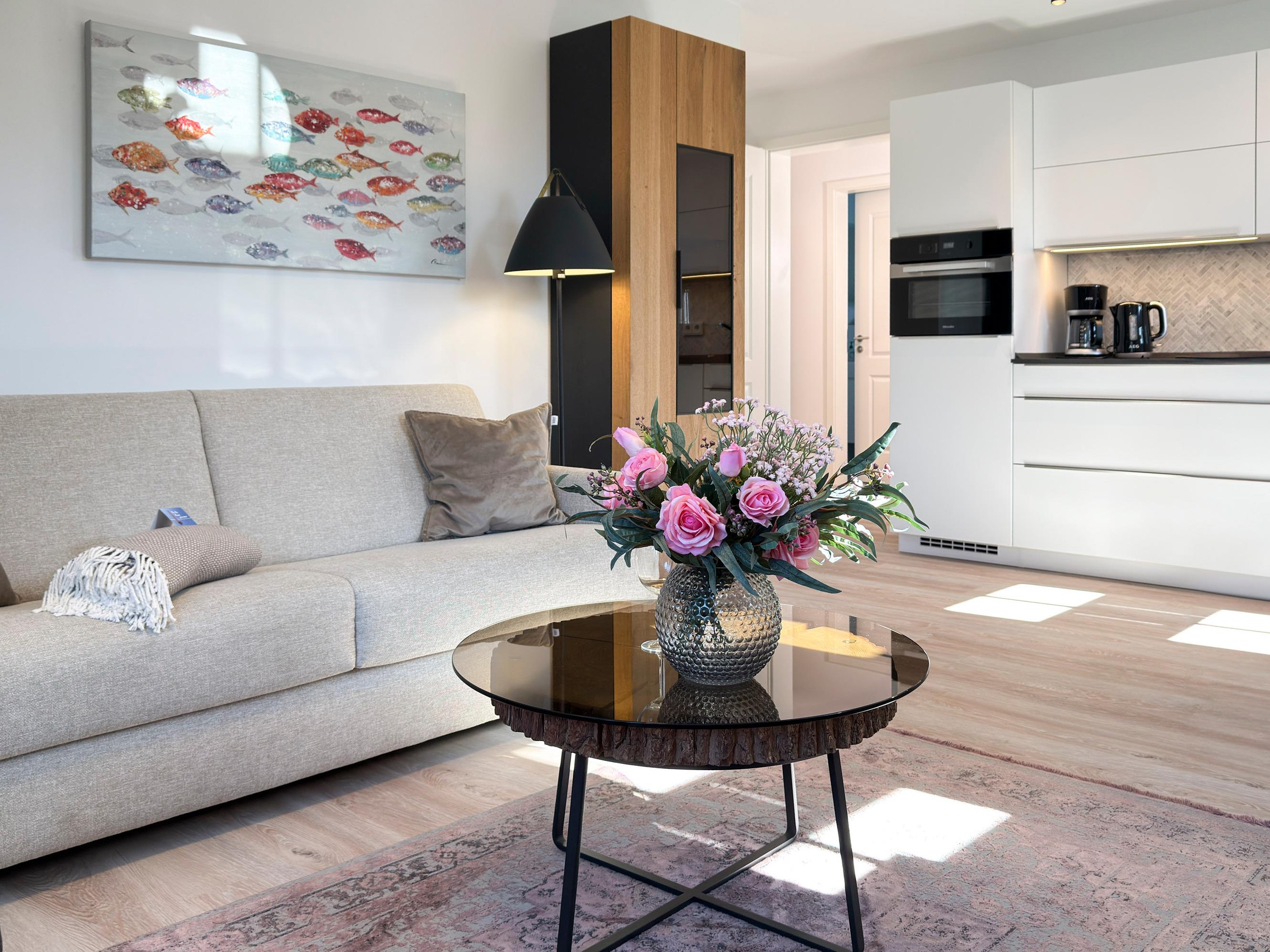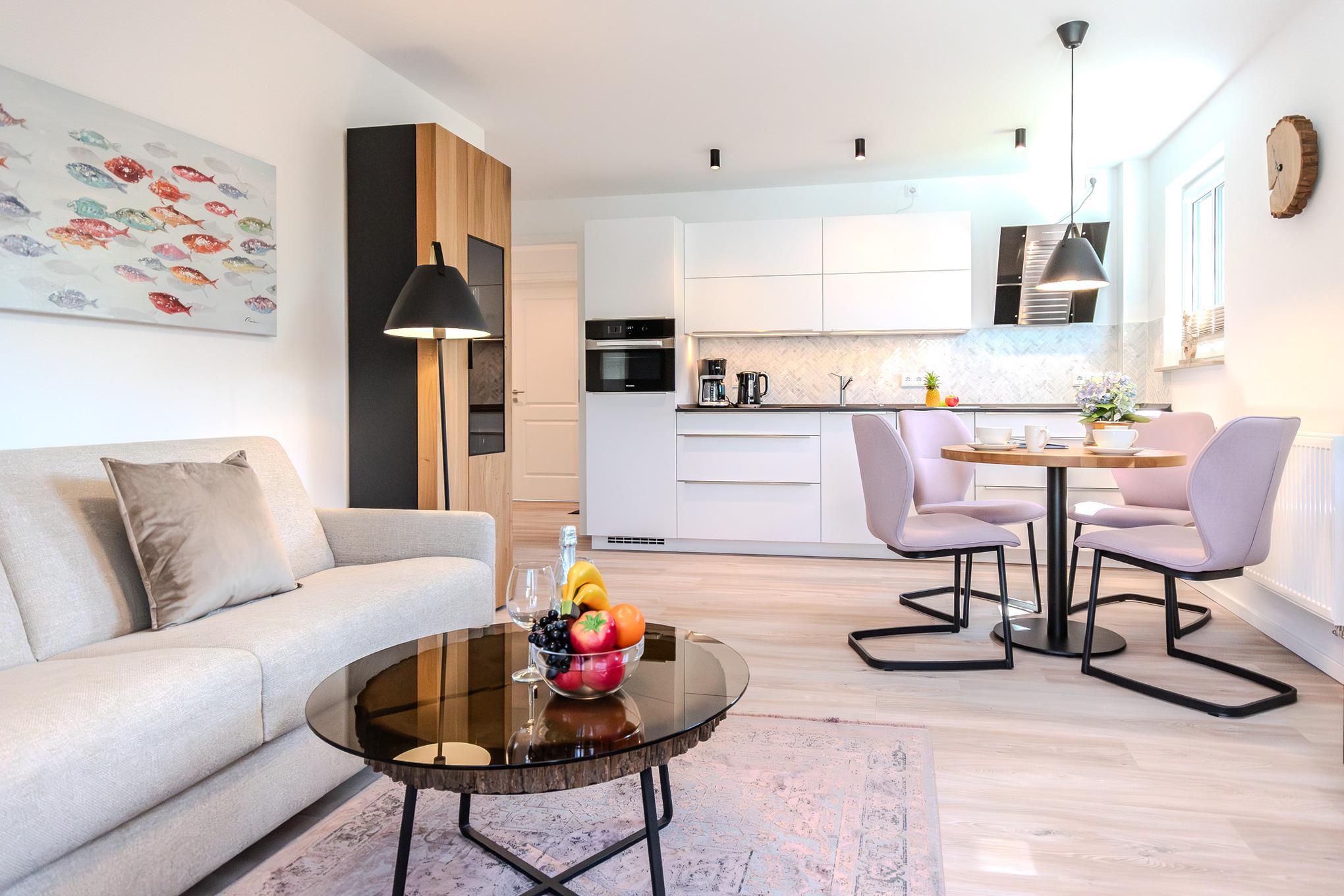 Die Ferienwohnung Küstenflair vereint klares Design mit Gemütlichkeit und schafft so ein Ambiente, das zum Ankommen und Wohlfühlen einlädt.