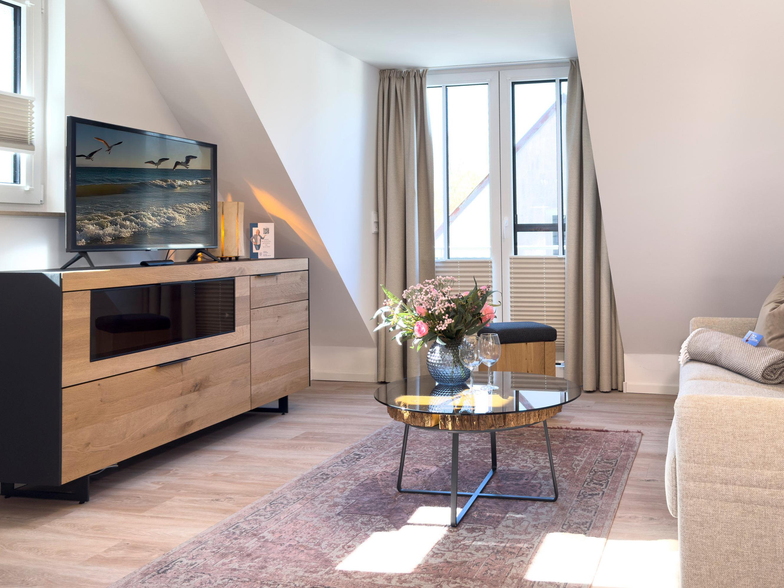 Klar, modern und mit einer frischen Brise Meeresgefühl – die Ferienwohnung Küstenflair im ersten Obergeschoss der Anlage Düne 7 empfängt Sie mit maritimem Stil und einem Hauch von Eleganz.