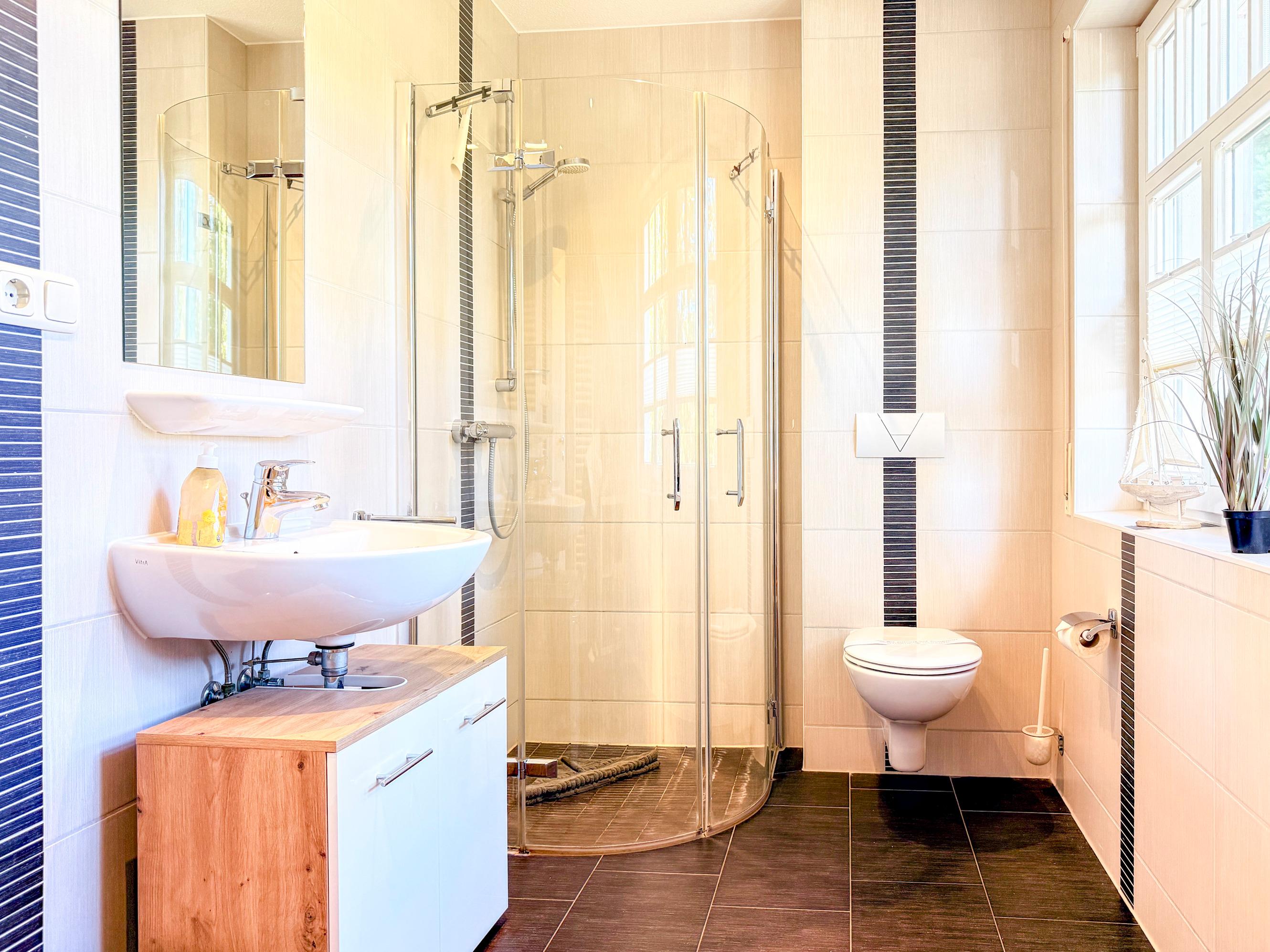 Zwei moderne Badezimmer mit Dusche, Haartrockner und Fußbodenheizung