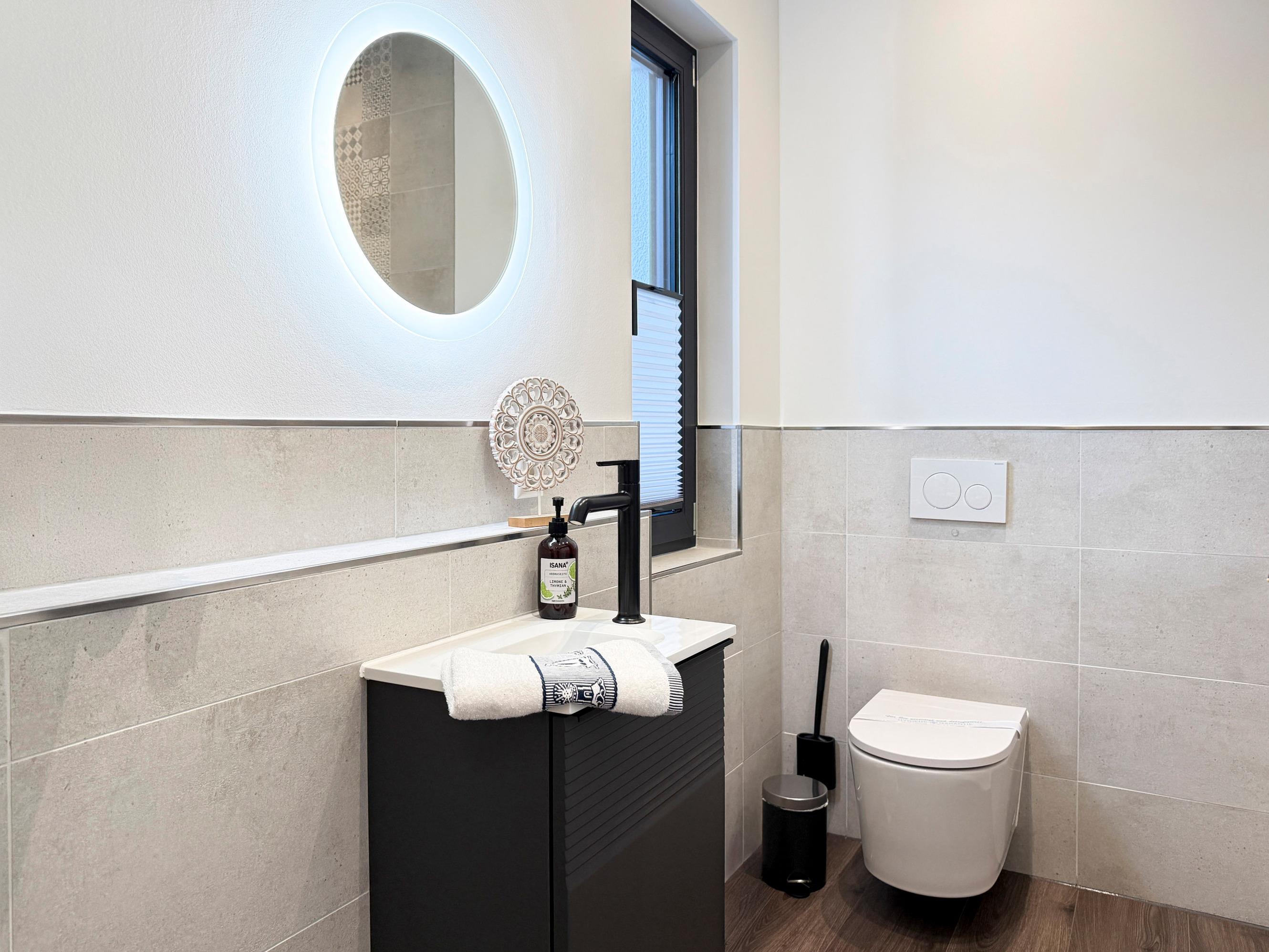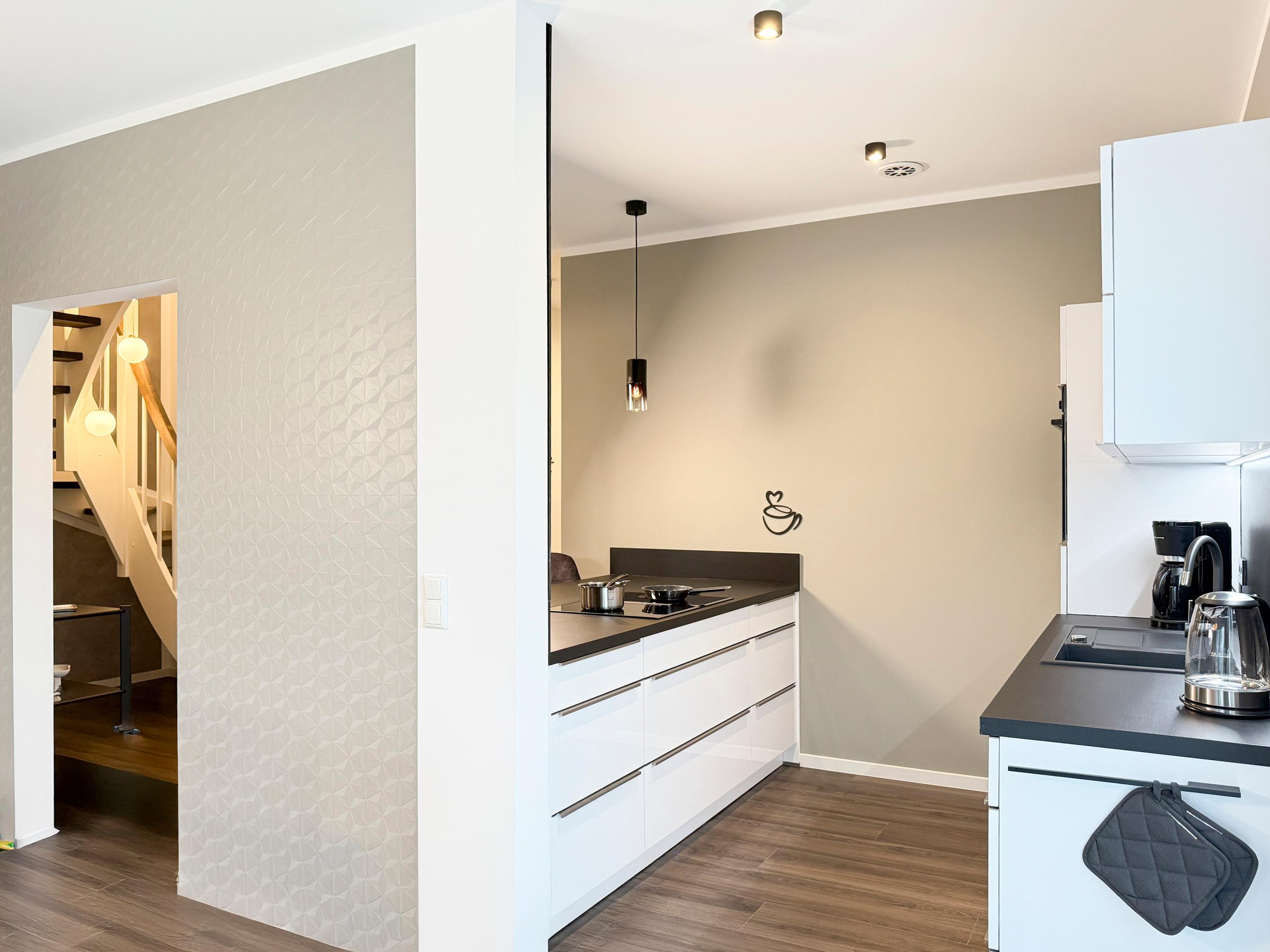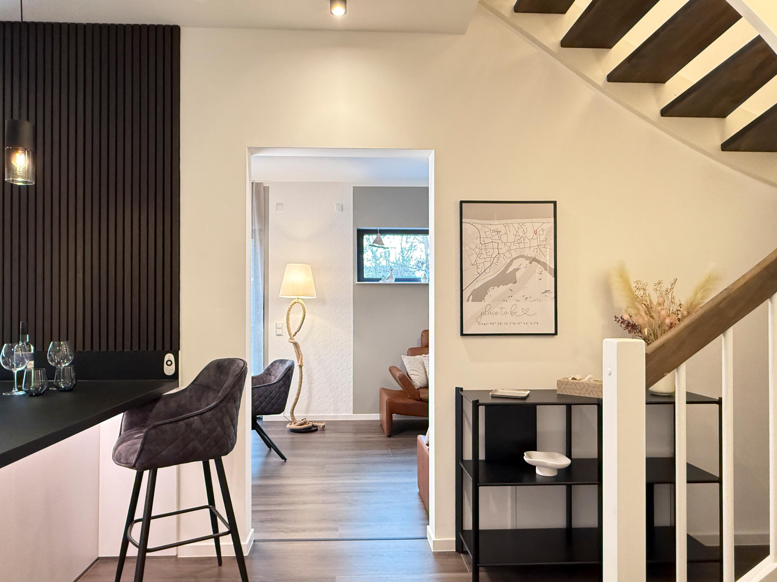 Das Ferienhaus Kleine Auszeit empfängt Sie mit einer gemütlichen und modernen Einrichtung. Der helle Wohn- und Essbereich ist der perfekte Ort, um den Tag entspannt ausklingen zu lassen – ob bei einem guten Buch oder einem gemeinsamen Filmabend. In der voll ausgestatteten Küchenzeile können Sie mühelos Ihre Lieblingsgerichte zubereiten.