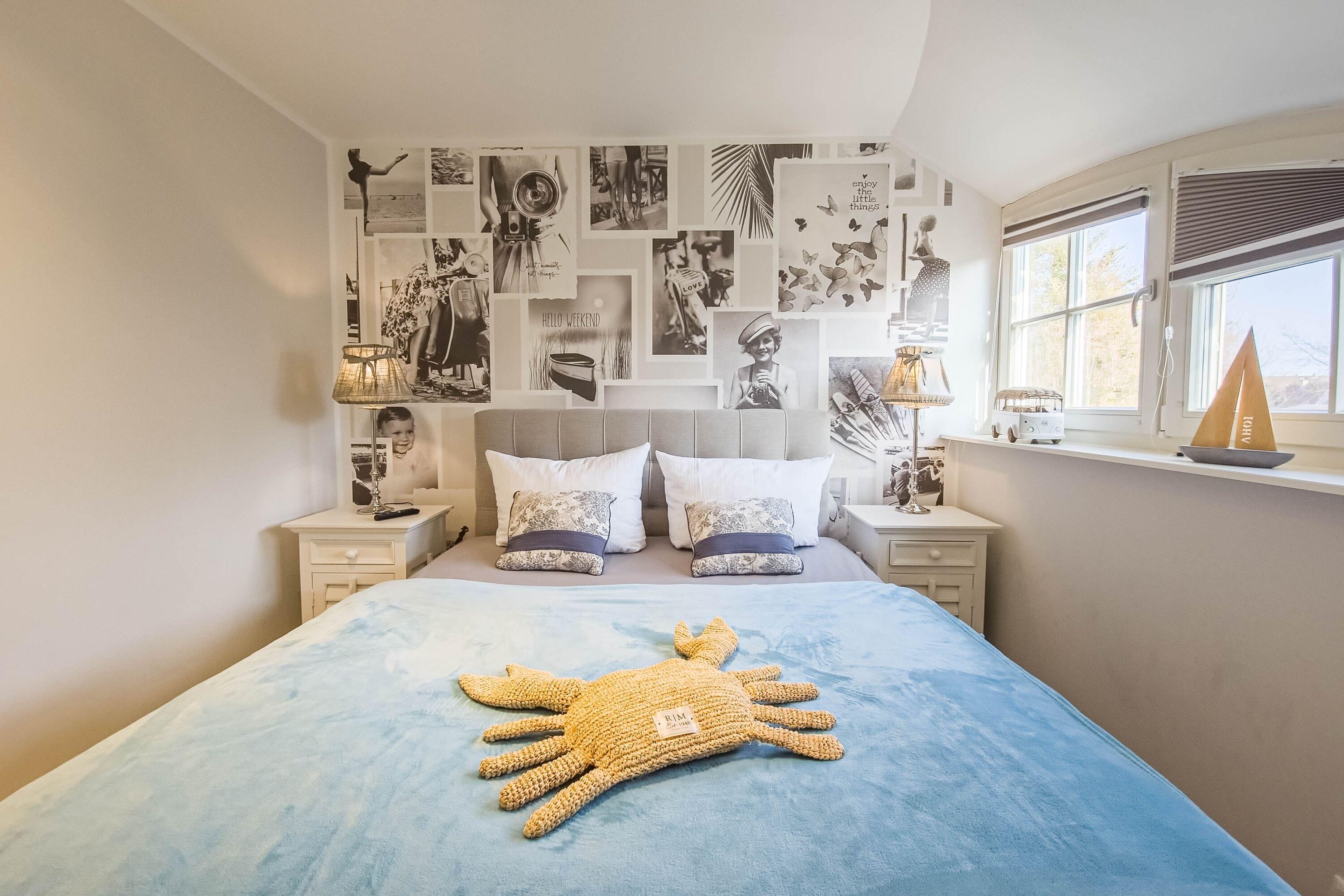 Im Obergeschoss finden Sie drei liebevoll eingerichtete Schlafzimmer, die mit Boxspringbetten und Fliegengittern ausgestattet sind. Verdunklungsmöglichkeiten sorgen für erholsamen Schlaf, während moderne Badezimmer mit Fußbodenheizung und ebenerdiger Dusche Komfort bieten.
