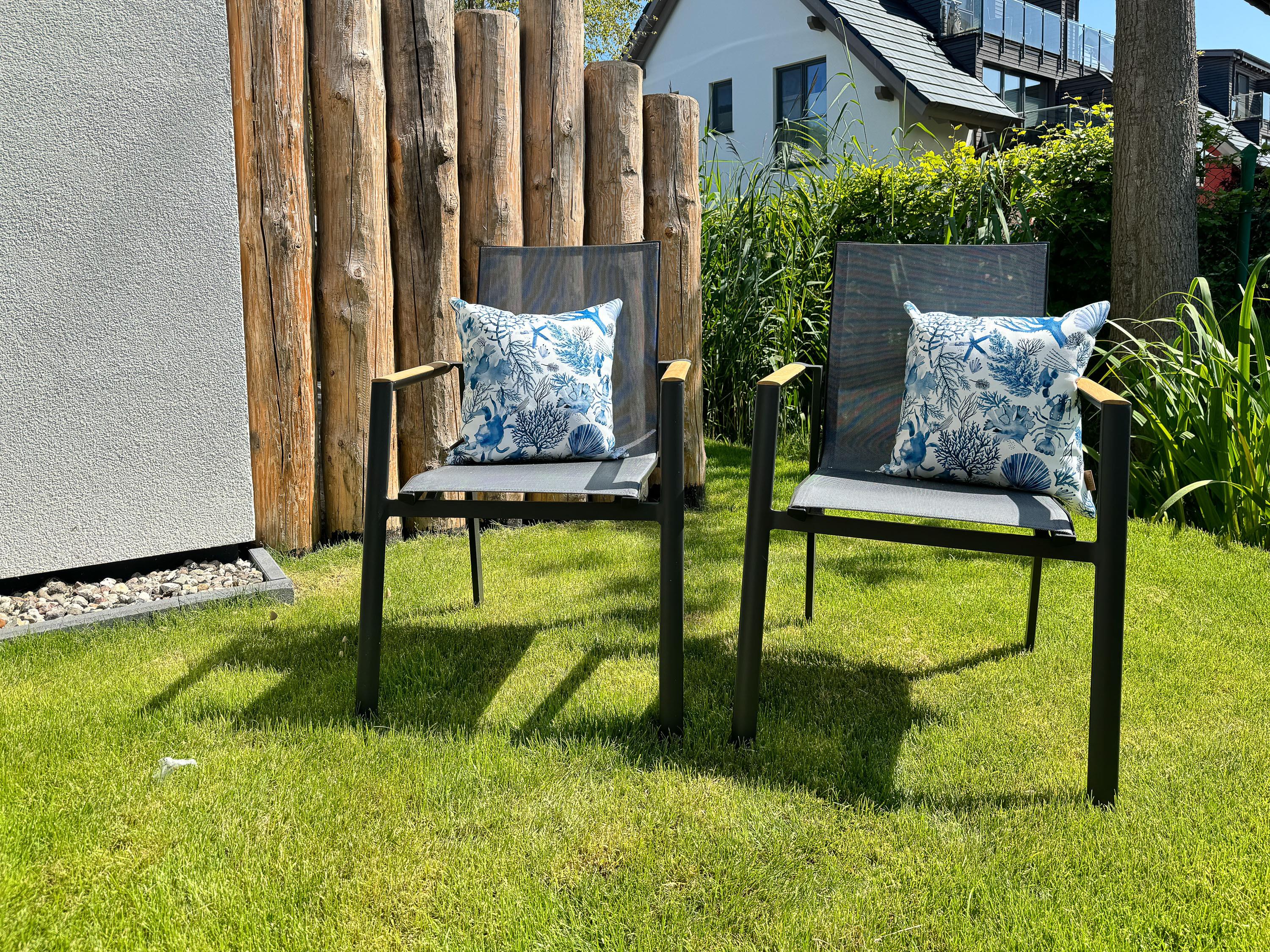 Die offene Küche ist bestens ausgestattet und ermöglicht gemütliche Kochmomente zu zweit, während die Terrasse mit Gartenblick zum Lieblingsplatz für entspannte Stunden an der frischen Ostseeluft wird.