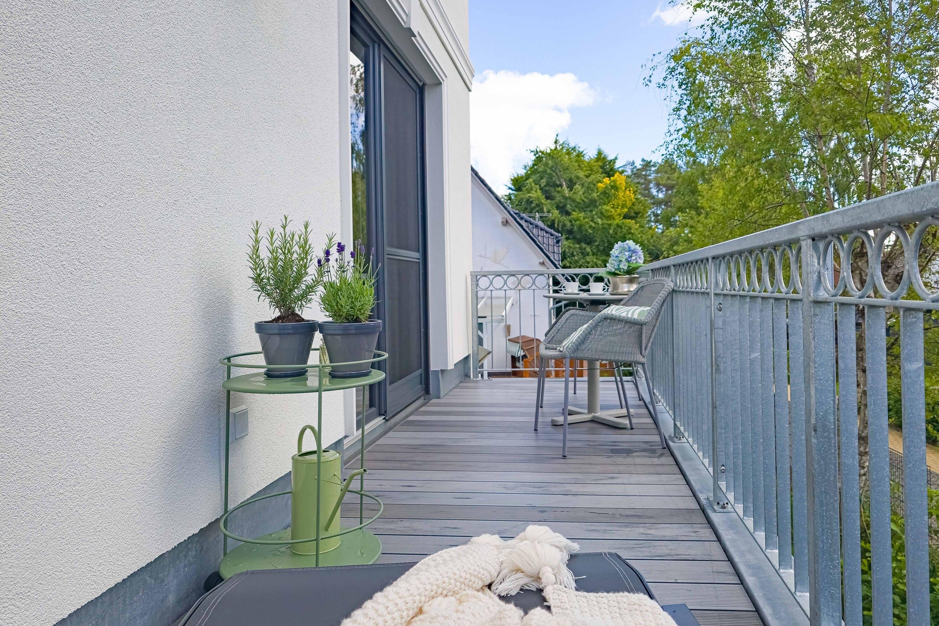 Sonniger Balkon mit Liegen [&] Sonnenschirm