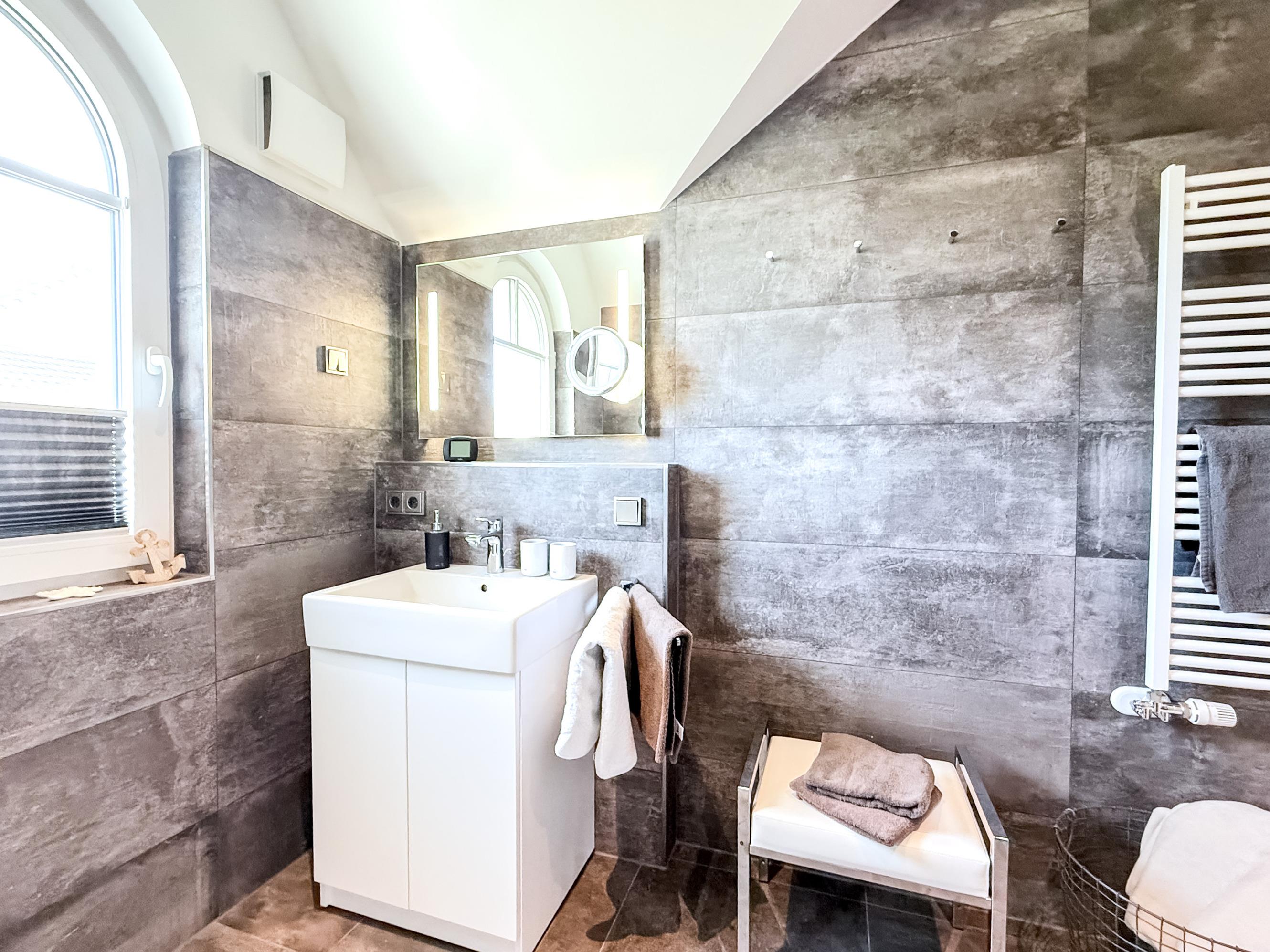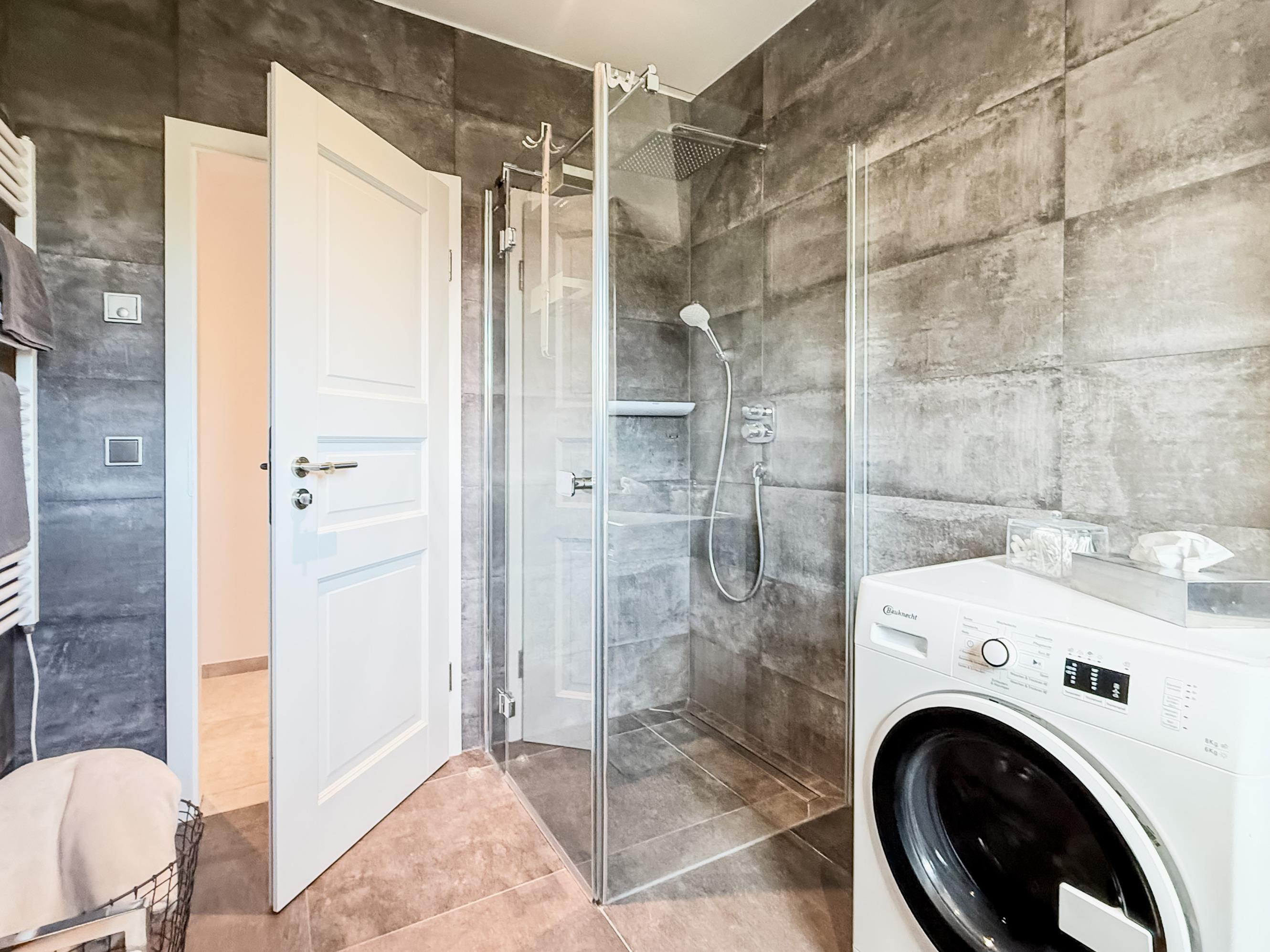 Badezimmer: Modernes Bad mit ebenerdiger Dusche, Handtuchtrockner, Föhn und Fußbodenheizung