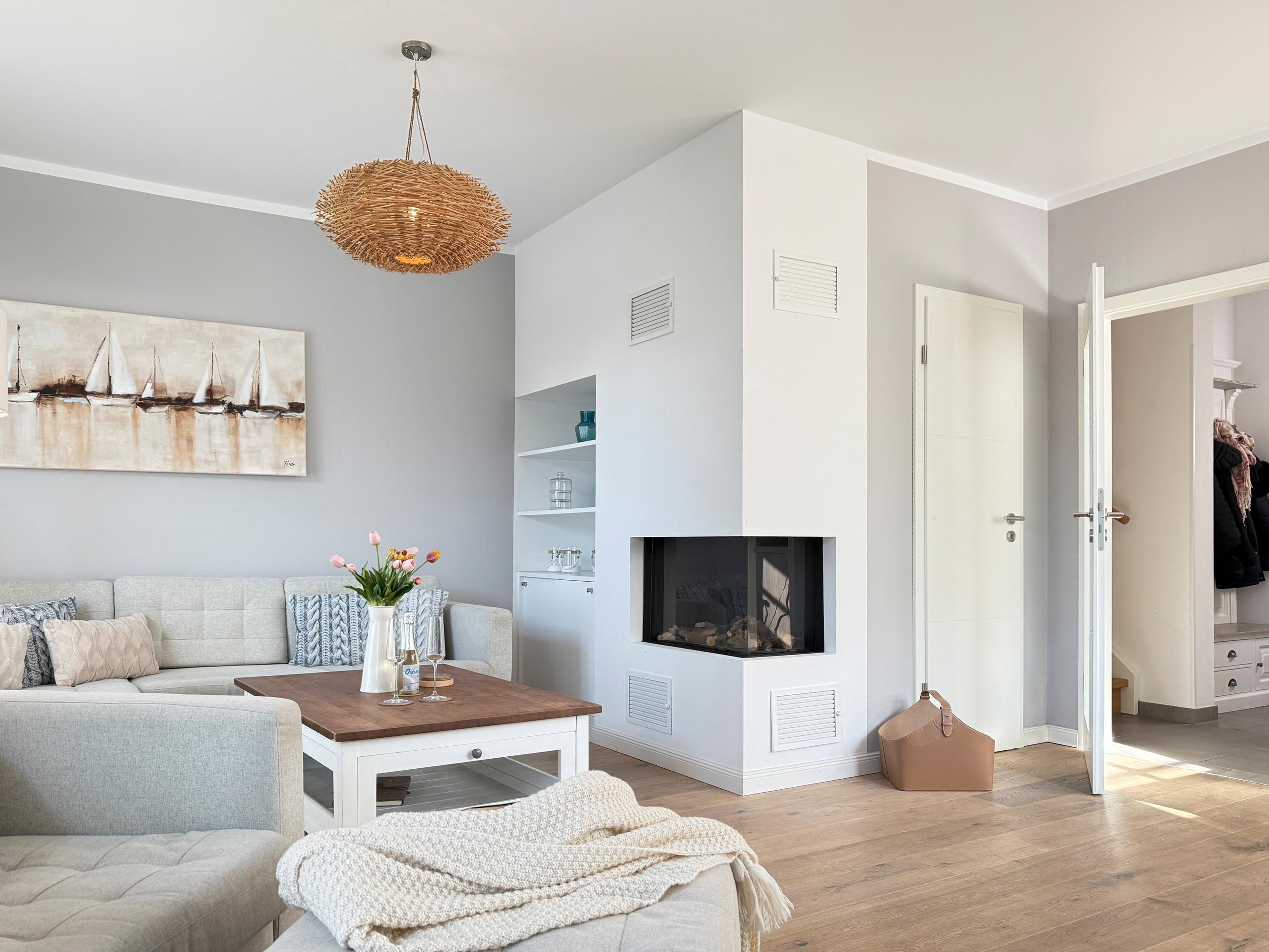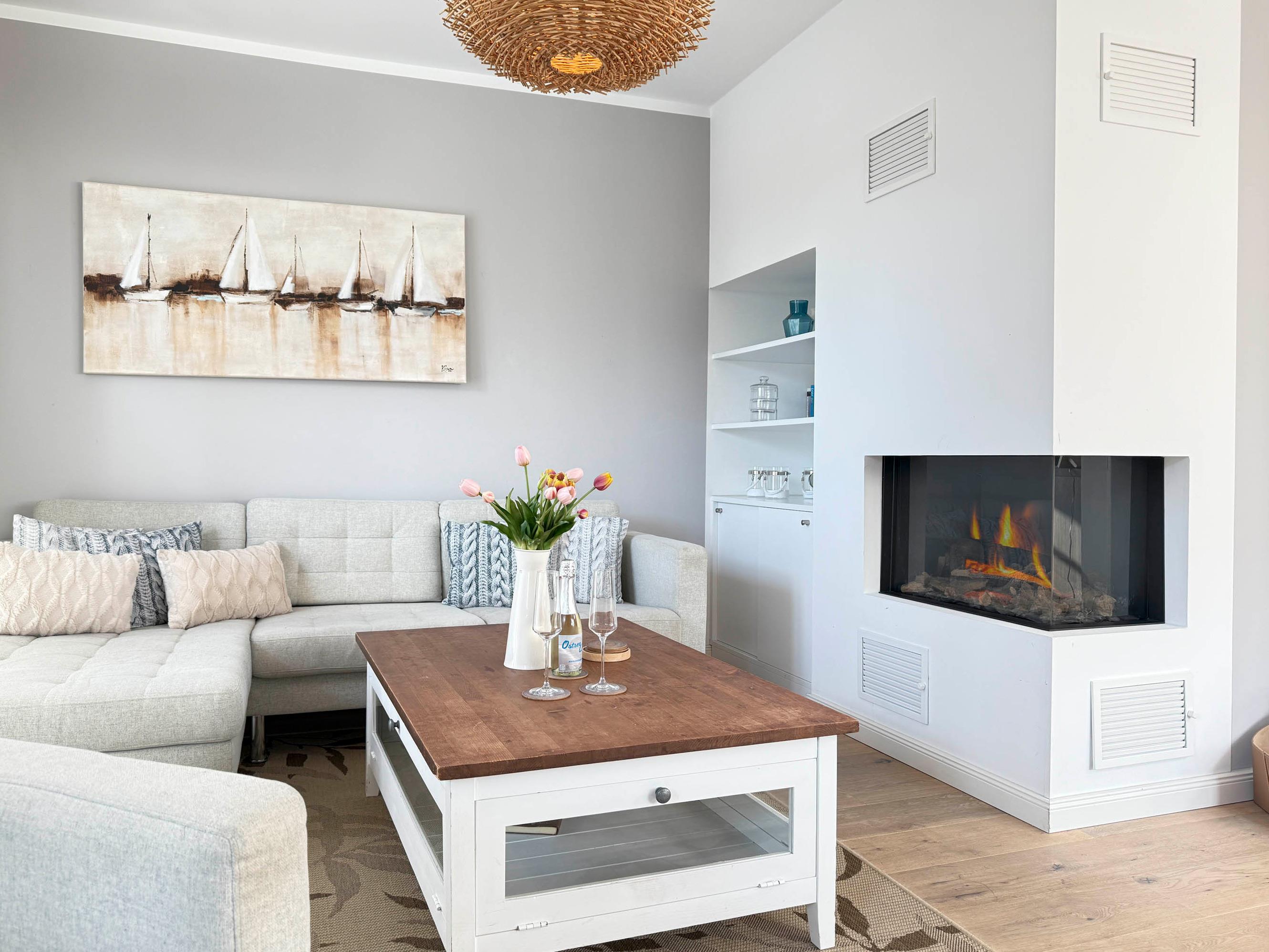 Gemütlicher Wohnbereich mit Gaskamin, bequemer Sitzgruppe und Flachbild-TV