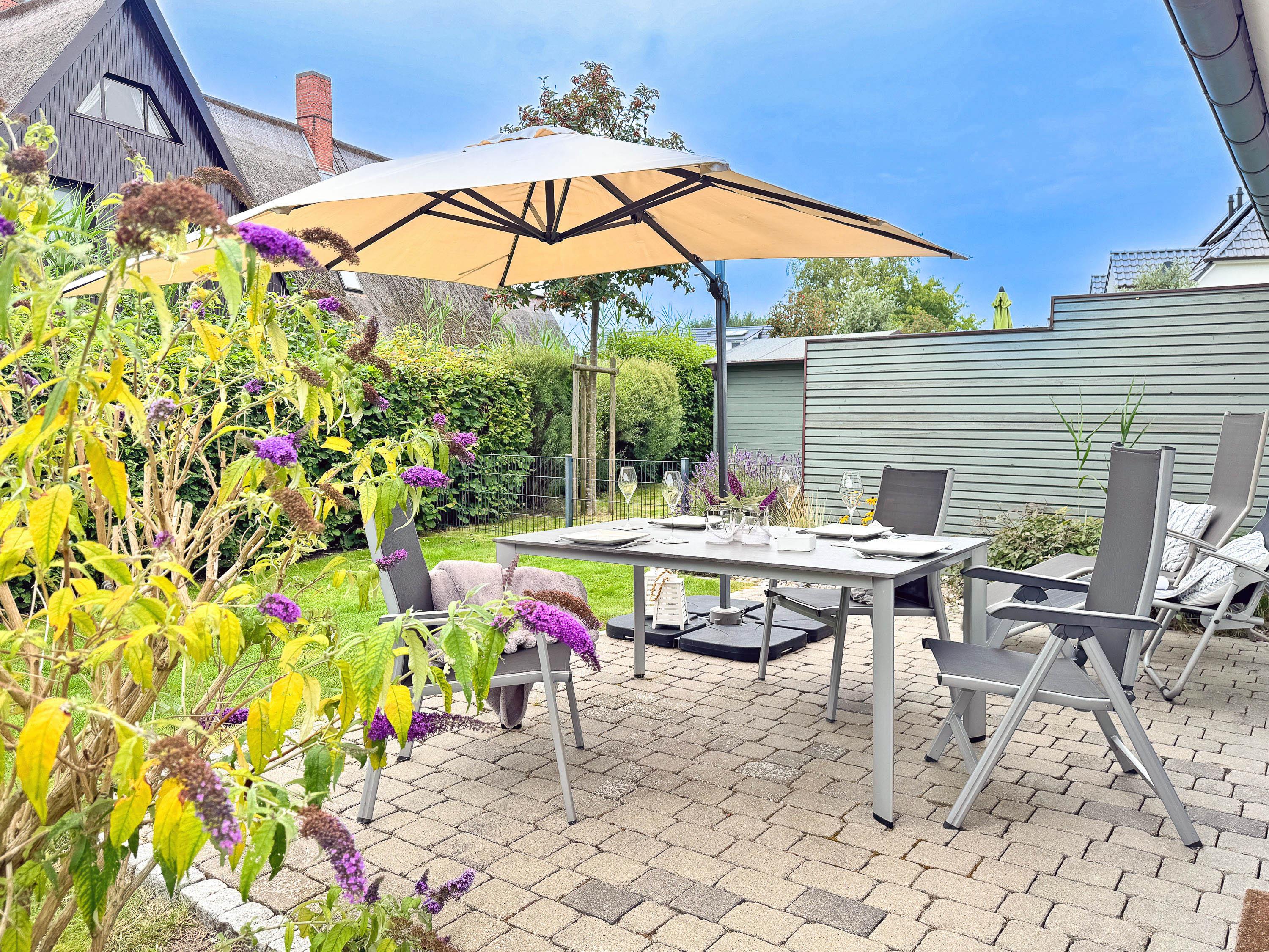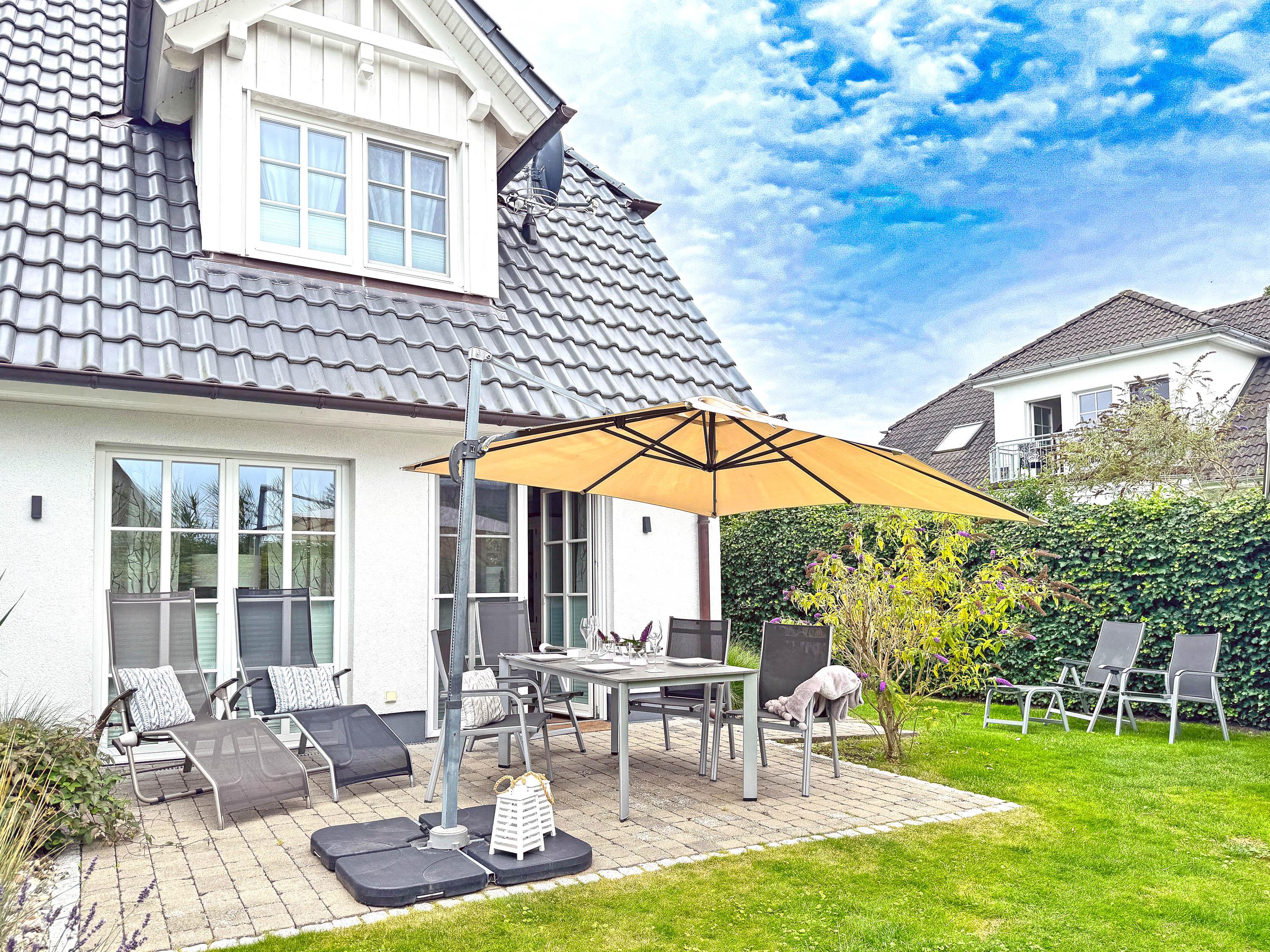 Private West-Terrasse mit Gartenmöbeln und Liegewiese – perfekt für entspannte Stunden im Freien