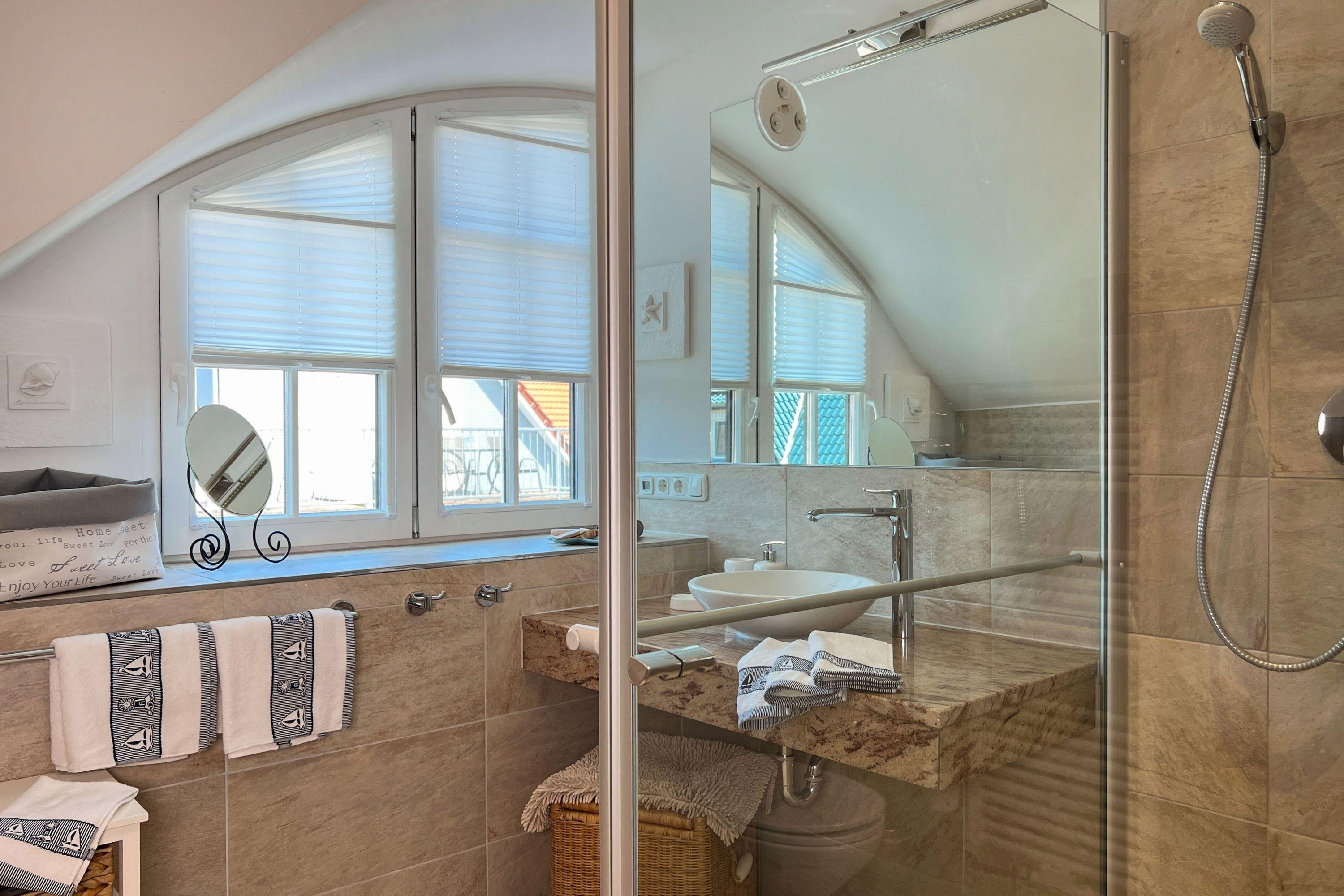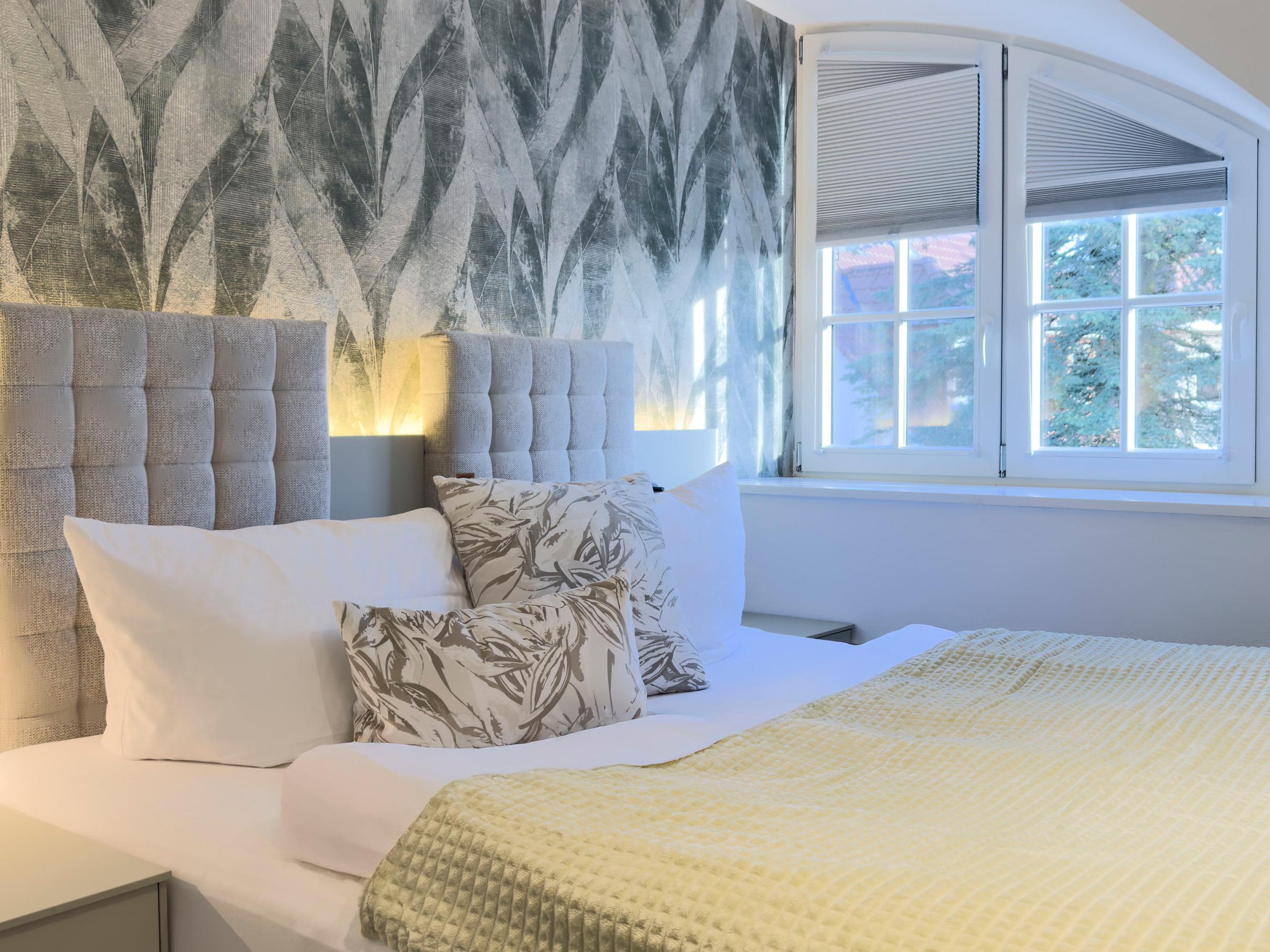 Zwei liebevoll eingerichtete Schlafzimmer sorgen für erholsame Nächte, während die modernen Badezimmer mit klaren Linien und hochwertigen Materialien ein Gefühl von Ruhe und Eleganz vermitteln.
