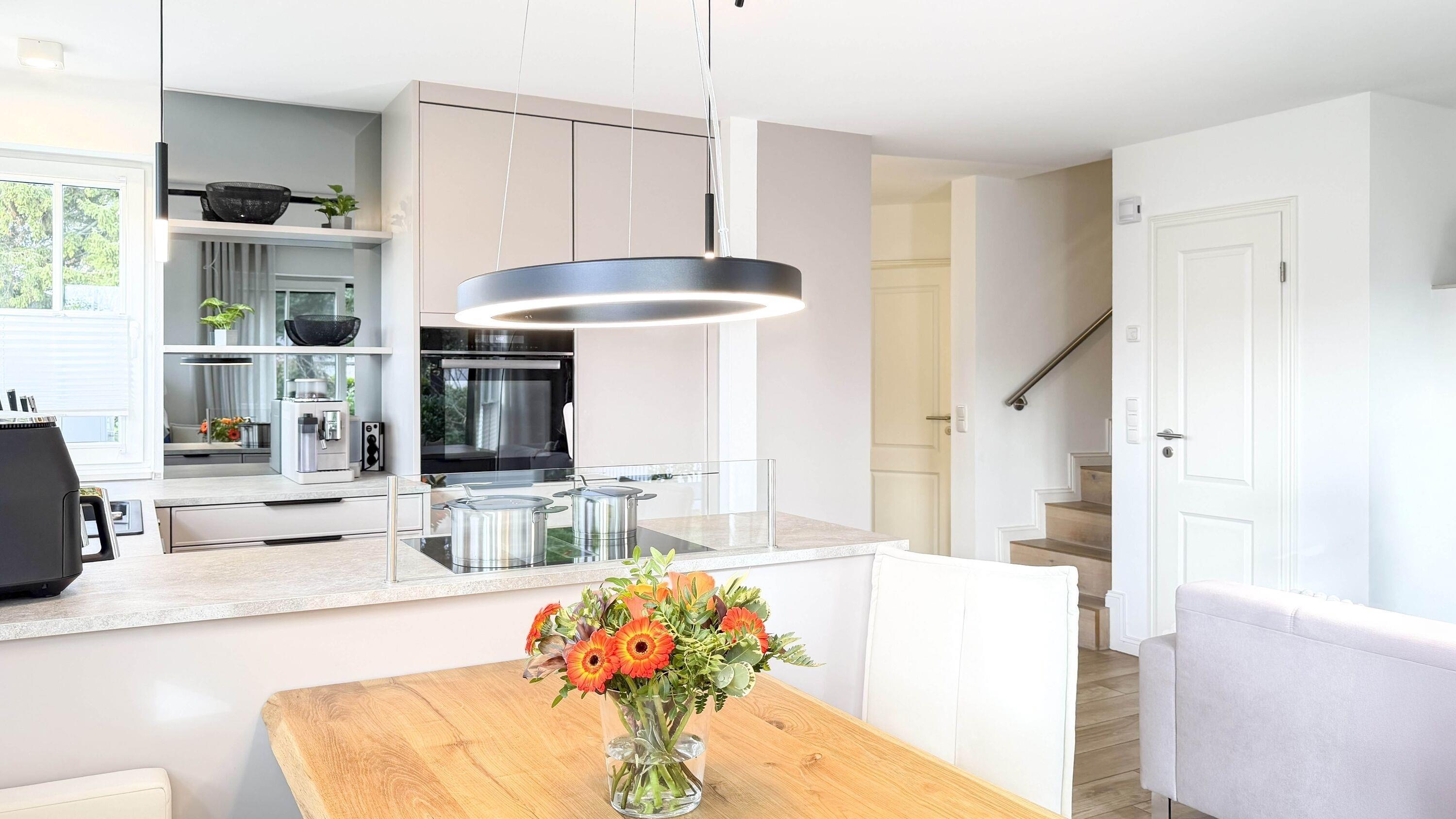 Die exklusive Küche in U-Form lädt zu kulinarischen Momenten ein: ausgestattet mit hochwertigem BORA-Kochfeld, Backofen mit Mikrowellenfunktion, großer Kühl-Gefrierkombination, Kaffeevollautomat, Airfryer, Geschirrspüler und einer umfangreichen Küchenausstattung, bleiben hier keine Wünsche offen.