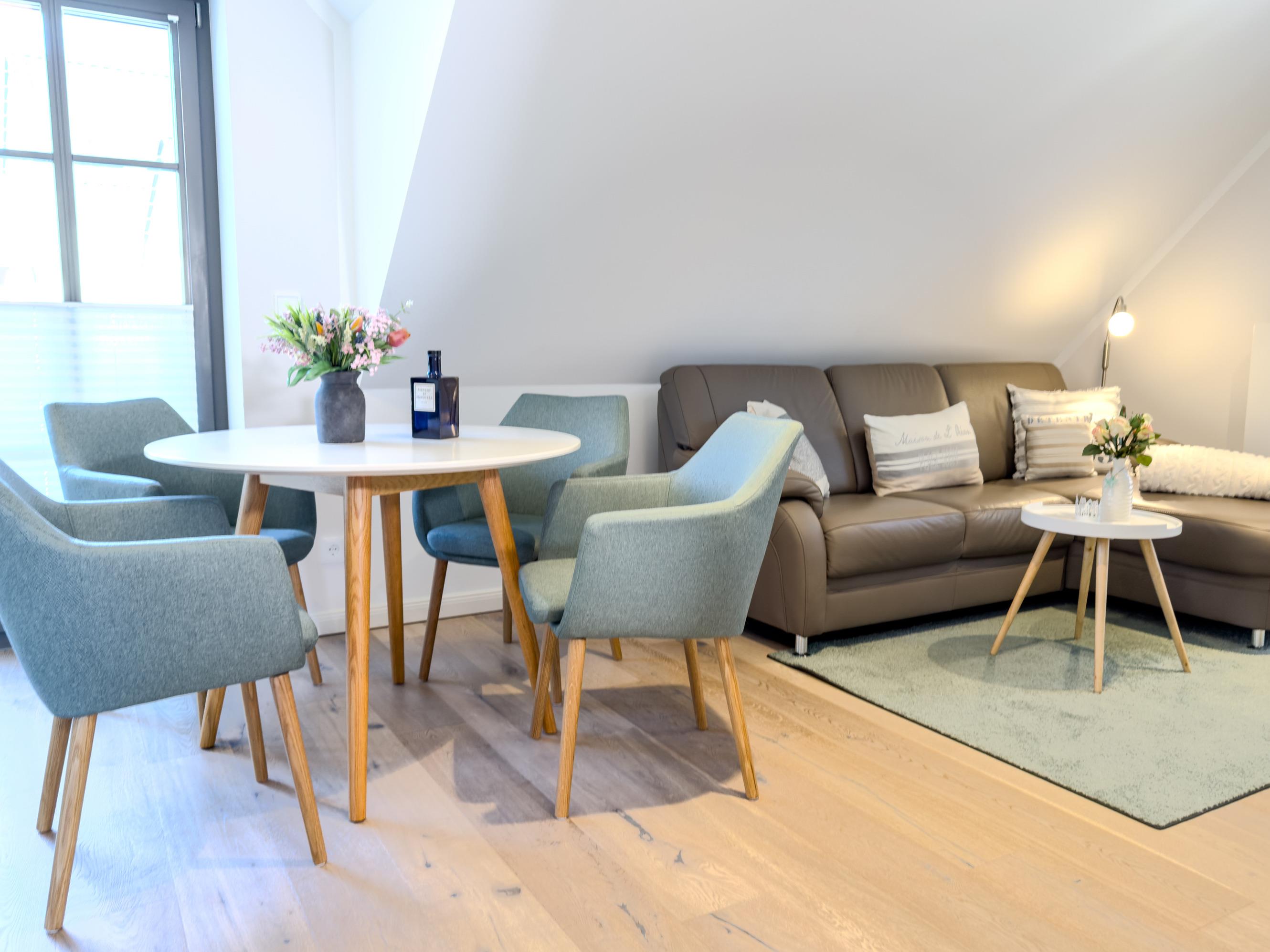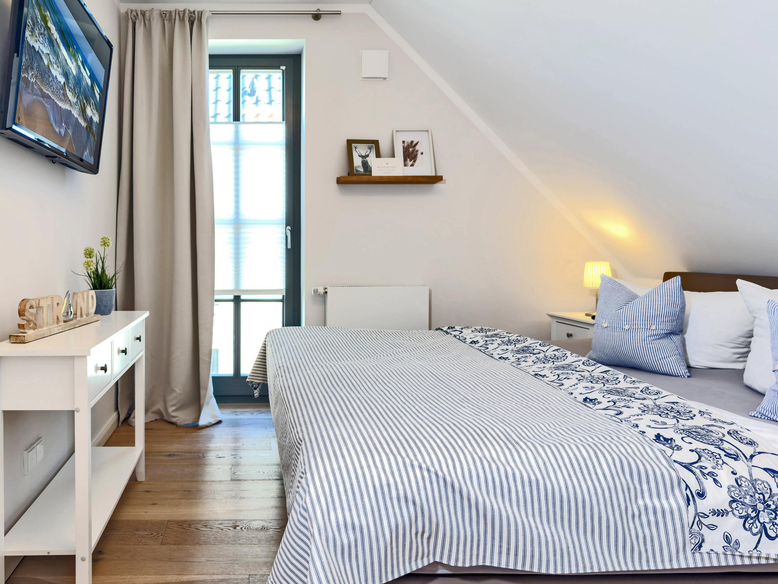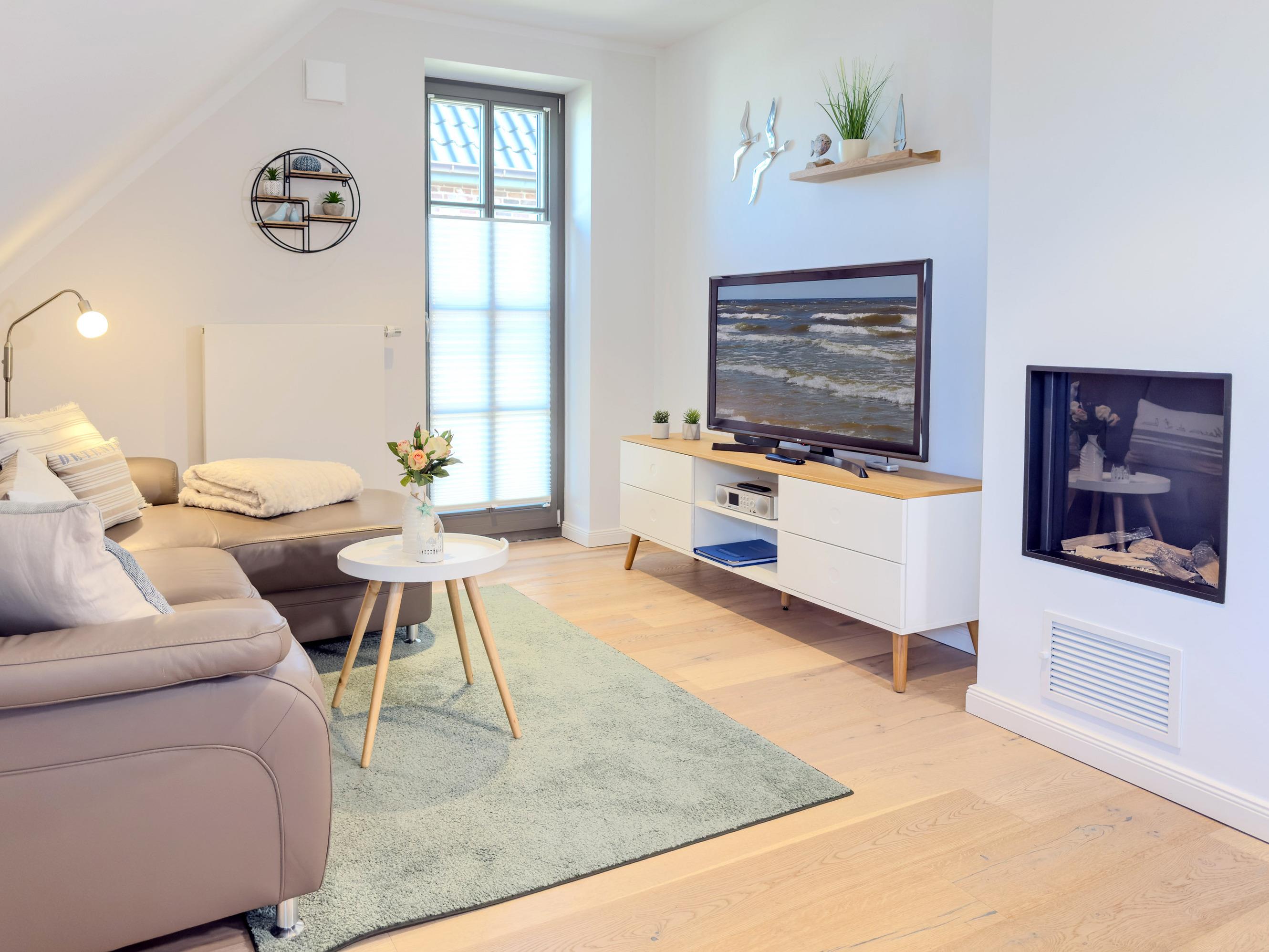 Die Ferienwohnung Strandglück empfängt Sie mit einer modernen und einladenden Atmosphäre. Der offene Wohn- und Essbereich mit Gaskamin bietet den perfekten Ort für entspannte Abende. Die voll ausgestattete Küche verfügt über moderne Geräte wie Backofen, Kochfeld, Geschirrspüler, Mikrowelle, Kühlschrank, Toaster, Wasserkocher und Filterkaffeemaschine, sodass Sie mühelos kulinarische Köstlichkeiten zubereiten können. Die beiden separaten Schlafzimmer sorgen für erholsamen Schlaf.