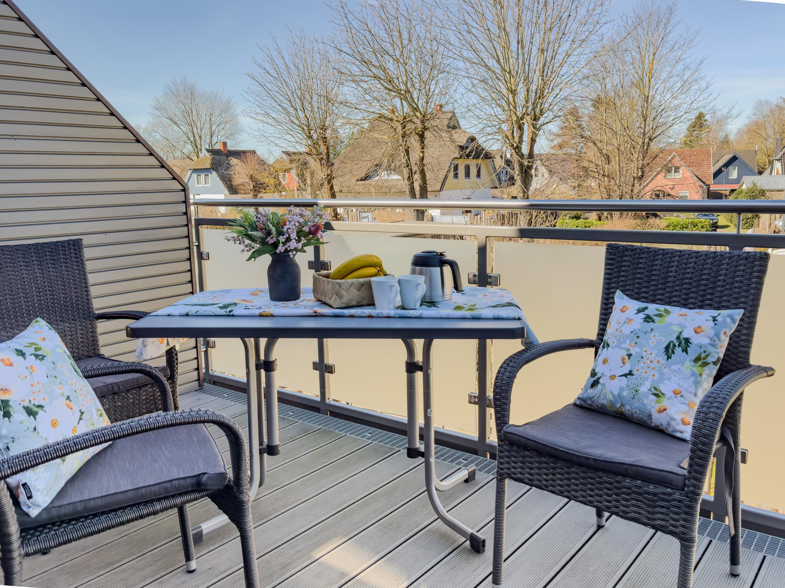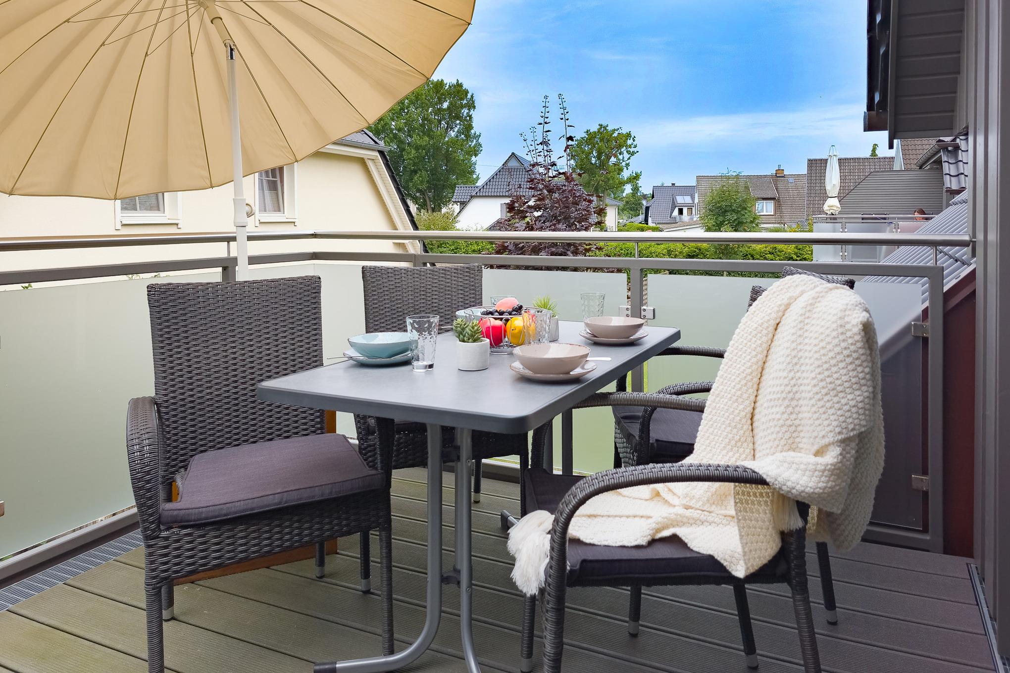 Genießen Sie die frische Ostseeluft auf dem großzügigen Balkon mit Blick ins Grüne. Hier können Sie den Tag mit einem Frühstück im Freien beginnen oder abends bei einem Glas Wein ausklingen lassen.