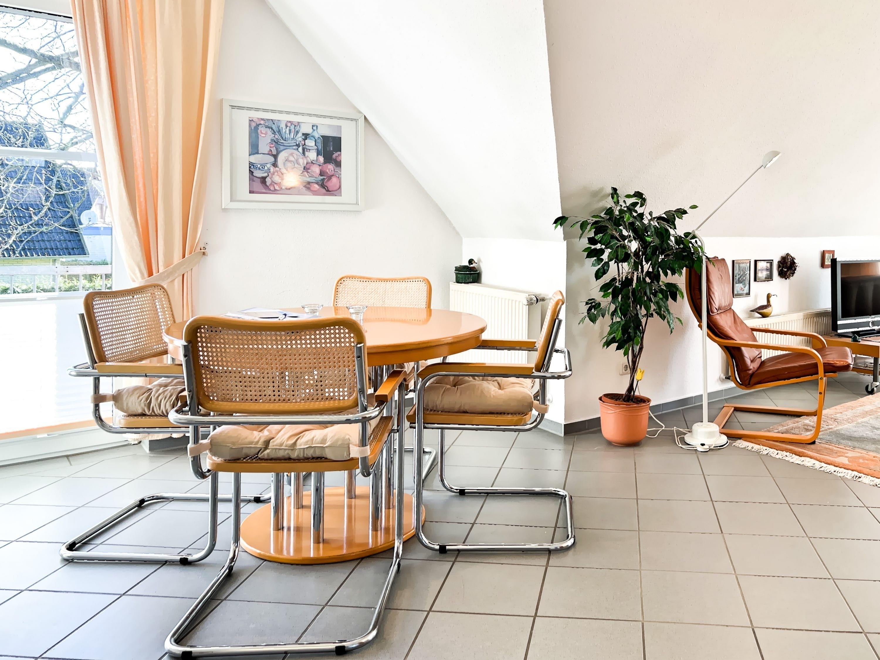Heller Wohn- und Essbereich mit bequemer Sitzgruppe und Flachbild-TV