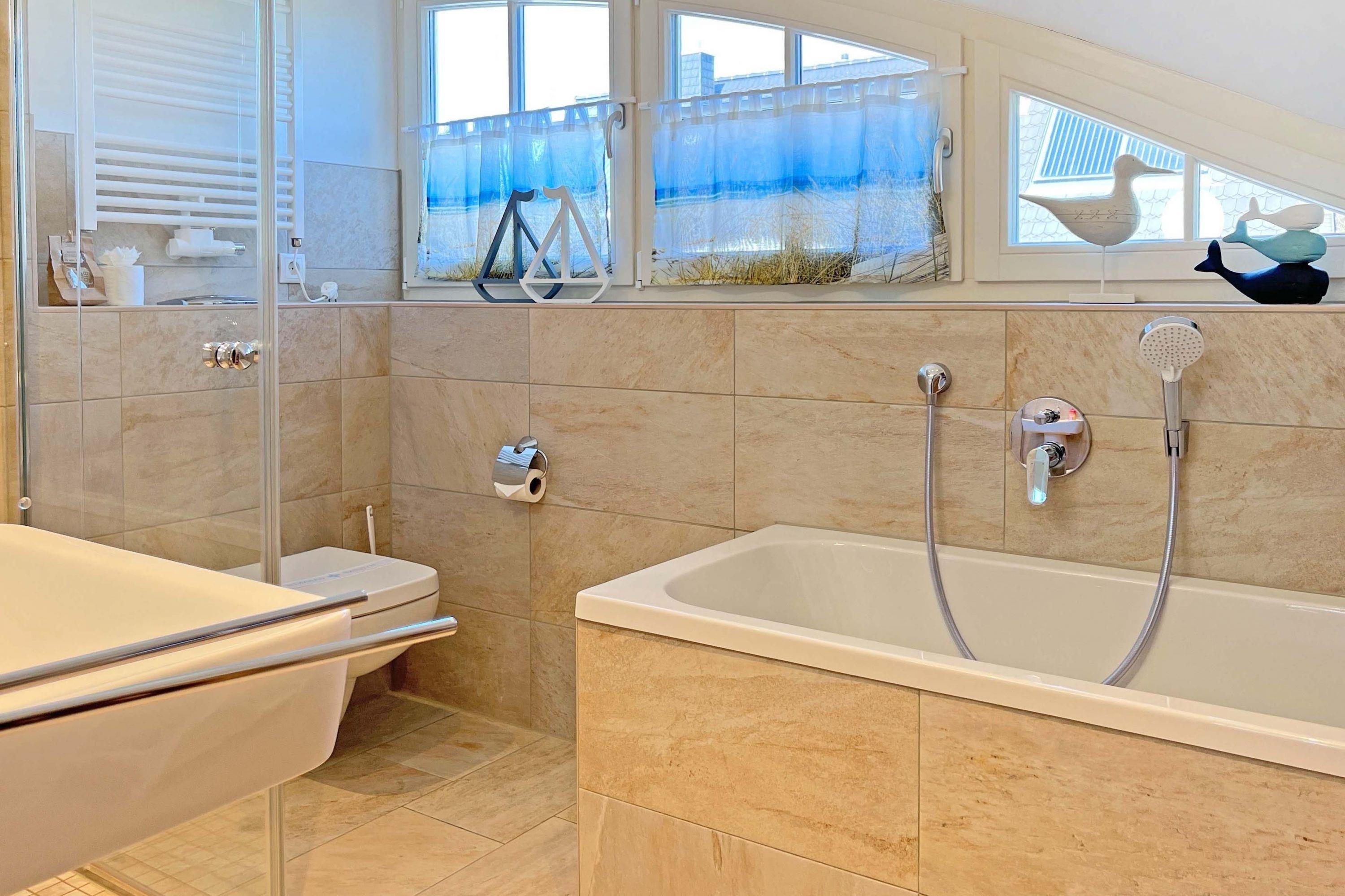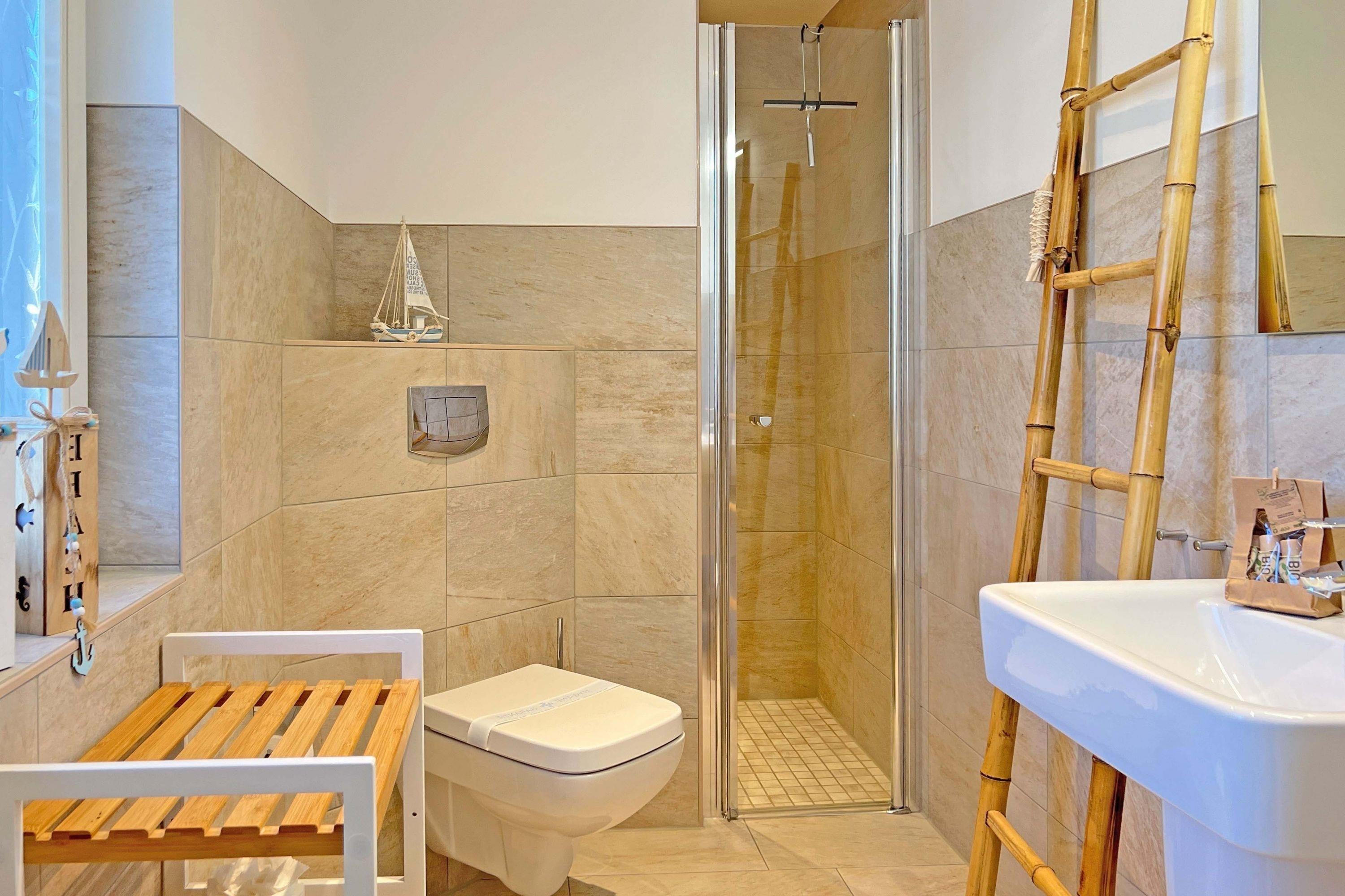 Zwei Badezimmer: eines im Erdgeschoss mit Dusche, eines im Obergeschoss mit Dusche und Badewanne