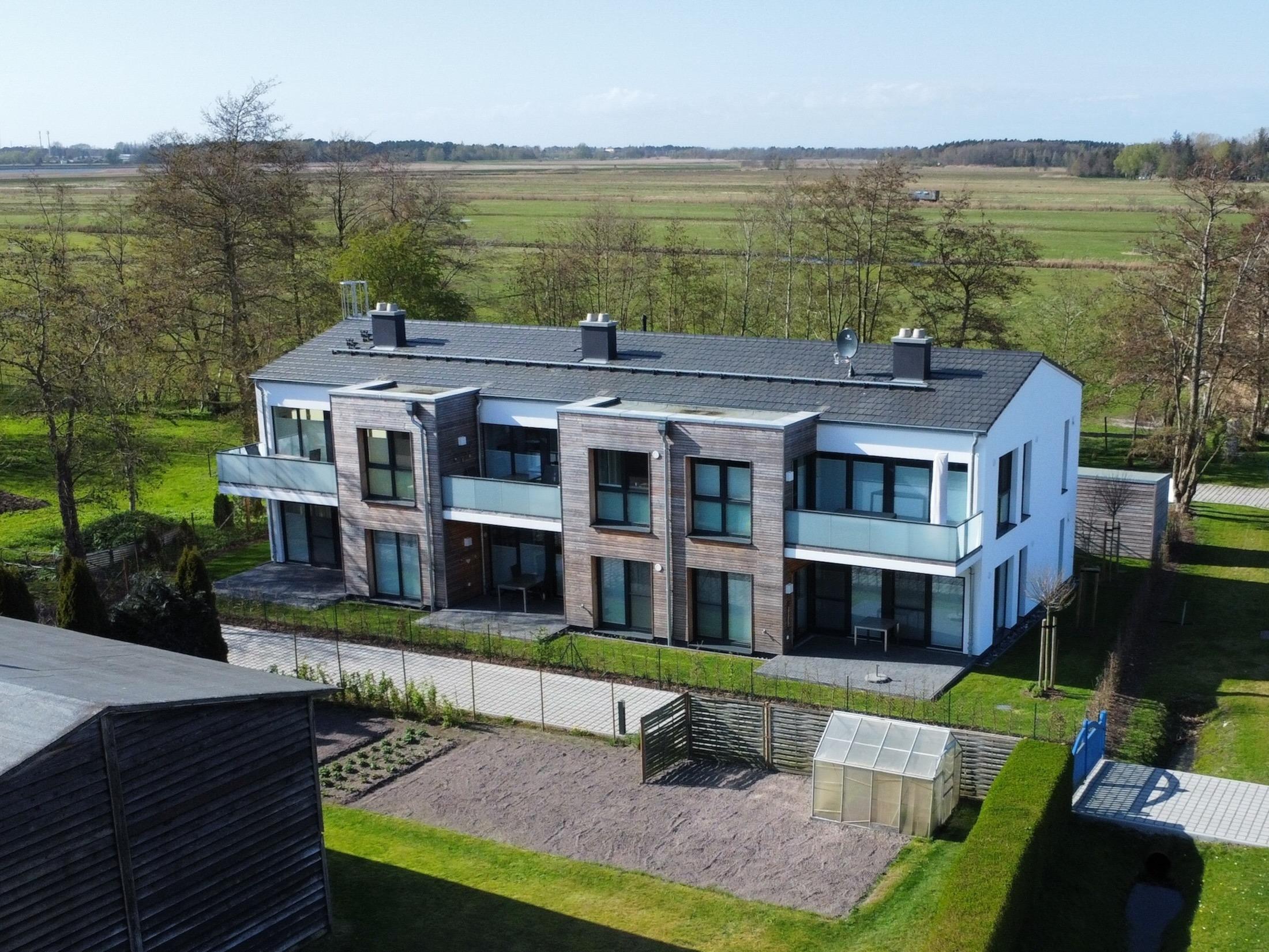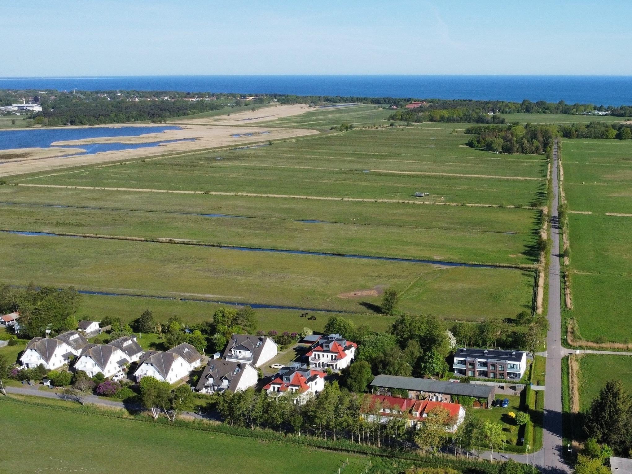Moderne Ferienwohnung in ruhiger Naturlage zwischen Bodden und Ostsee. Großer Balkon mit Blick auf Kranichflüge zur Vogelinsel Kirr, Kamin, Boxspringbetten, WLAN, Fahrradschuppen. Ideal für Strandurlauber, Naturliebhaber, Radfahrer und Vogelfreunde am Nationalpark Vorpommersche Boddenlandschaft.