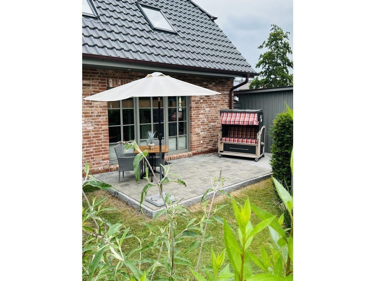 Auf der terasse befindet sich ein Tisch mit Stühlen , sowie ein Strandkorb
