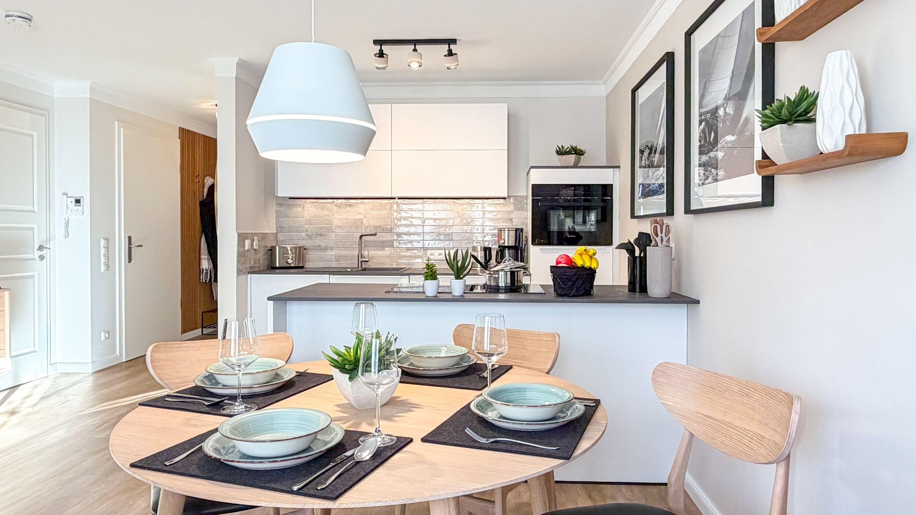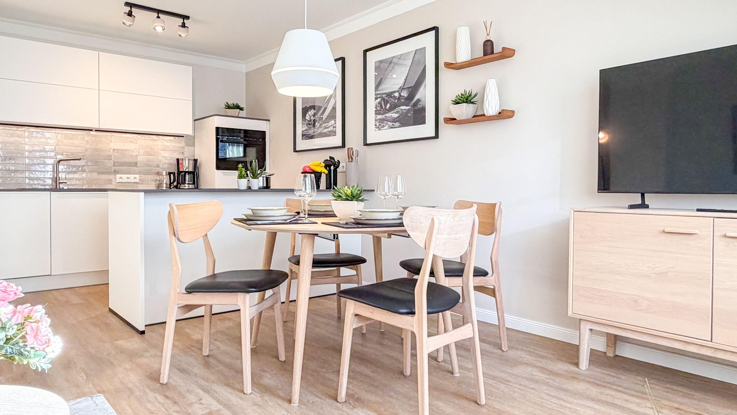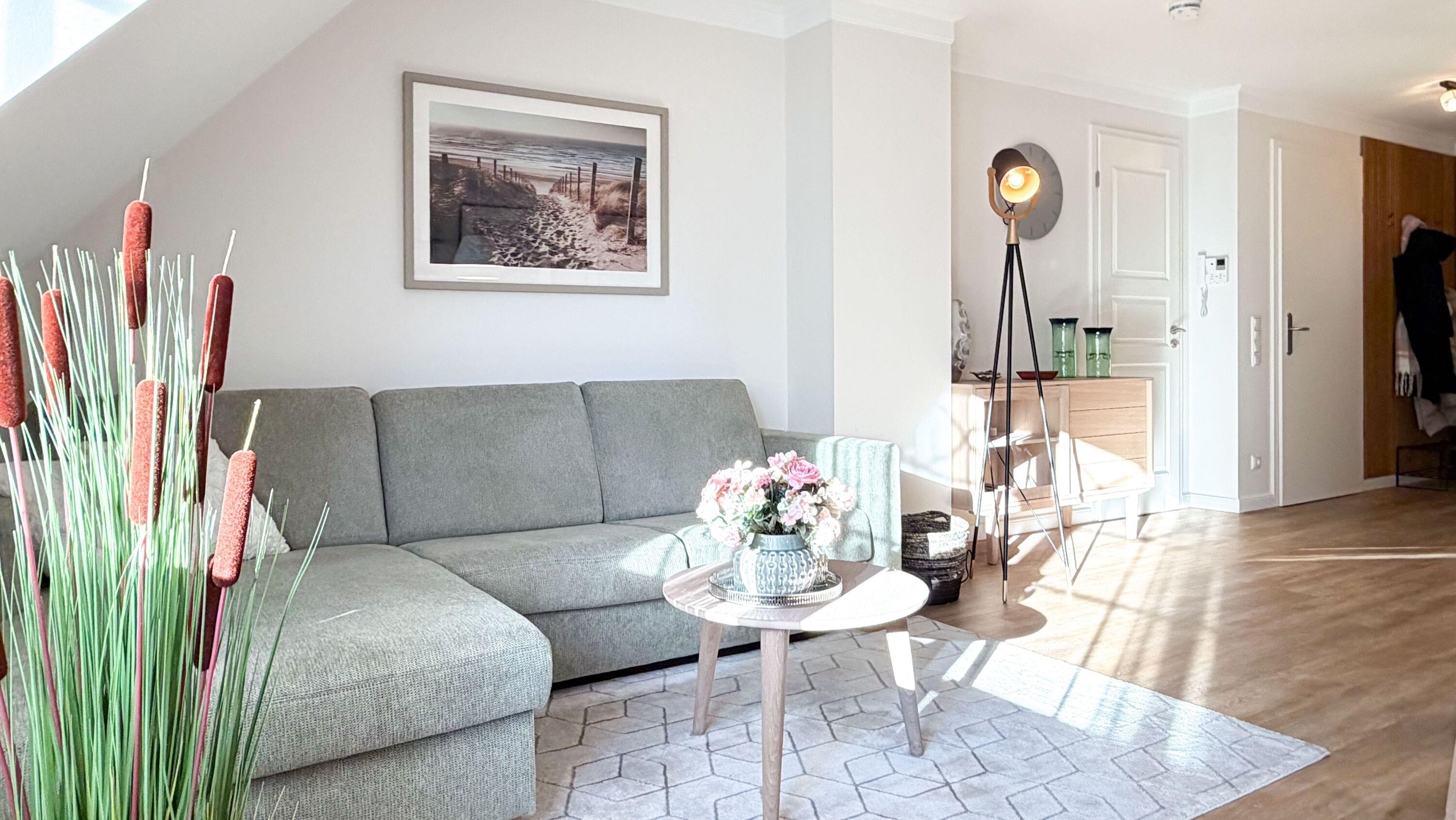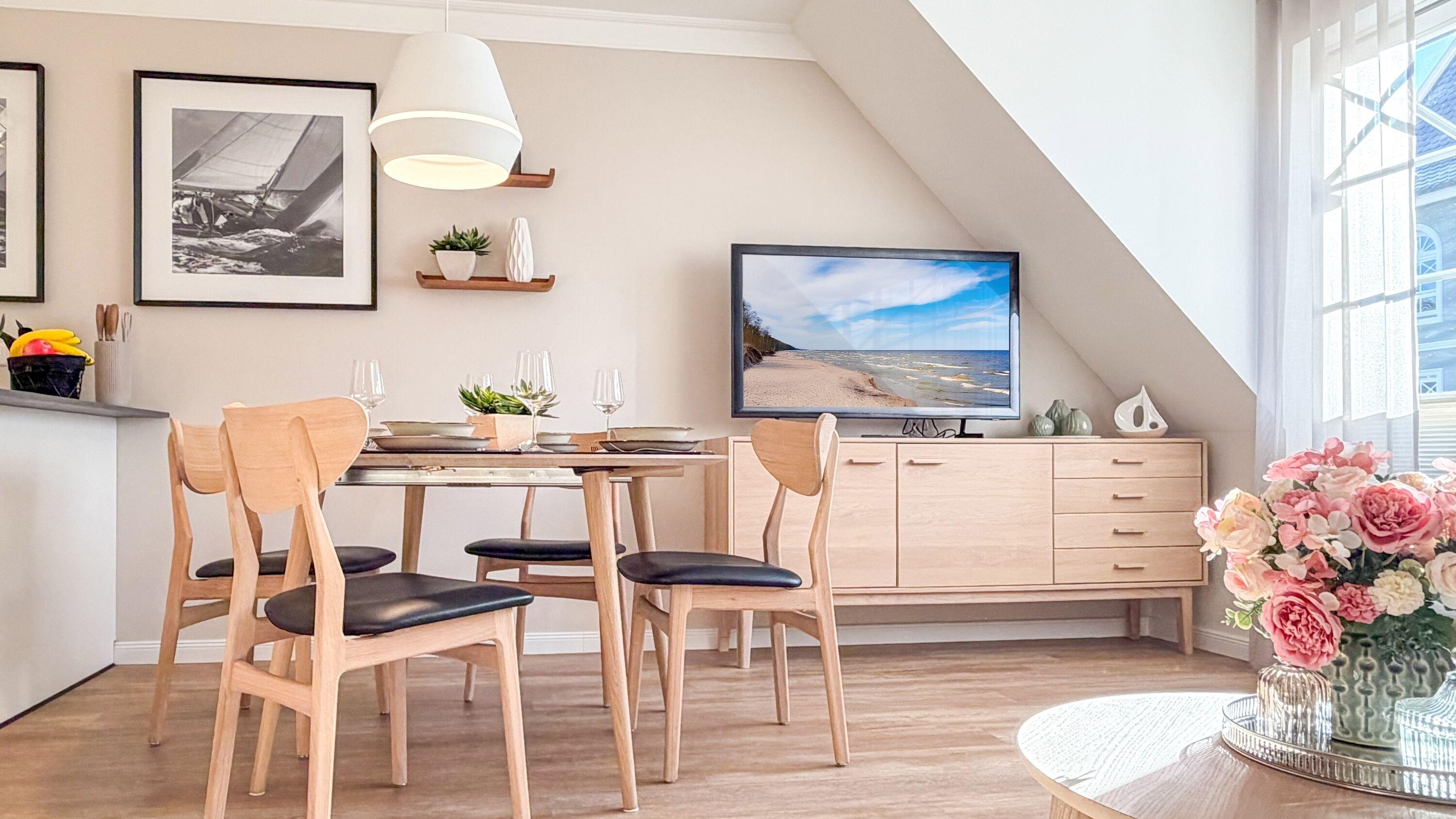 Die Ferienwohnung Gracieuse empfängt Sie mit einer hellen, freundlichen Atmosphäre und einem modernen, klaren Einrichtungsstil. Der großzügige Wohnbereich lädt zum Entspannen ein – ob bei einem gemütlichen Filmabend, einem guten Buch oder einem Glas Wein nach einem Tag an der frischen Ostseeluft.