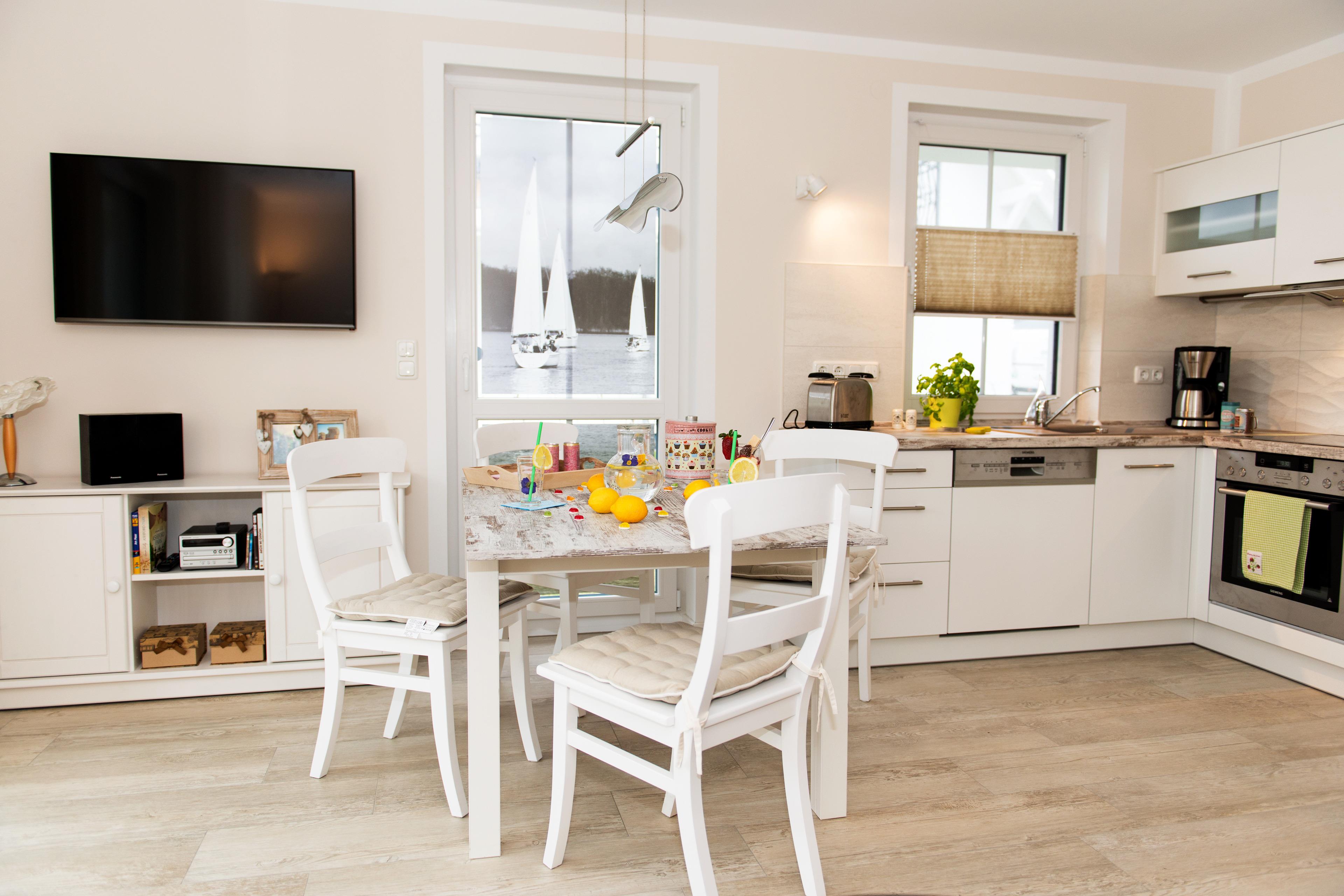 Zum großzügigen Wohnraum mit LED-Smart-TV, Hifi-Anlage, Blu-Ray-Player und Essecke gehören eine hochwertige offene Küche und eine Terrasse in Süd-/Westausrichtung mit Gartenmöbeln (inklusive Liegen). Der Wohn- und Essbereich ist dank der bodentiefen, zum Garten ausgerichteten Terrassenfenster und der in hellen Tönen gehaltenen Einrichtung lichtdurchflutet und sehr freundlich ausgestaltet.