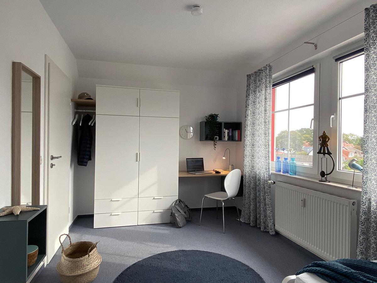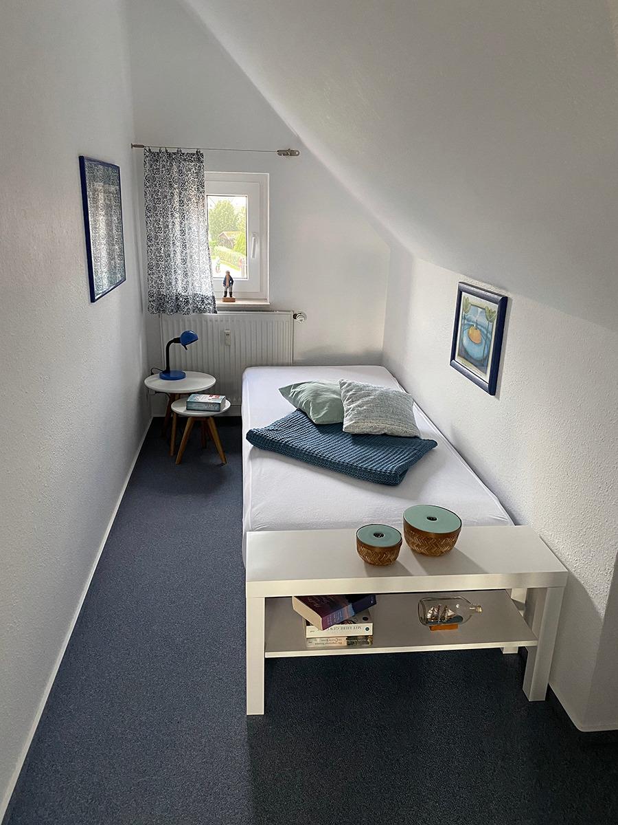 Die Ferienwohnung ist komfortabel eingerichtet und vollständig ausgestattet. mit zwei Schlafräumen (1xDoppelbett, 1x 2 getrennte Betten), zwei kleinen Schlafräumen mit je einem Einzelbett, einem Wohnbereich mit einer Küchenzeile und einem Bad mit Dusche und WC.