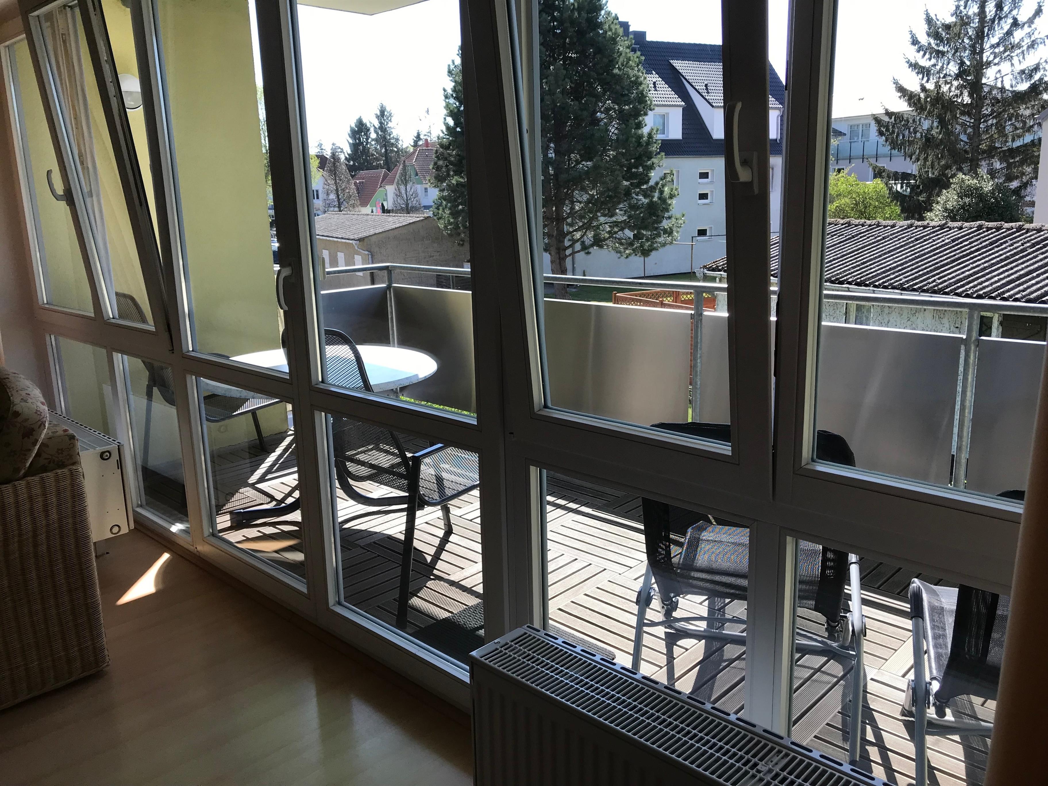 Das Apartment befindet sich im 1. Obergeschoss und besitzt einen Balkon mit Gartenmöbeln.