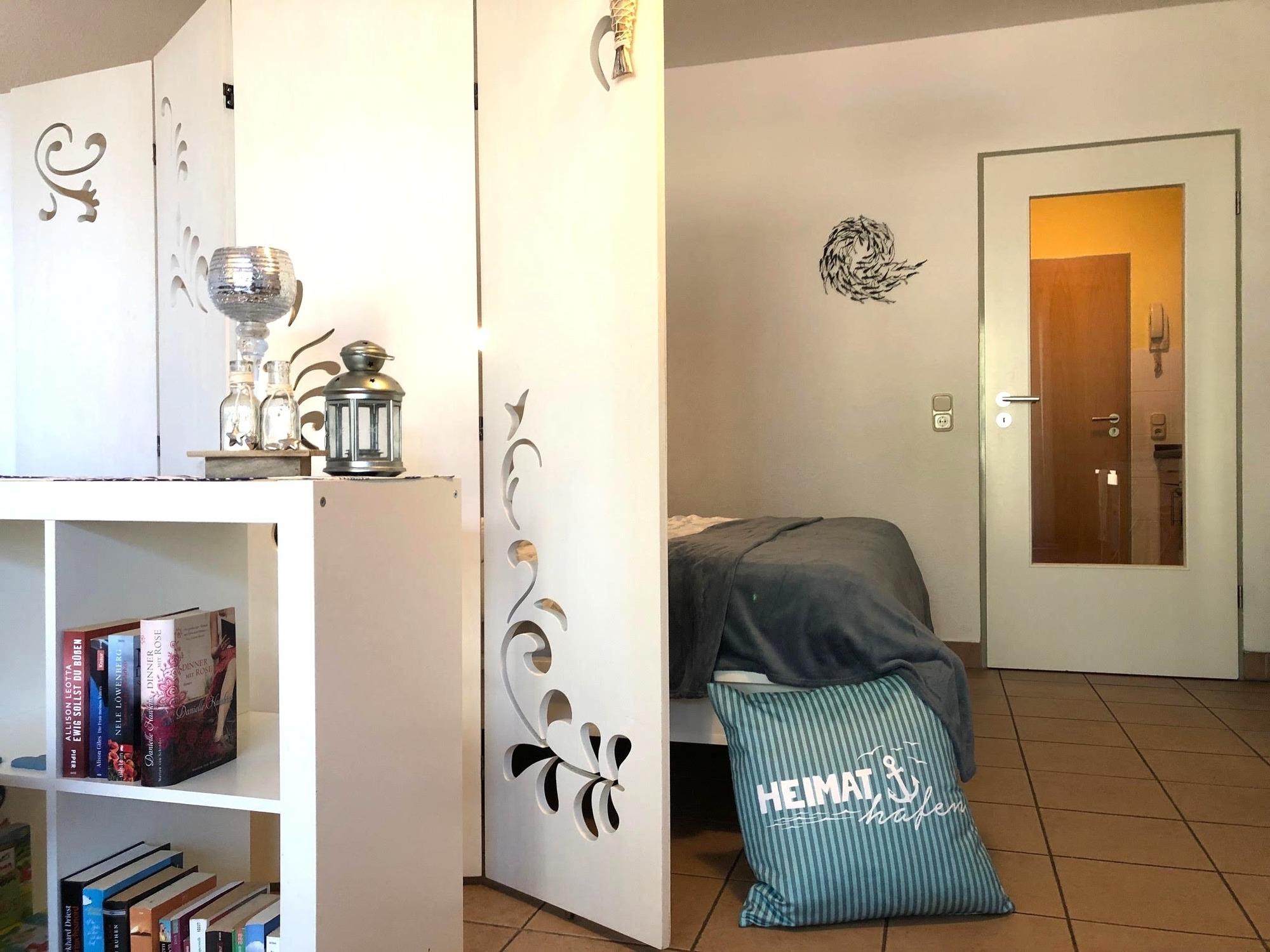 ? Wohnkomfort mit Charme – Das liebevoll eingerichtete Apartment bietet ein Doppelbett (1,60 m breit), das durch eine stilvolle spanische Wand vom Wohnbereich getrennt ist. Die Schlafcouch ergänzt die Schlafmöglichkeiten für weitere Gäste.