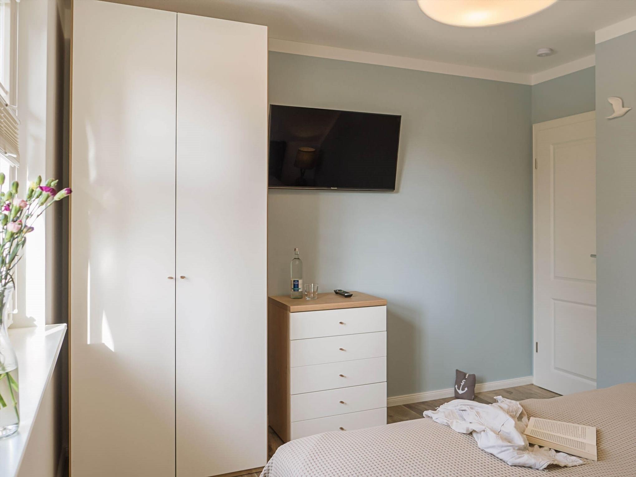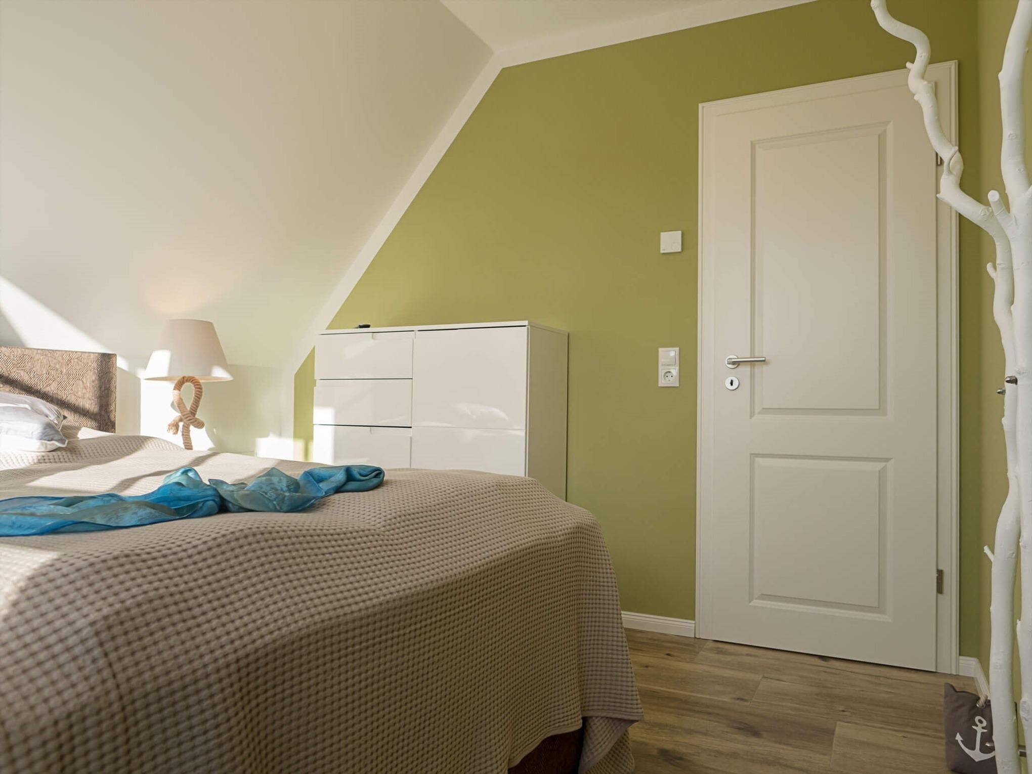 Im Obergeschoss verfügt das Ferienhaus über ein Bad mit Badewanne, Dusche, WC, Handtuchtrockner und Fön sowie drei Schlafzimmer: eines mit Doppelbett (180x200 cm) und TV, ein weiteres mit Boxspringbett (160x200 cm) und TV sowie das dritte mit Boxspringbett (160 x 200 cm) ohne TV.