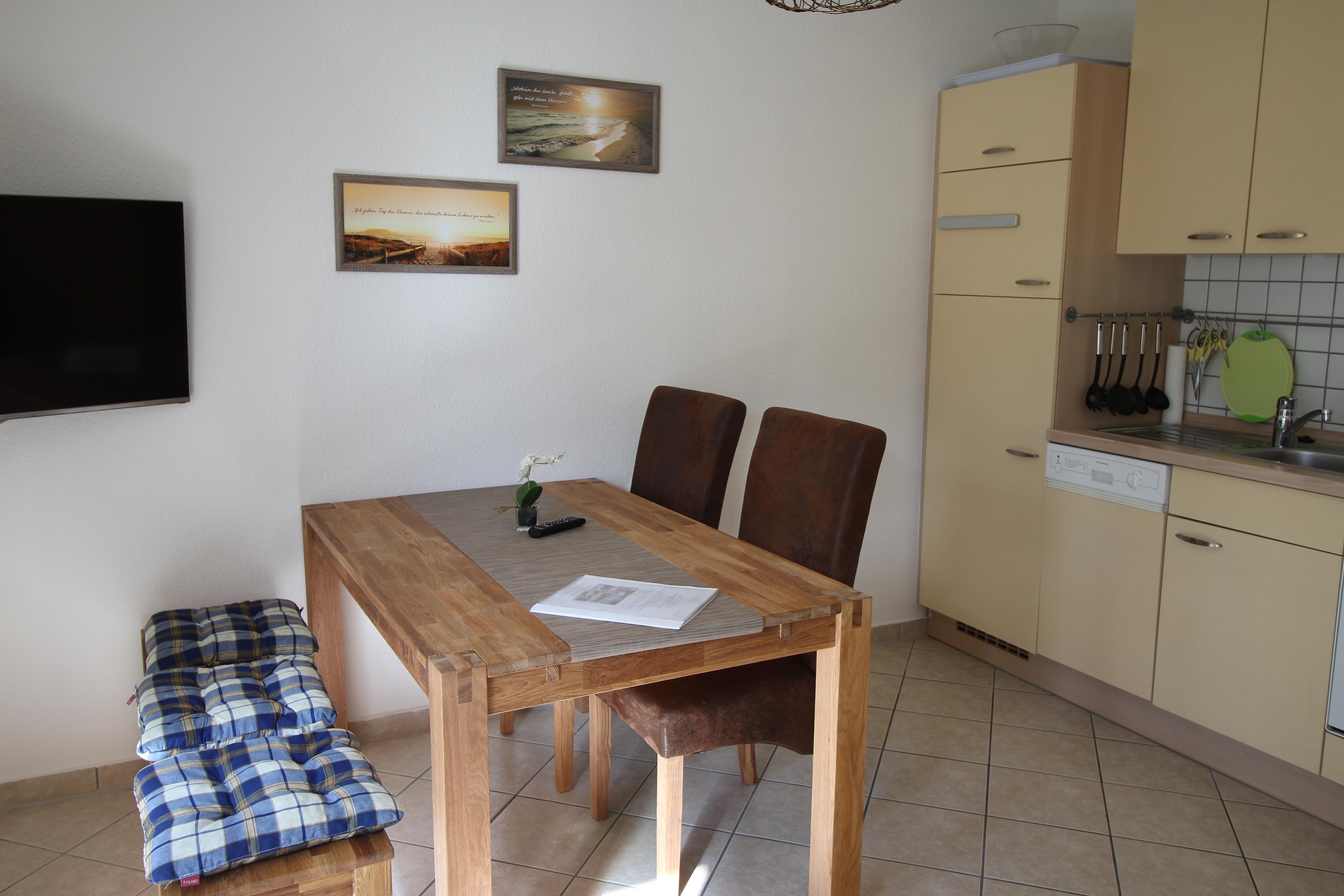 Gemütliche und freundlich eingerichtete ,barrierefreie Terrassenwohnung verfügt über eine gut ausgestattete Küche, ein gemütliches Wohnzimmer mit separatem Essplatz und einem Schlafsofa, TV, ein Elternschlafzimmer mit einem Doppelbett.