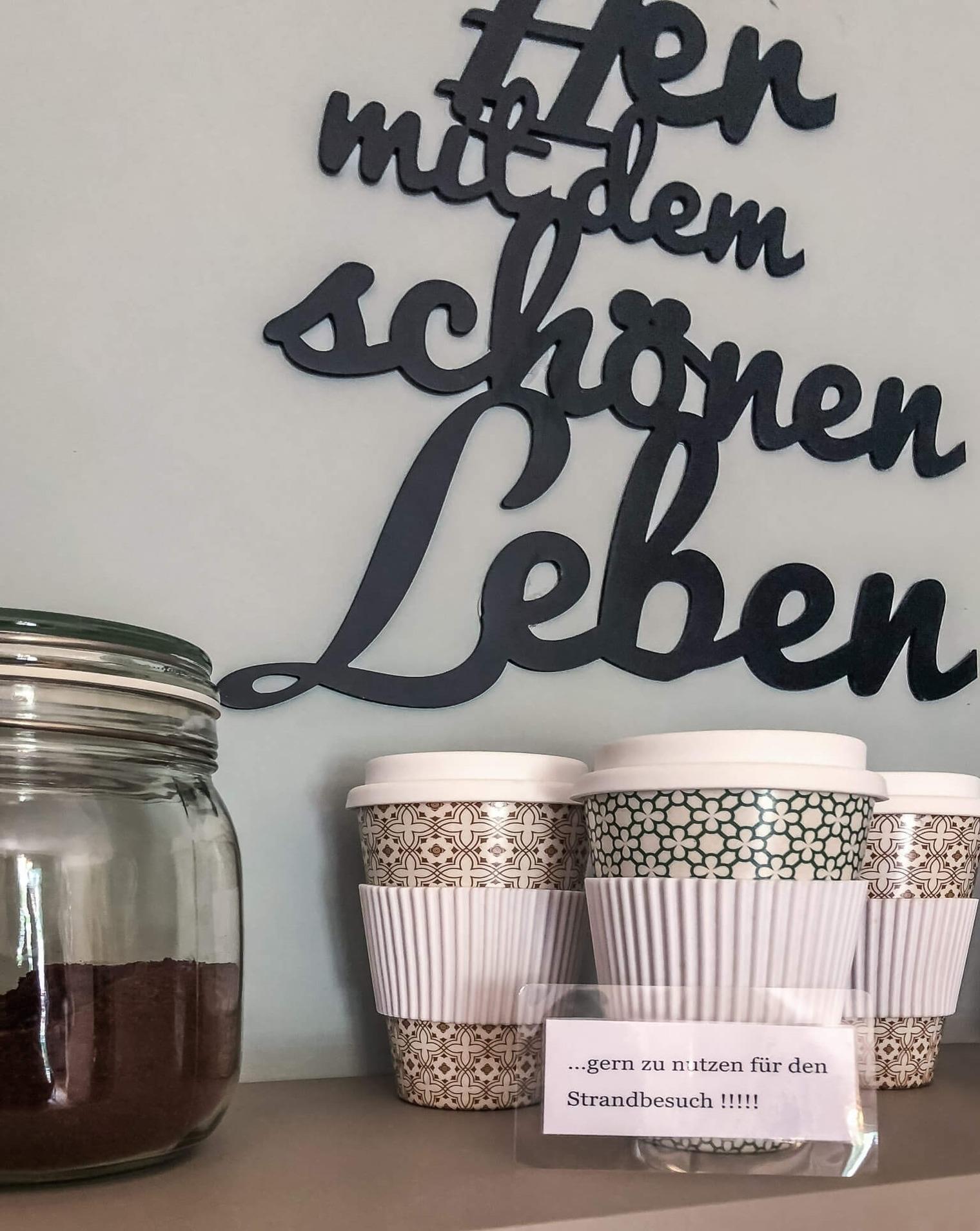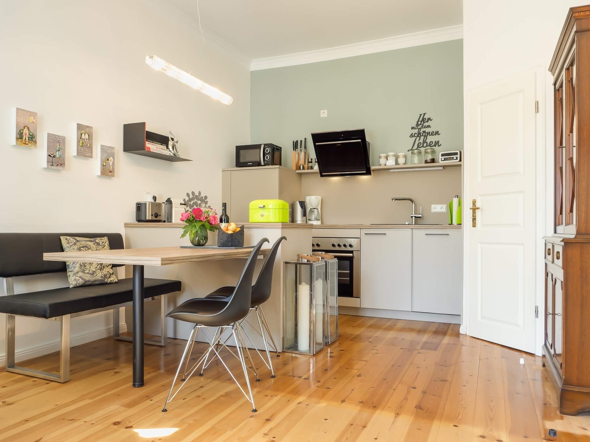 Die gehobene und geschmackvolle Ausstattung der Wohnung sorgt für entspannte Urlaubstage und lässt kaum Wünsche offen. Zur Ausstattung gehören eine Einbauküche mit Bosch Geschirrspüler und Dunstabzugshaube, Gaggenau Kühl- Gefrierkombi, Kaffeemaschine und Nespressomaschine, Toaster, Wasserkocher, Cerankochfeld mit Backofen, Radio und ein Esstisch für 4 Personen. Im angeschlossenen Wohnzimmer erwartet Sie ein gemütliches Sofa samt Kuscheldecke dieses kann bei Bedarf zu einem vollwertigen Bett in Stuhlhöhe mit eigener Kaltschaummatratze verwandelt werden.