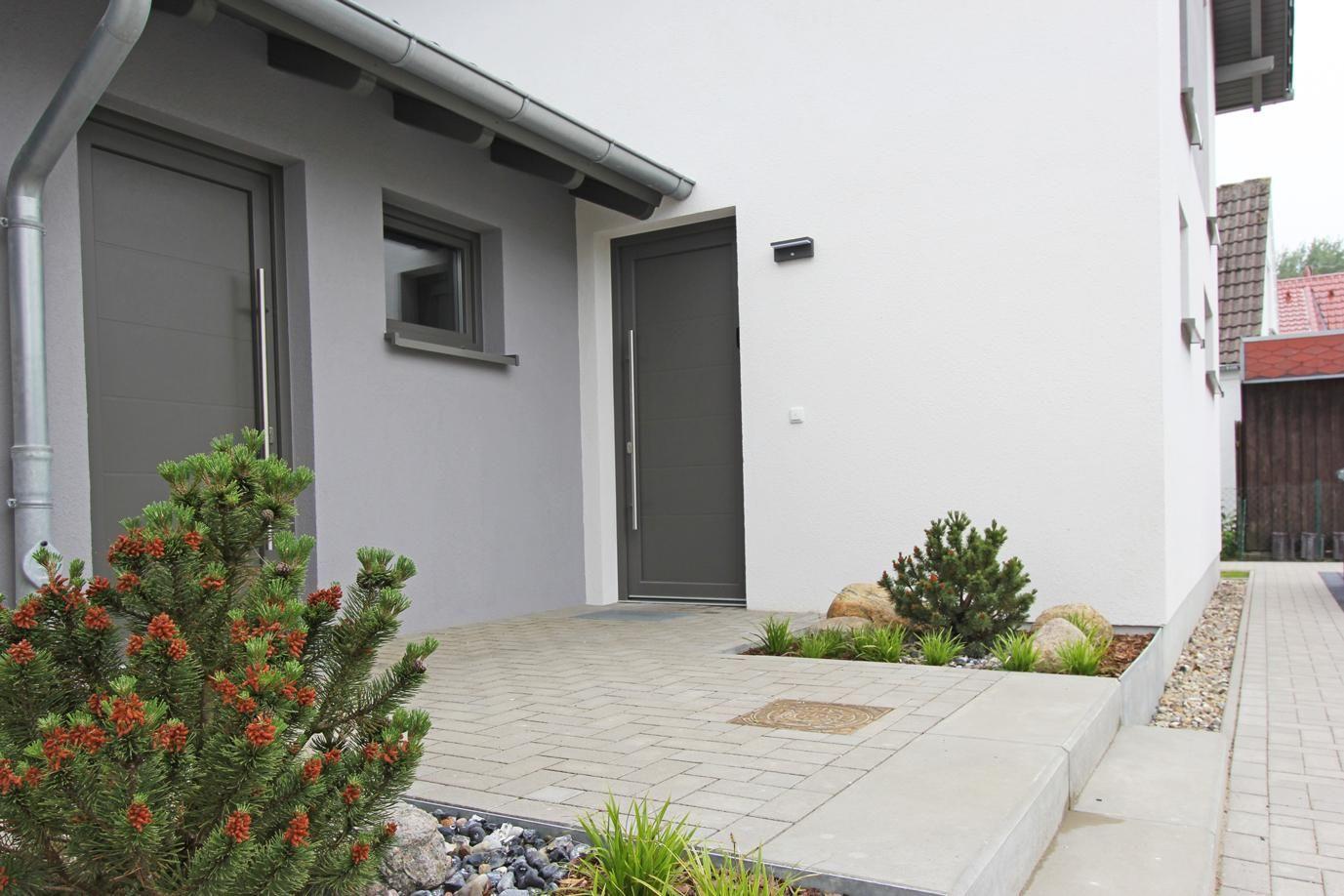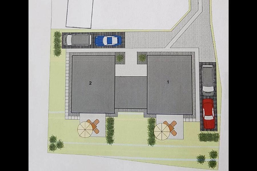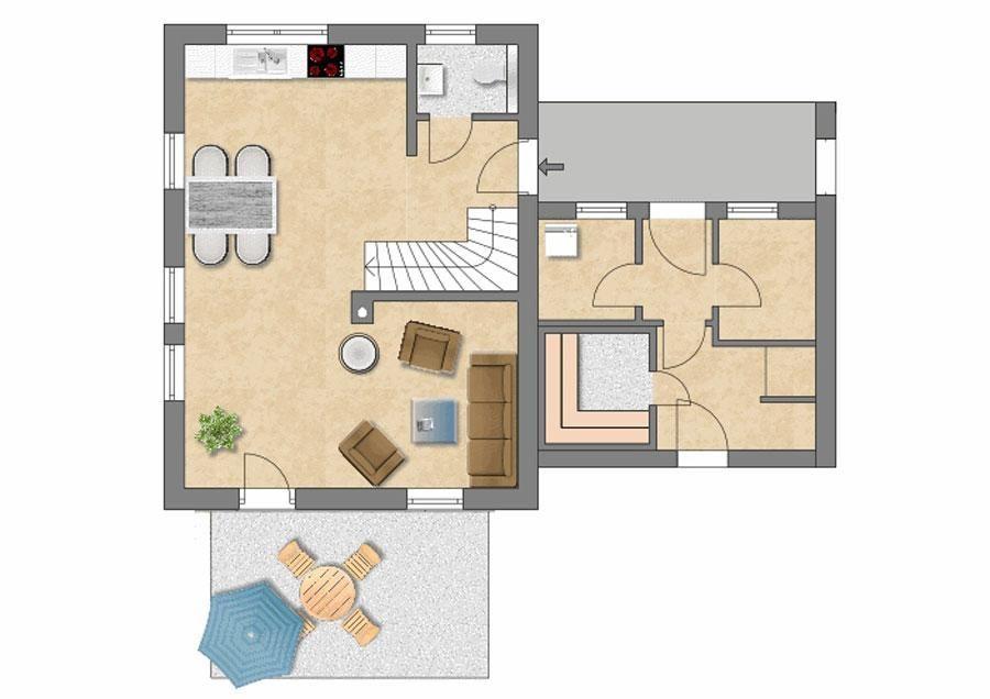 Das Haus verfügt über eine, vom Wohnzimmer aus begehbare, Südterrasse und zwei PKW-Stellplätze.