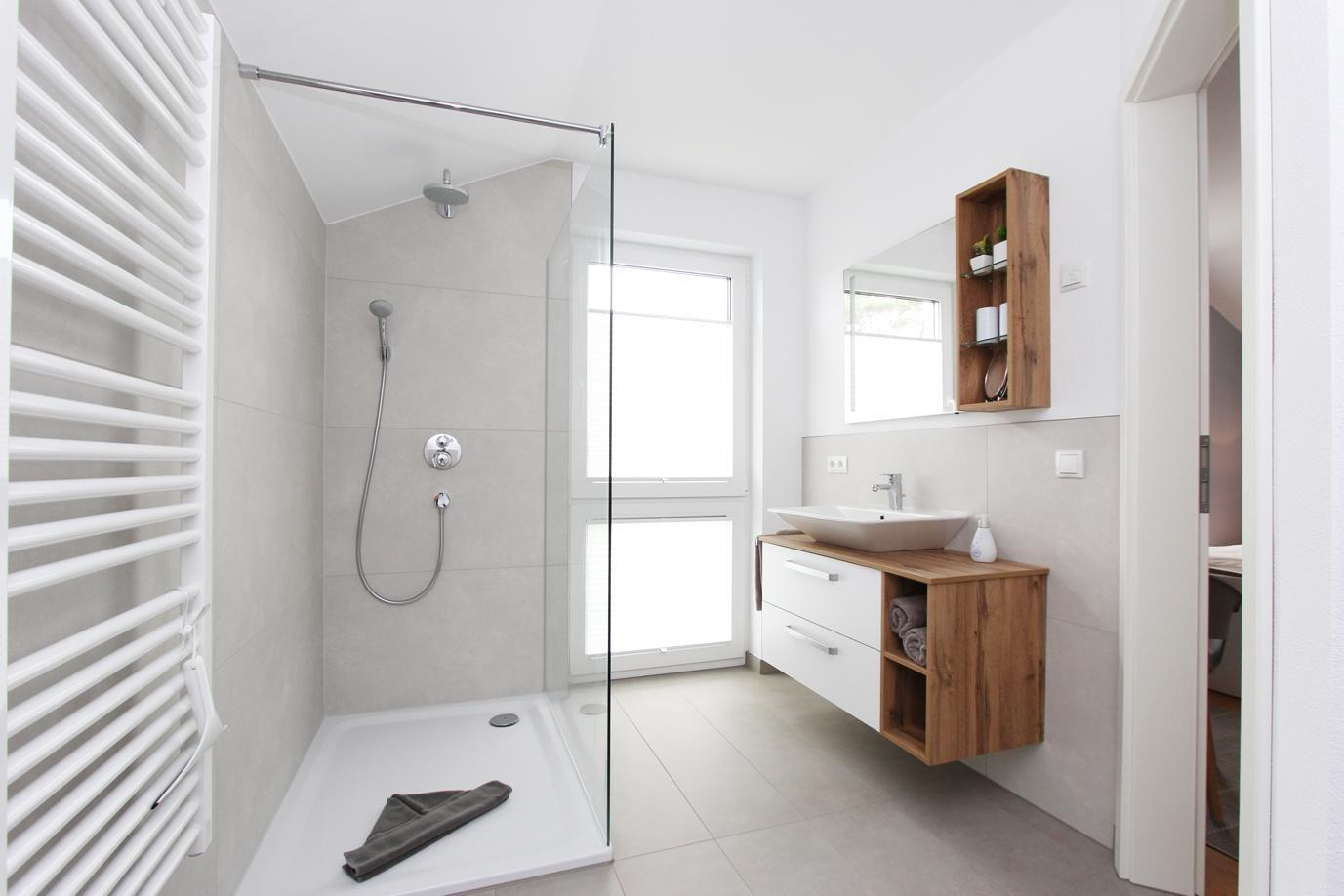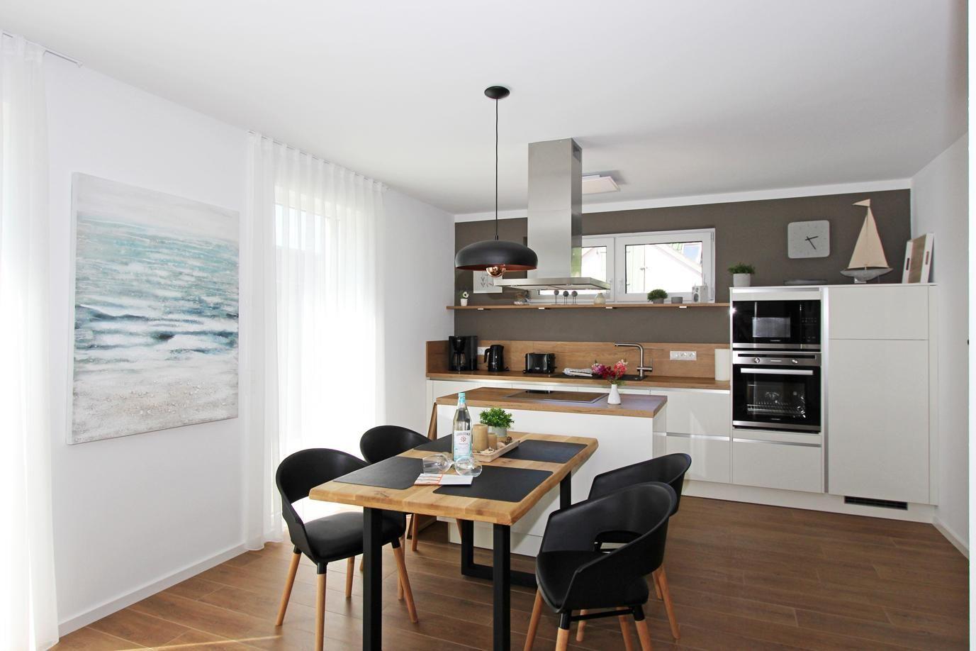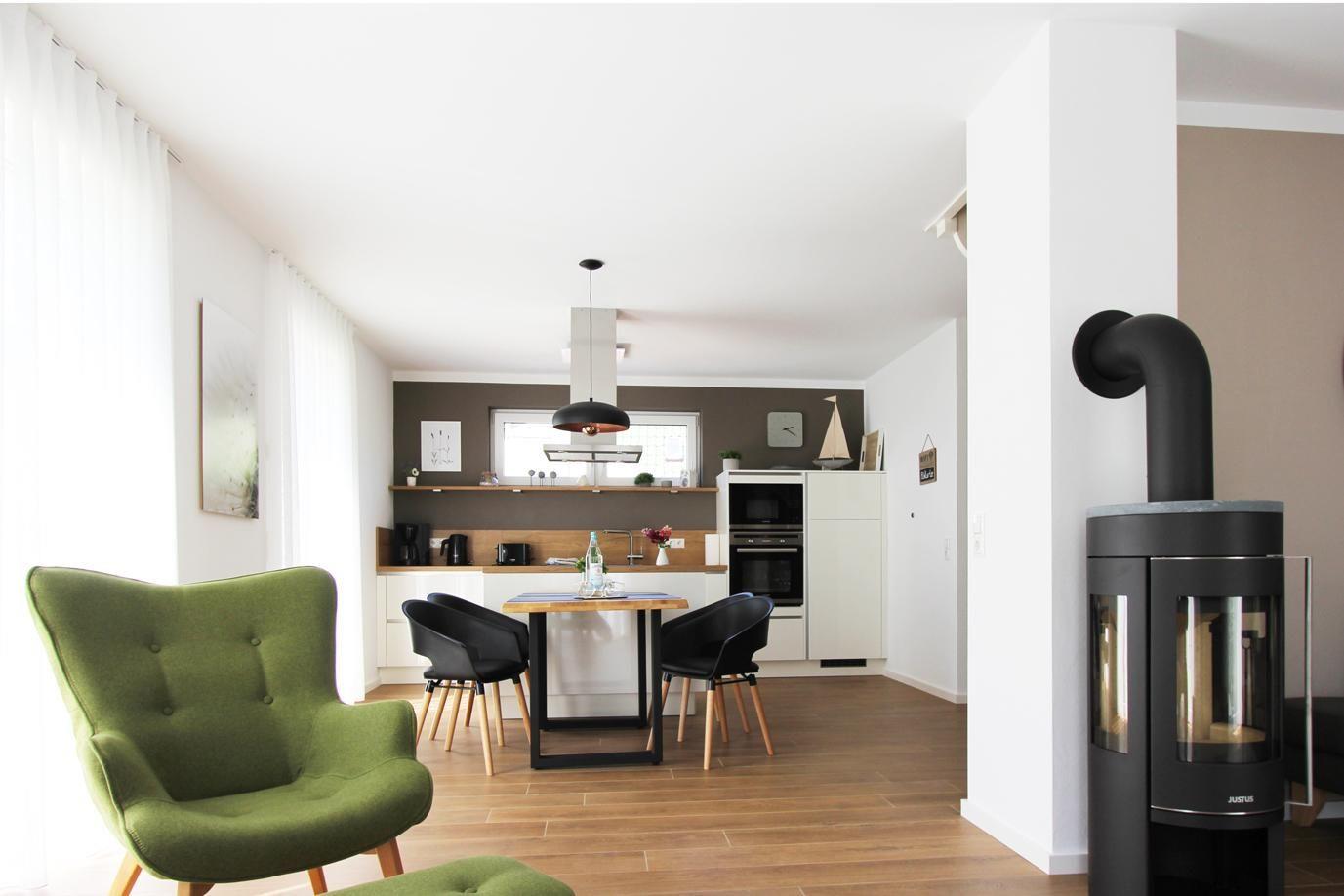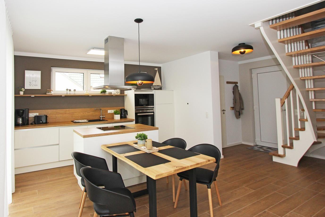 Im Erdgeschoss erwarten Sie ein großzügiges Wohnzimmer mit Kamin und eine offene Küche. Mit einem Cerankochfeld, Backofen, Mikrowelle, Kühl- und Gefrierschrank und einem Geschirrspüler ist die Küche komfortabel ausgestattet. Außerdem befindet sich im Erdgeschoss ein Gäste-WC. Zu jedem der beiden Schlafzimmer im Obergeschoss gehört ein angrenzendes Duschbad mit WC.