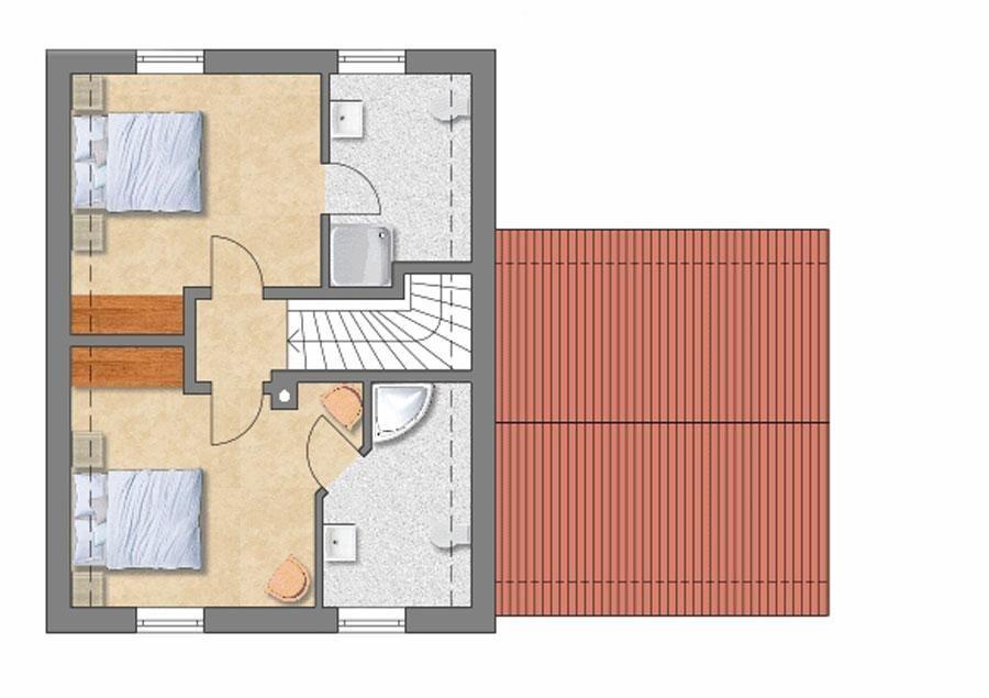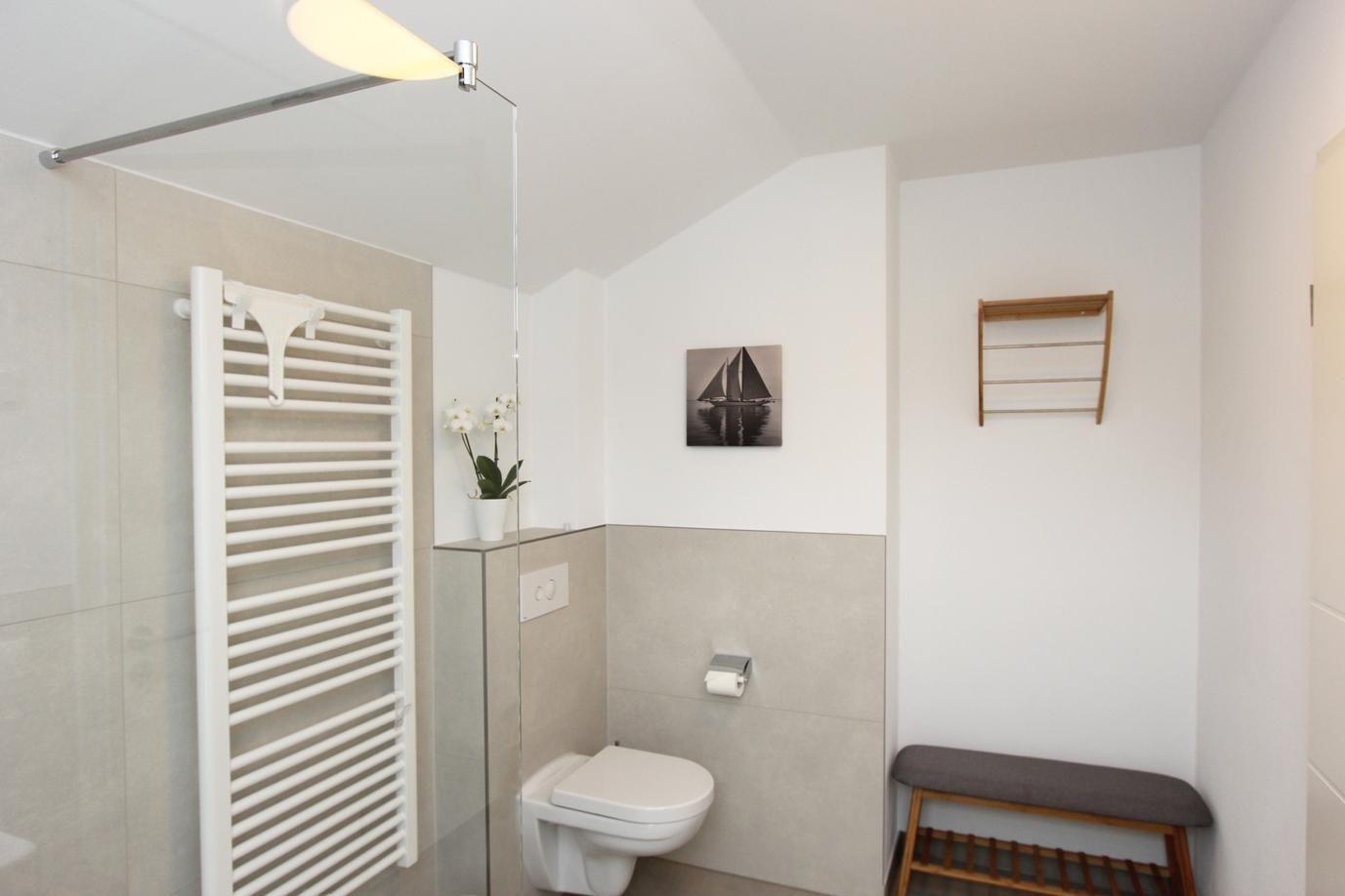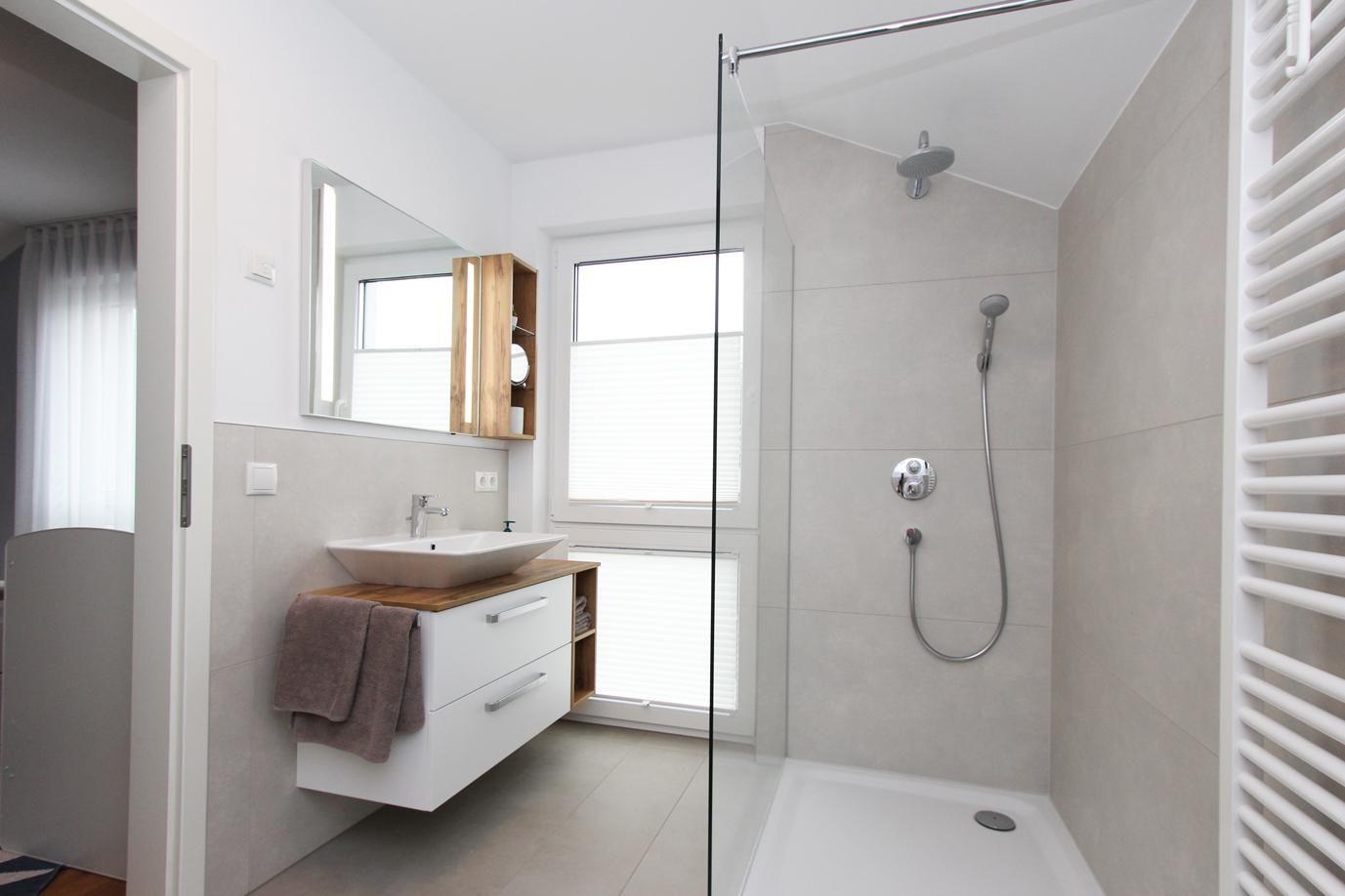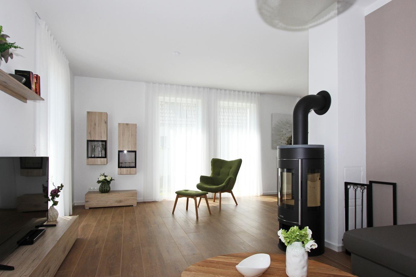 Im Erdgeschoss erwarten Sie ein großzügiges Wohnzimmer mit Kamin und eine offene Küche. Mit einem Cerankochfeld, Backofen, Mikrowelle, Kühl- und Gefrierschrank und einem Geschirrspüler ist die Küche komfortabel ausgestattet. Außerdem befindet sich im Erdgeschoss ein Gäste-WC. Zu jedem der beiden Schlafzimmer im Obergeschoss gehört ein angrenzendes Duschbad mit WC.