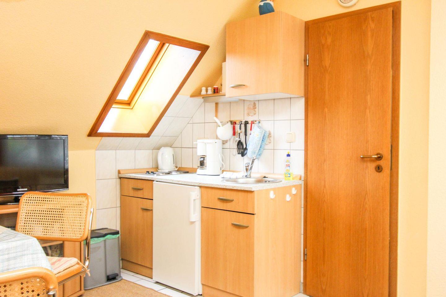 Sie hat einen hellen und gemütlich eingerichteten Wohn- und Essbereich mit offener und gut ausgestatteter Küchenzeile.