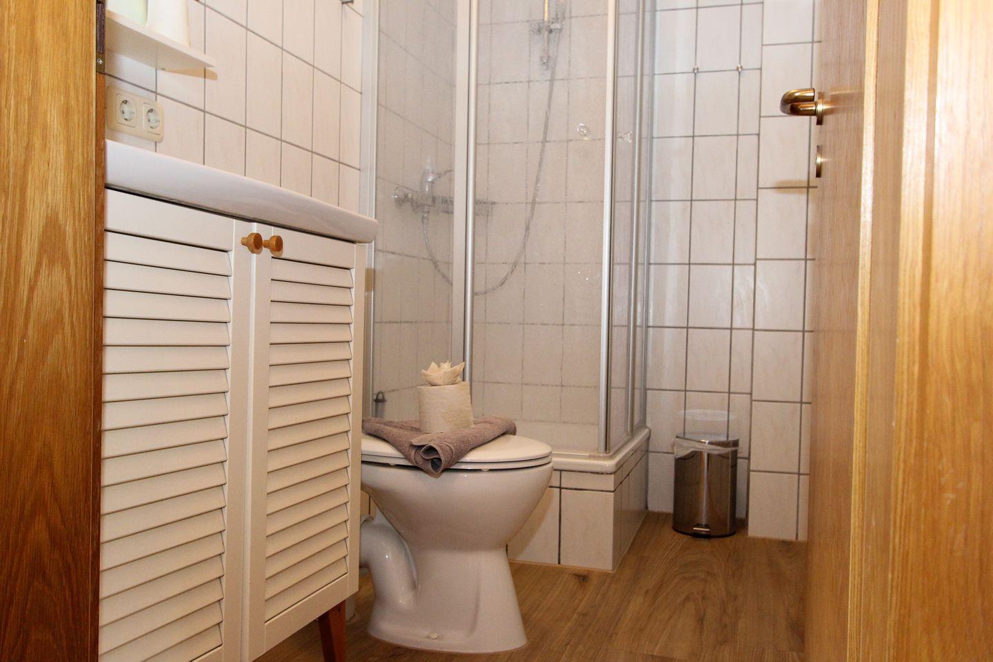Das Badezimmer mit Dusche und ein geräumiges und ruhiges Schlafzimmer runden diese komfortable Ferienwohnung ab.