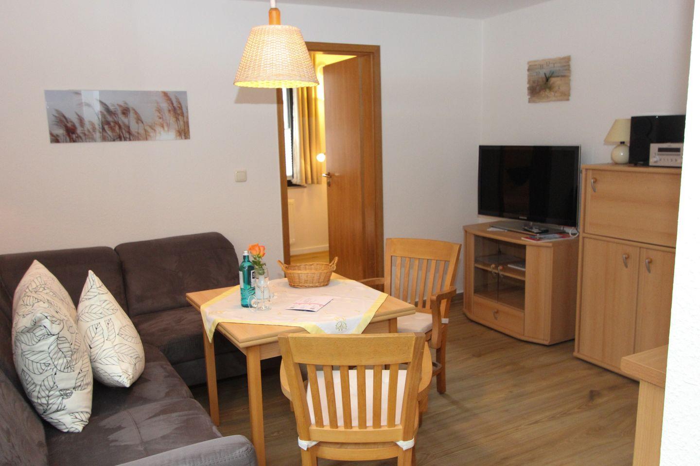 Sie hat einen hellen und gemütlich eingerichteten Wohn- und Essbereich mit offener und gut ausgestatteter Küchenzeile.