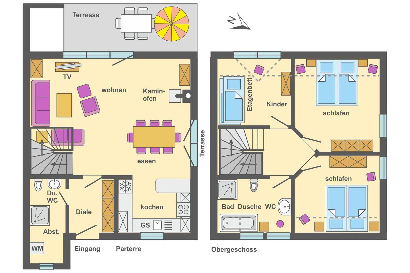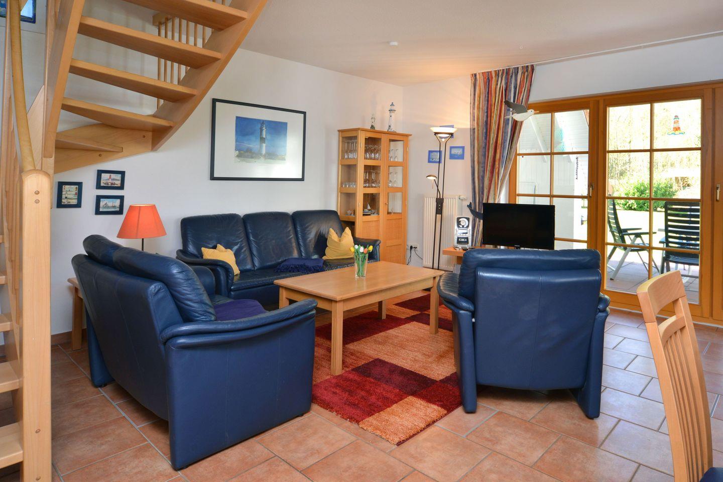 Im Erdgeschoss erwartet Sie ein einladender Wohnbereich mit gemütlicher Sitzgruppe, Flachbild-TV, DVD-Player und Kamin, der an kühleren Tagen für eine wohlige Atmosphäre sorgt. Am großen Esstisch können bis zu sechs Personen gemeinsam essen oder spielen. Die angrenzende Küche ist komplett ausgestattet mit Herd, Backofen, Mikrowelle, Kühlschrank mit Gefrierfach, Dunstabzugshaube und Geschirrspüler – ideal für einen flexiblen Aufenthalt.